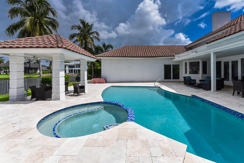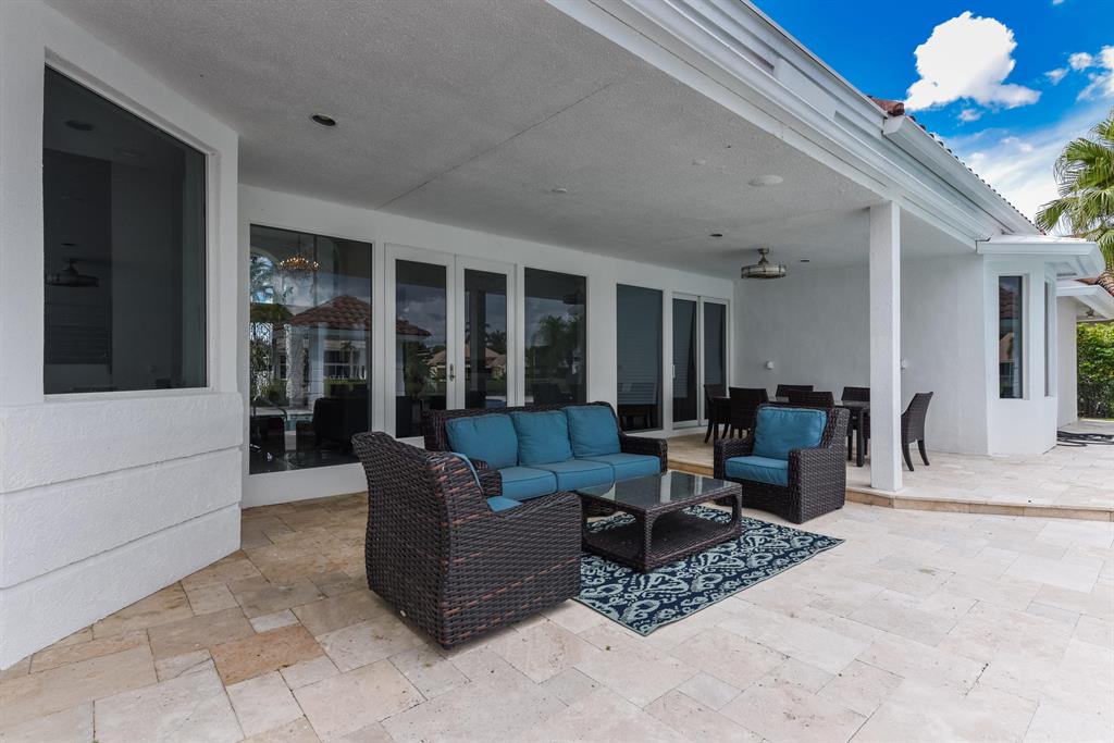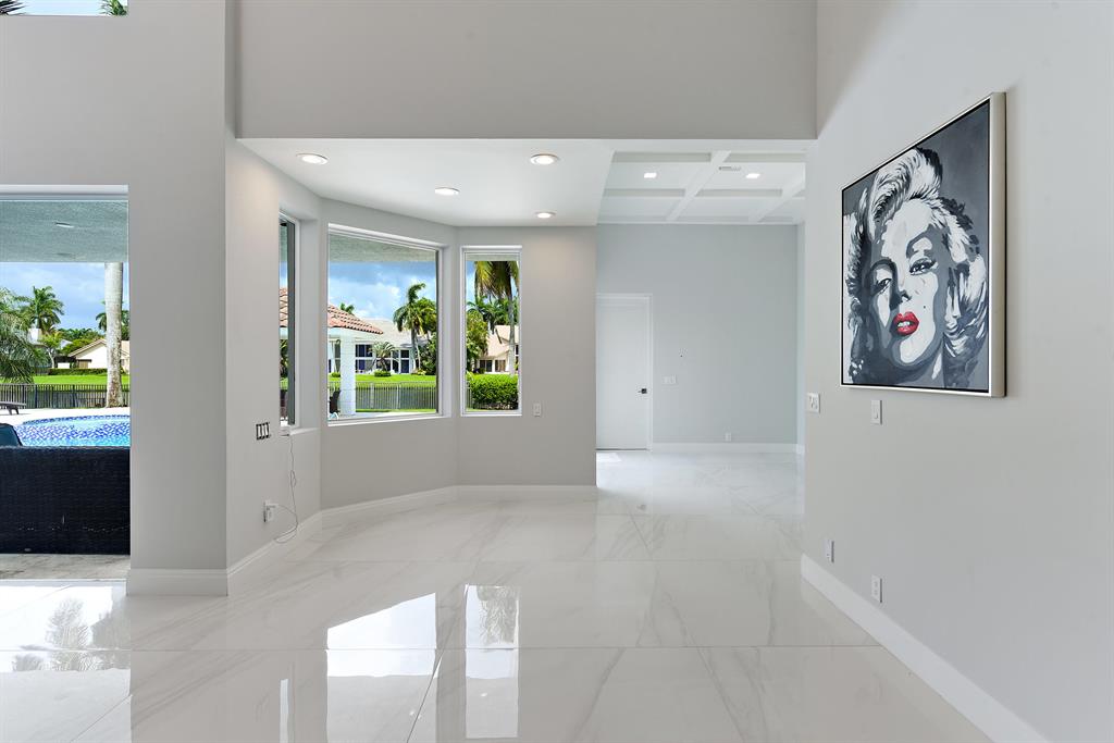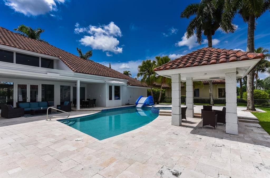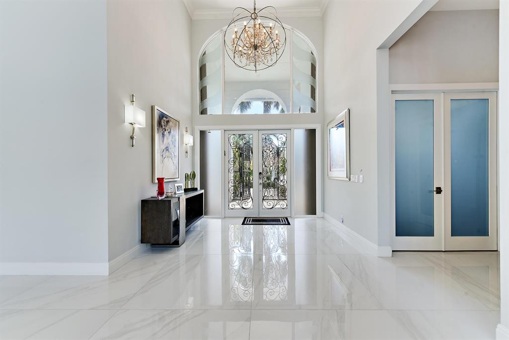 Situated on beautiful 1/2 acre lake lot and totally renovated this elegant 5 bedroom, 6.1 baths residence with 5,950 sq ft of living area features a spectacular main living area, soaring ceilings and 48 x 48 porcelain floors. A gourmet chef's kitchen includes state of the art appliances, quartz counters and a large center island. The master wing features a master suite with sitting area, his and her marble baths and generously sized and outfitted closets. Also located on the main floor are a handsome wood paneled office, a large media room and 2 guest suites. Two additional guest suites are located upstairs.Outdoors the lushly landscaped property features a dramatic resort style pool. Other features include hurricane resistant glass, and 4 car plus golf cart garage. The information