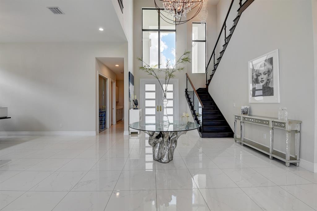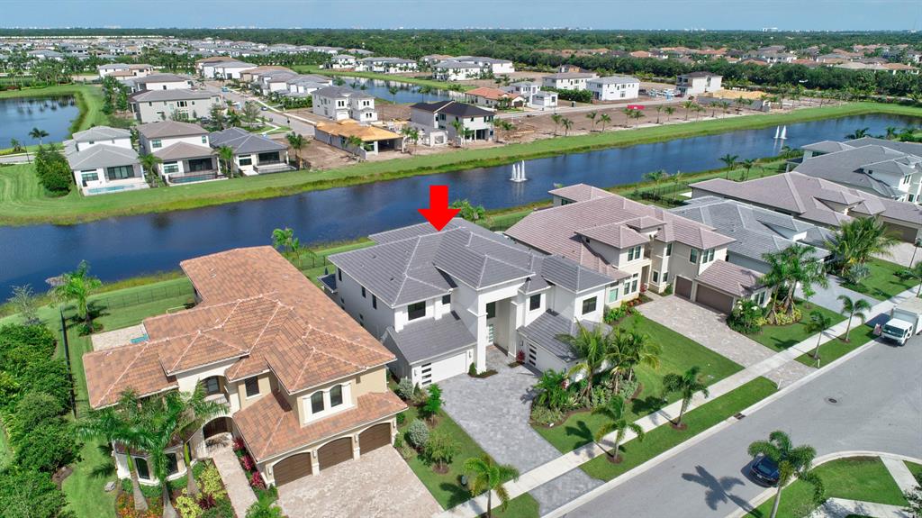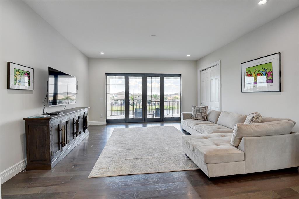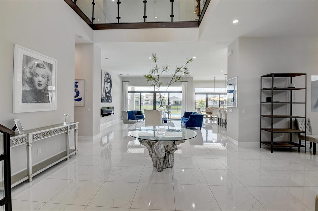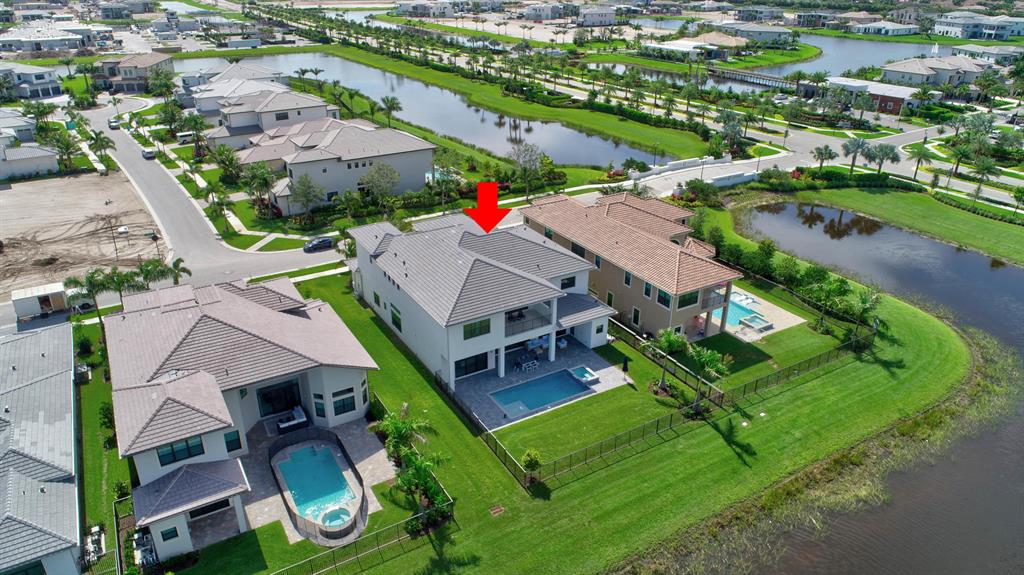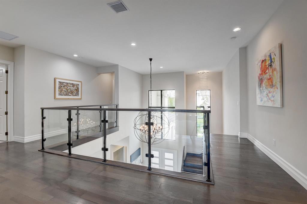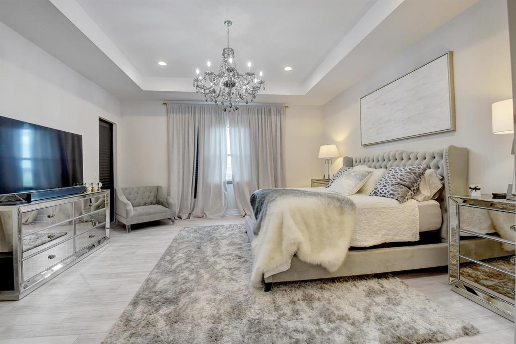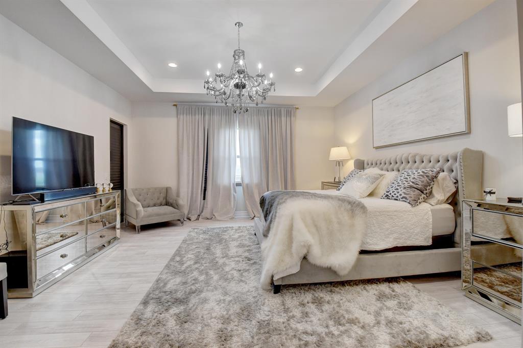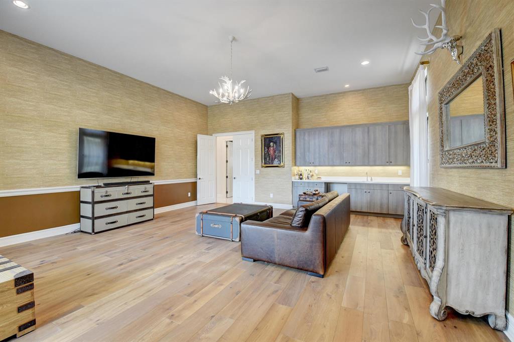 Contemporary RIVERSIDE floorplan with design and finishes by Restoration Hardware. The home overlooks the pool and lake with an east facing backyard. Stunning 2-story foyer. 5 bedrooms, 6.1 baths. Club Room with wet bar with grass cloth covered walls, a private retreat & the loft provide additional living areas. LED fireplace in the great room. Beautiful window treatments. 4-car garage with a fully equipped gym in the air conditioned portion. Porcelain tile in the main living area. Stunning wide-plank genuine wood flooring on the staircase, club room and upstairs bedrooms. Top of the line name brand kitchen appliances; 5 burner gas range. The most up to date warm gold fixtures on the kitchen cabinetry. Heated pool and spa. The side easement adds additional grassy area.