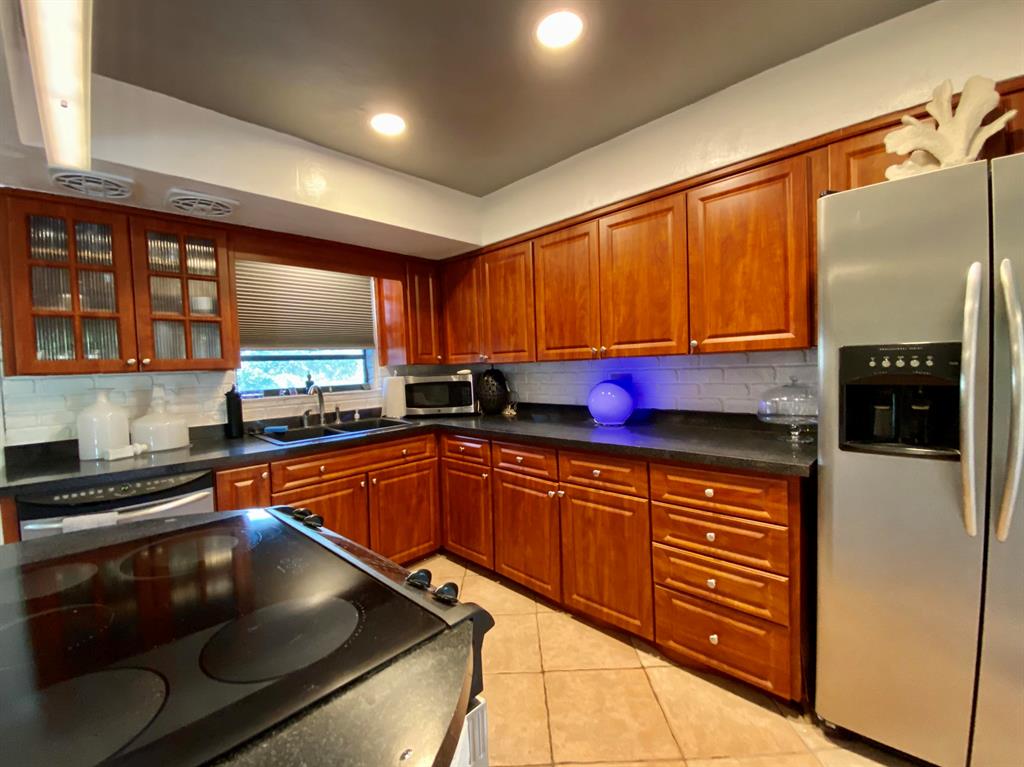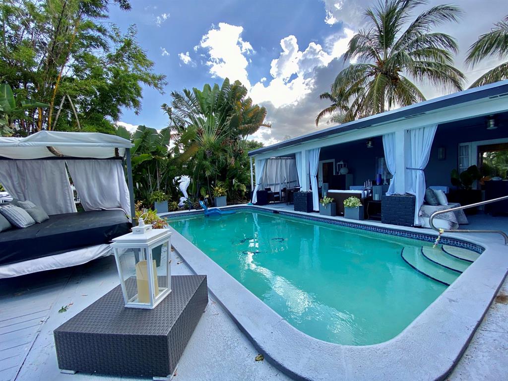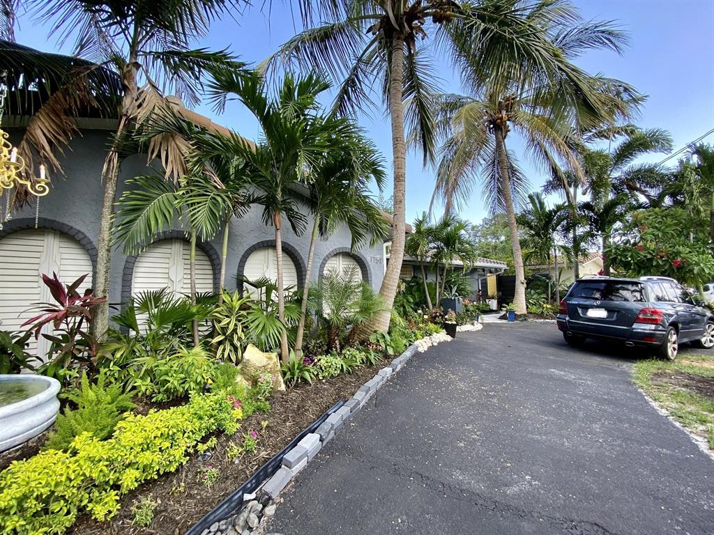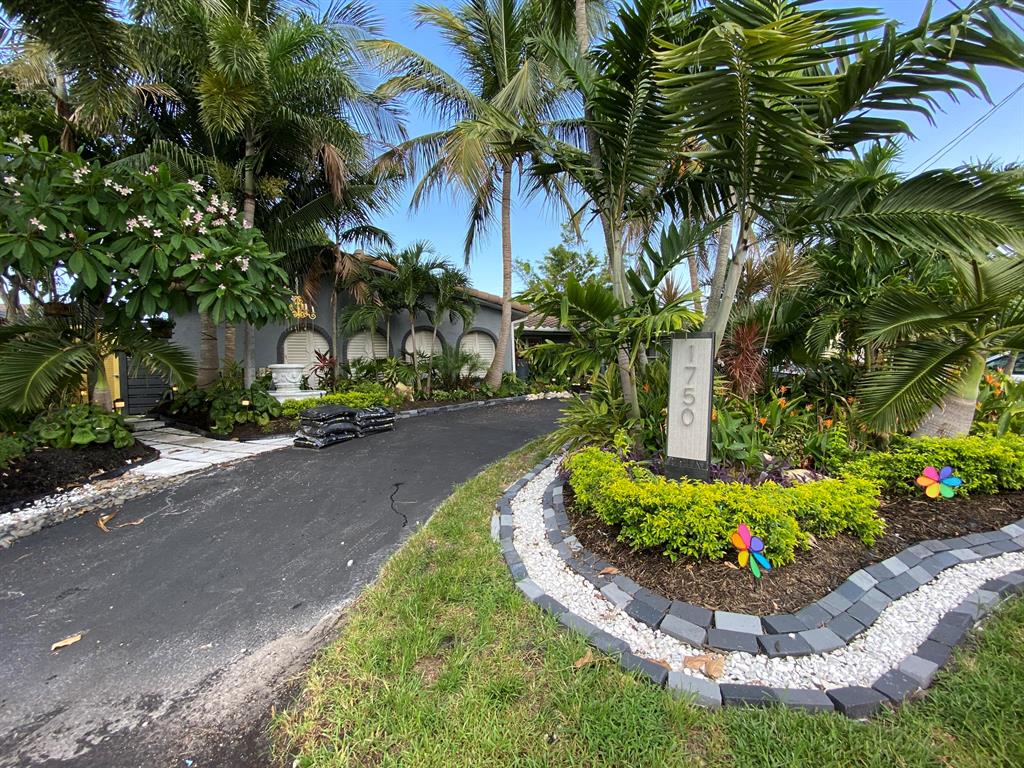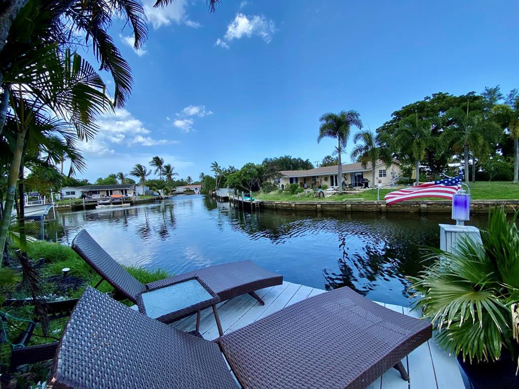 Tranquil waterfront home on quiet cul de sac street! Lush tropical landscaping greets you at the circular driveway. Large covered patio and open deck perfect for entertaining poolside. Split bedroom floor plan, master has updated bath and patio access. Open kitchen with island, inside laundry room with utility sink, updated guest bath w/ dual sink vanity, guest bed has patio access. New electrical panels, newly serviced 3-ton AC, roof 2011. Bring your boat! 3 fixed bridges to intracoastal! No HOA!