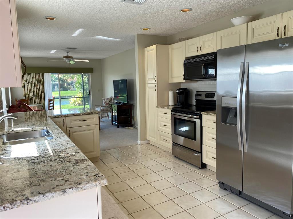 Beautifully updated and freshly painted 3BR/2BA Spanish Mediterranean Aspen model lakefront home in a gated community. Split Bedroom floorplan, new carpeting and vaulted ceilings. Remodeled kitchen features wood cabinets, granite countertops and stainless appliances. Master bdrm with walk-in closet. Master BA w/skylight, dual vanity sinks, Roman tub & separate shower stall. Screened enclosed patio overlooks the lake. Partially fenced yard. 2 car garage parking. Accordion hurricane shutters thru-out. Central HVAC. Community clubhouse with social & fitness rooms, main pool, hot tub, satellite pool, tennis, basketball & walking trail. Hotwire HDTV/Internet included. Exterior house/driveway painting every 7 yrs. Close to major transportation, shopping, restaurants and the Florida's Turnpike.