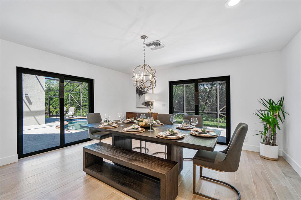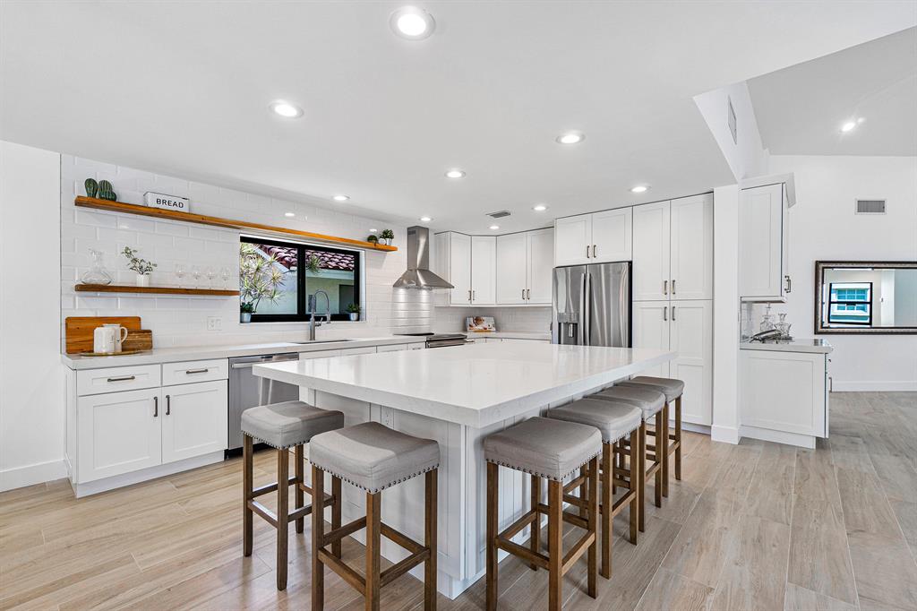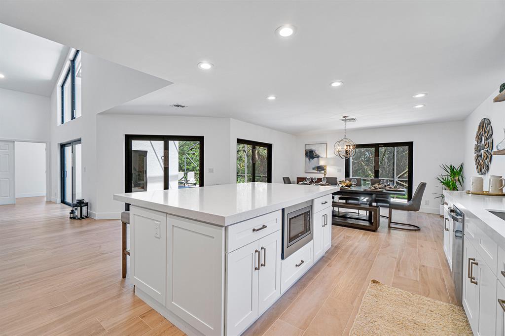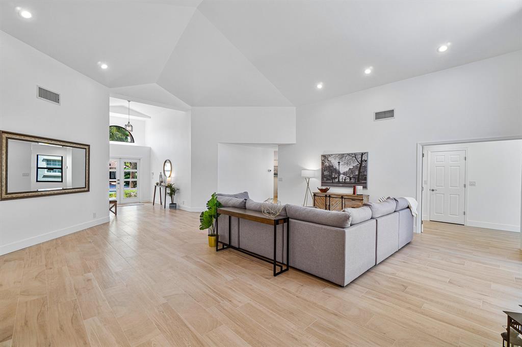 Situated on nearly a quarter of an acre in the small gated community of La Joya. This single family pool home boasts over 2,650 square feet of all new high end finishes throughout including NEW IMPACT GLASS windows and doors. Volume ceilings and expansive great room greet you as you enter through the modern double door entry. Ideal for entertaining, the massive island allows seating for up to six and guests can enjoy a private guest suite on the East wing of the home. The open concept kitchen features white shaker cabinetry, oversized beveled subway tile backsplash with cedar open shelving, large island topped with quartz countertops and trimmed with matte gold fixtures. Premium SS appliances package including wine cooler, double oven, microwave, refrigerator and washer and dryer.