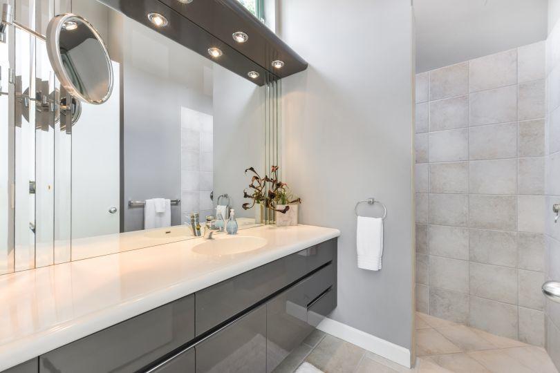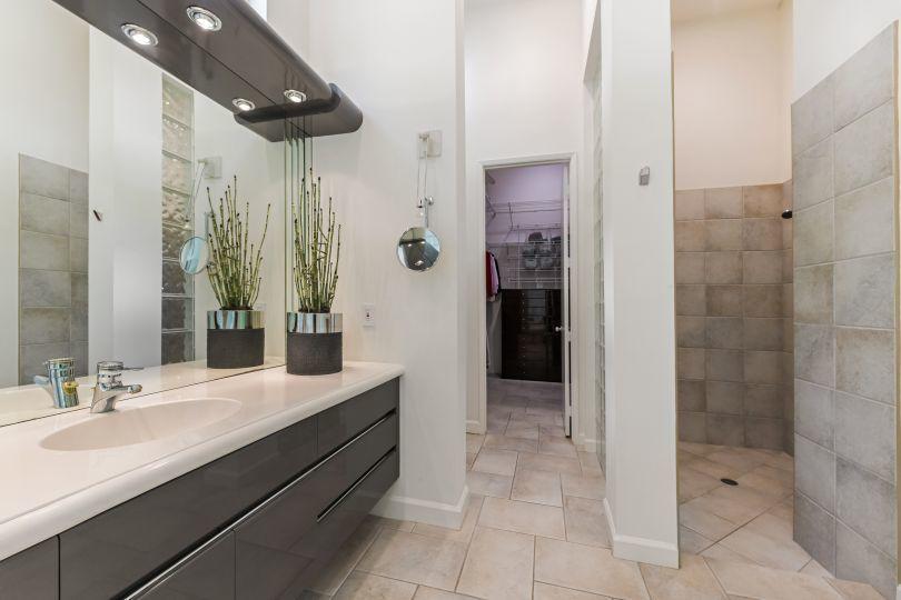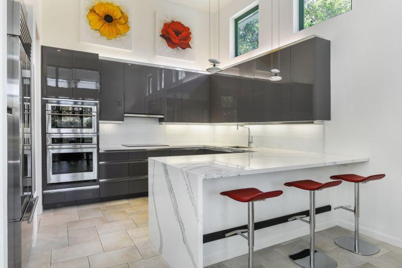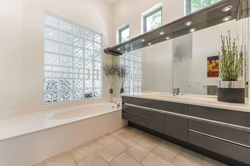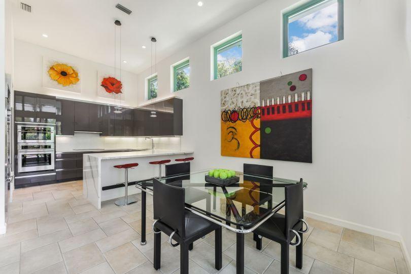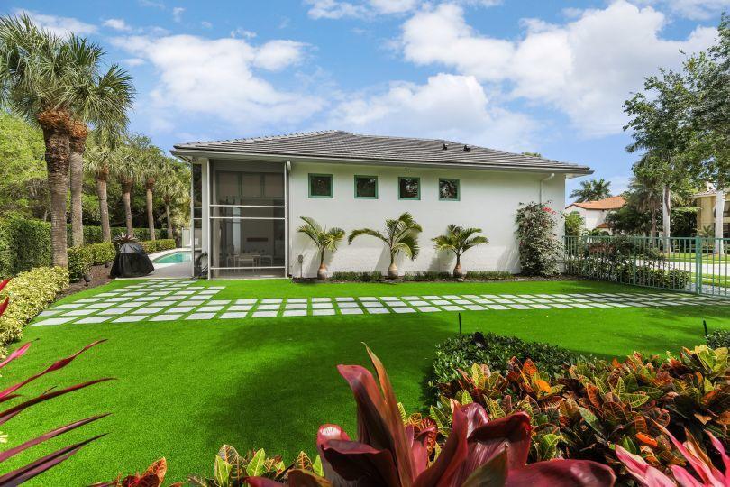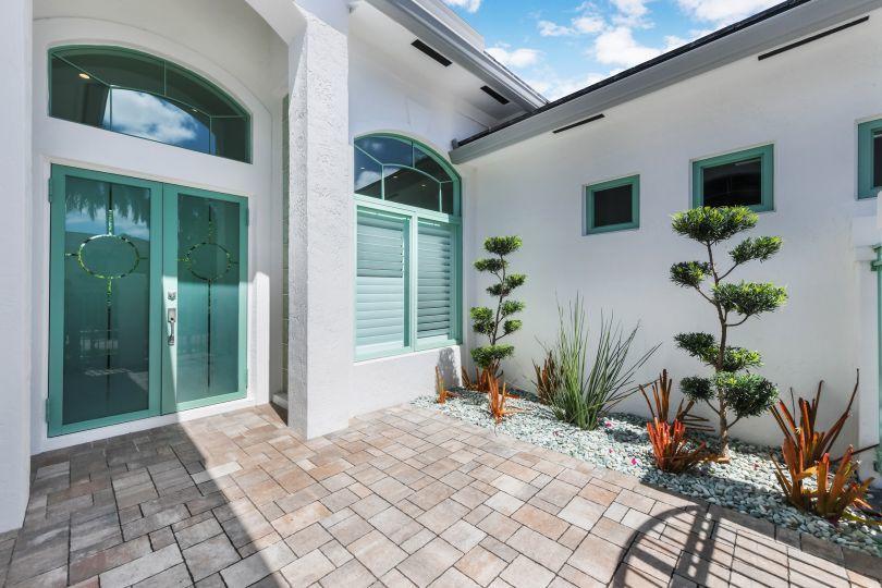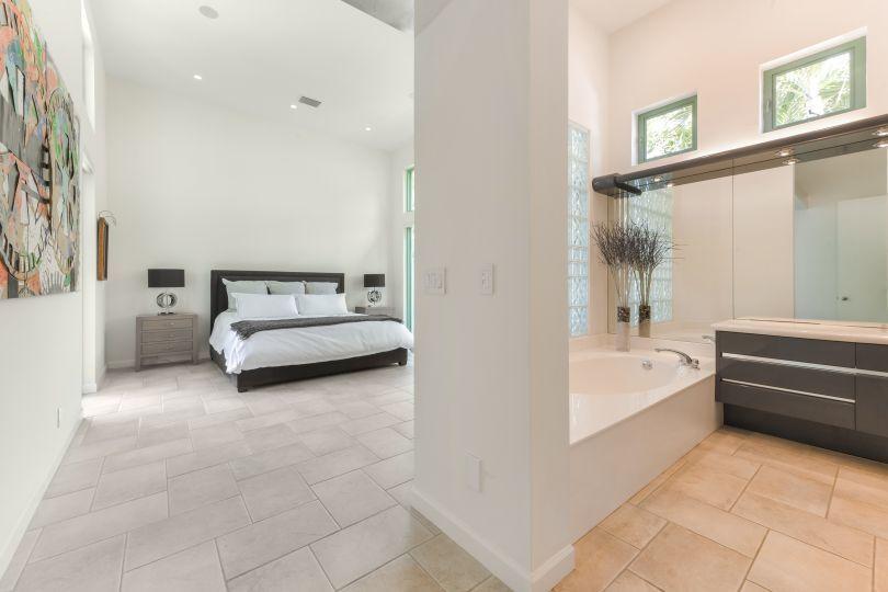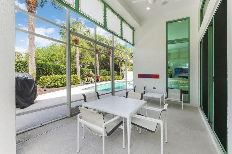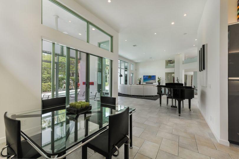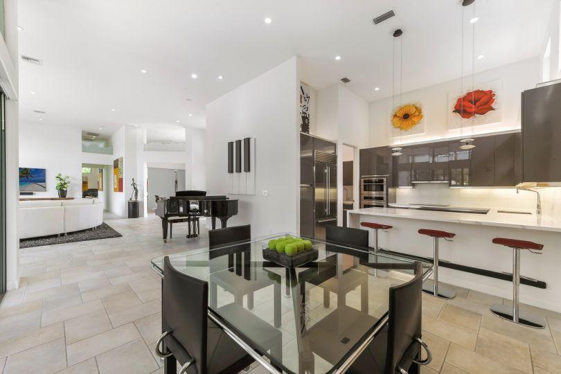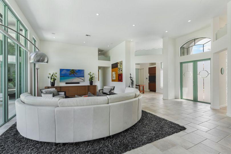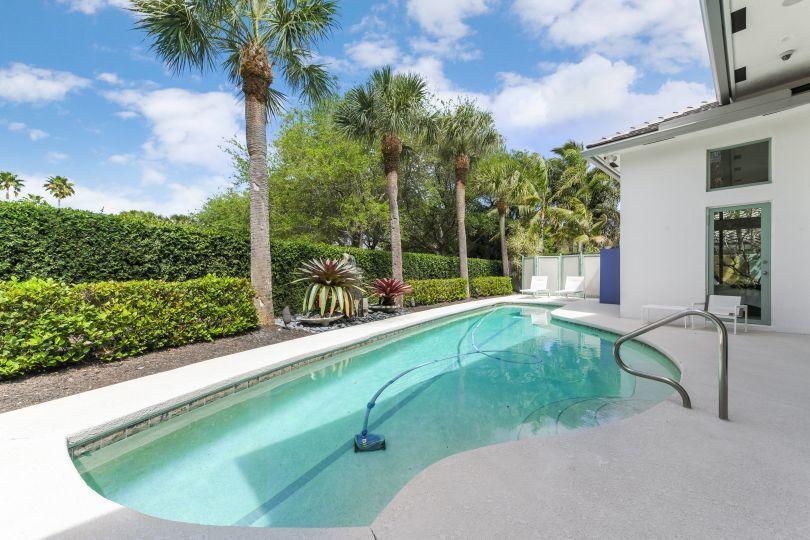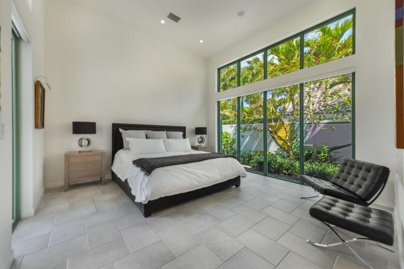 Absolutely stunning modern home in Boca East Estates! Come inside through the gated entryway and be greeted by soaring 15 foot ceilings throughout this lovely home! The spacious living areas offer tons of natural light through the impact glass windows, along with gorgeous flooring, glass incorporated into the walls, and an inviting kitchen which boasts quartz countertops, a sub zero fridge and double wall oven. This home offers 2 master suites complete with luxurious bathrooms along with a 3rd bedroom which is currently used as an office with a perfectly concealed Murphy bed. Step outside and enjoy a great, covered patio overlooking the heated, saltwater pool and tons of lush landscaping, along with a hot outdoor shower and gorgeous water feature. The backyard is extremely private as