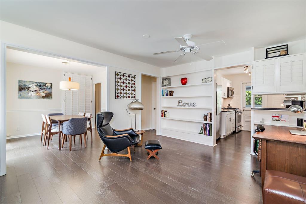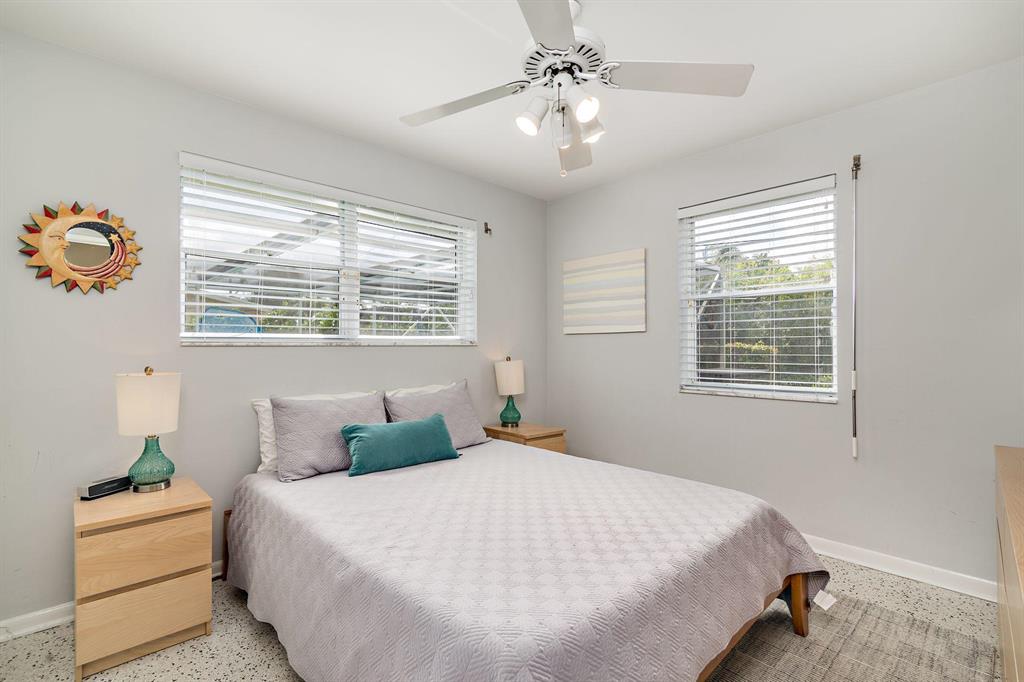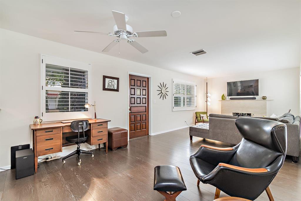 Sparkling Southend Mid-Century, east of Olive pool home! Immaculate & shining, this beautifully appointed 2BR/2BTH, features new wide plank engineered wood floors presenting a cohesive look to enhance the open design and flows to the kitchen with Corian countertops, tile backsplash, gas range & microwave. The living room is spacious with large windows, fireplace & adjacent to the dining room with French doors leading to the pristine freeform pool resurfaced in 2019 & screened for comfort. Recently updated baths are fresh & beautifully designed. The bedrooms have original terrazzo floors in remarkable condition & all closets have been custom fit with plantation shutters for maximum storage. Laundry room, carport, back yard with orchid structure & plenty of room complete this magical home.