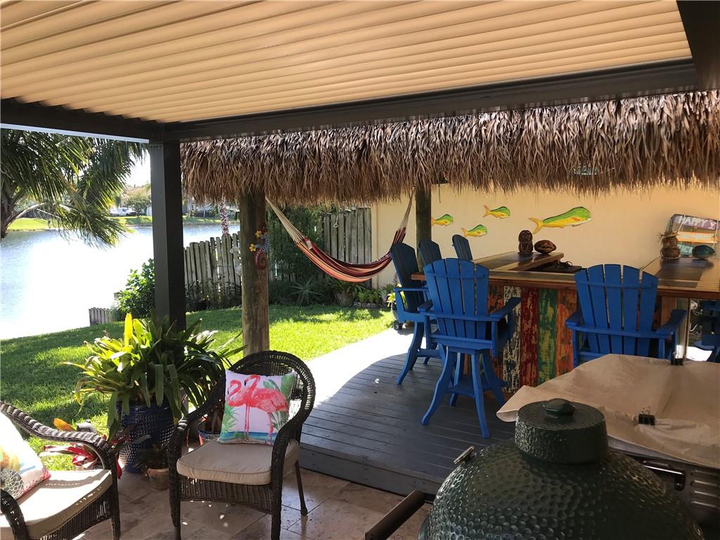 Lovely updated 3/3 in sought after Rock Creek located on private Cul-de-sac, One of a kind lake front lot with expansive park views! Take in the stunning vistas from your own Tiki Hut w/Custom Bar that seats 8 or enjoy the view from the electronic louvered roof covered travertine patio. This home embraces the outdoors. Hurricane PGT impact windows throughout, insulated hurricane garage door and generator prepped electrical panel. Updated Kitchen w/stainless steel appliances, granite counter tops and split face travertine backsplash. Porcelain tile throughout living area and wood laminate in bedrooms. Closets have custom built-ins and crown molding in all bedrooms. All bathrooms updated! Huge driveway 6+cars, central vac, lake fed sprinkler system. New washer/dryer, A-rated schools!