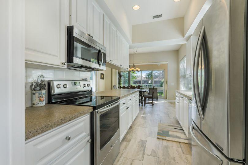 Look no further! This home has it all. Wonderful DiVosta built, lakefront home in Riverwalk, a luxurious, waterfront, gated community! Step inside and be wowed by soaring volume ceilings, spacious living areas and an open floor plan with lots of natural light! There is wood-look tile throughout, and a custom-designed wall unit with room to display your treasures and an electric fireplace to keep you cozy on cool evenings. The bedrooms are also spacious and the master suite offers a luxurious master bathroom. The kitchen boasts newer stainless steel appliances. This lovely home also offers a large laundry room with lots of storage space. Step outside & enjoy tropical landscaping and expansive lake views! Live the resort lifestyle with 3 resort style pools, a newly updated fitness center
