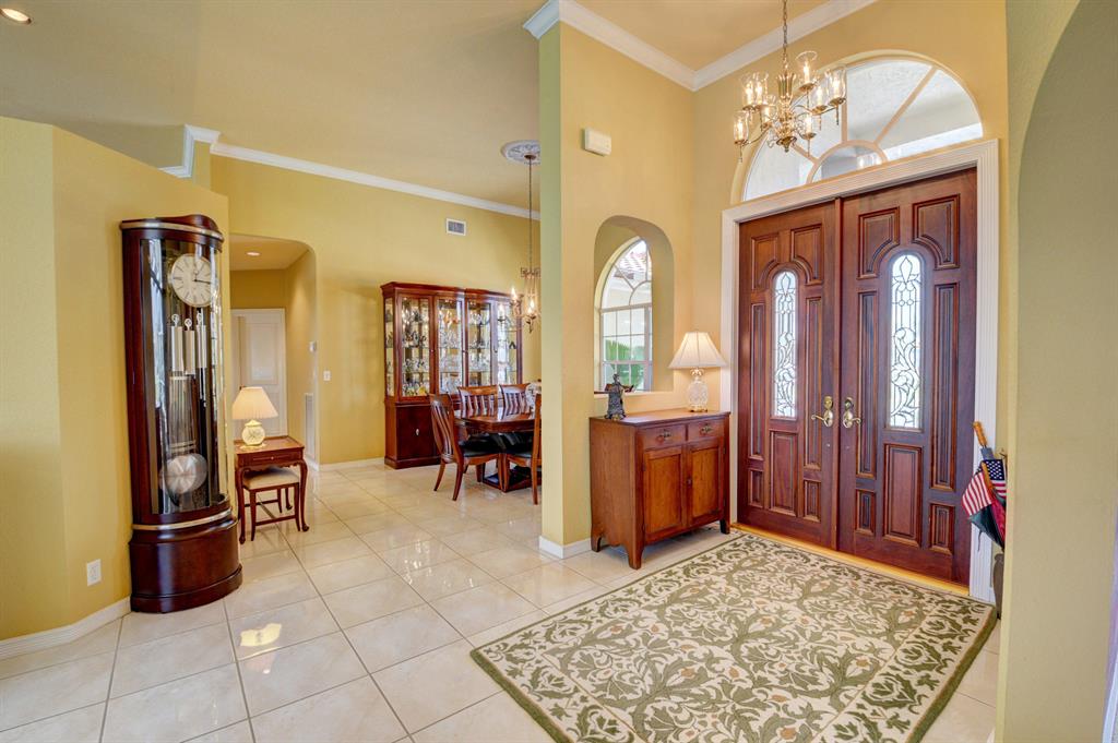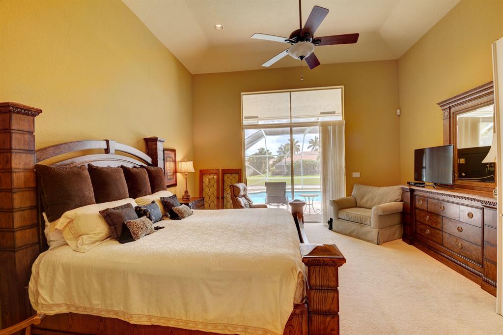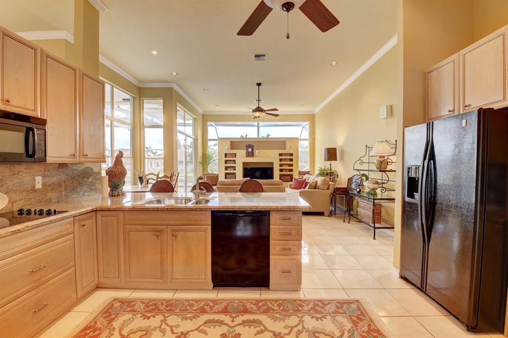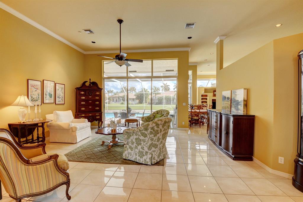 GOLF LEVEL MEMBERSHIP & EQUITY REQUIRED. Lovely, truly move-in ready custom home in Stonebridge Country Club. The exterior of the home is impressive with a decorative circular driveway, 2 bay garage plus golf cart garage, nicely landscaped rock gardens, freshly painted neutral tones, and a newer roof (2017, per PBC permits), two AC's replaced, one in 2014 and the other in 2016. Upon entering the home, you have perfect, unobstructed views to the screened lanai, pool, and golf course beyond. Neutral tile in living areas, kitchen and baths. Carpeted bedrooms provide softness on bare feet. Ample recessed lighting, crown mouldings throughout, ceiling fans, and traditional lighting and finishes make this home so easy to love! The renovated kitchen has light woodtone cabinets,(MORE)
