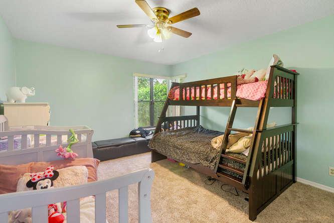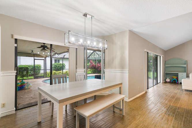 This home has beautiful vaulted ceilings, with a guest suite with a full bathroom in it!! The living room, kitchen, family room, and master bedroom have a beautiful view to the pool. The pool is screened in with nice pavers around it and faces a canal where you can fish. Spacious backyard with a big tree. Great school districts. Low HOA fees. Great neighborhood. Accordion shutters throughout, separate laundry room inside the house with plenty of storage. Wainescotting in the dinning room. All measurements and informations are estimations and should be verified for accuracy.