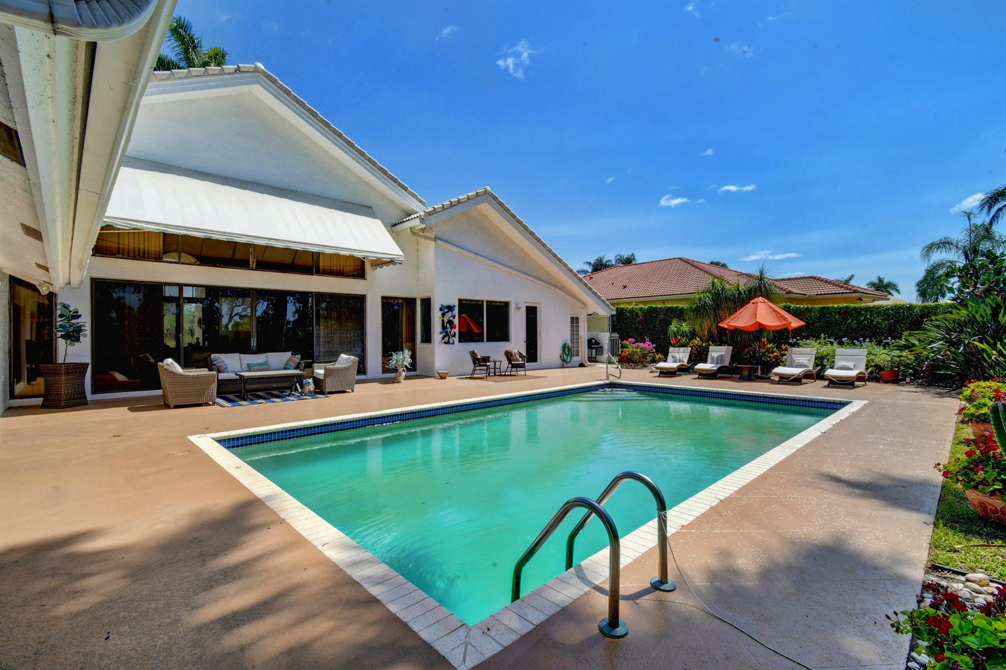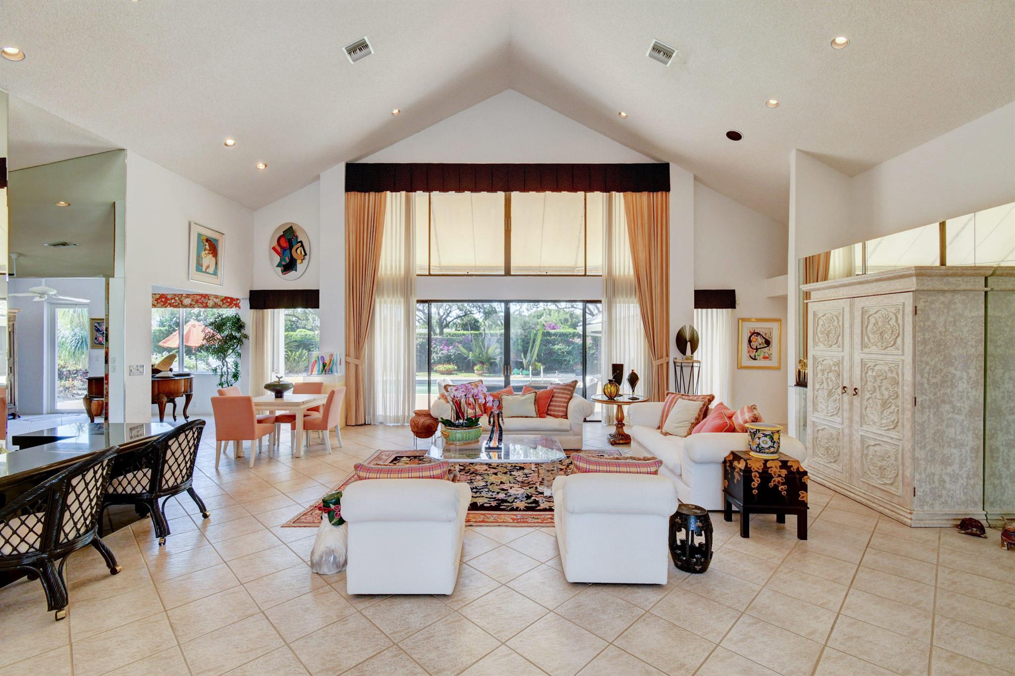 Gorgeous warmth! Expansive house on a private and sunny lot overlooking golf course! Spacious living, dining, kitchen and extended family room. Three large ensuite bedrooms plus office (currently used as bedroom) Plus an additional room off master for sitting room or office. Three massive walk in closets in master! Vaulted ceilings and wet bar this house is on one floor! Serene patio around pool with ample entertaining space or for kids and pets to run around. Well maintained home in the exclusive Bocaire Country Club. No tee times on new championship golf course. Active tennis, golf, fitness programs, high end dining and social life. Only 238 homes in this friendly and inclusive community. Mandatory Membership. A rated school district, close to beaches, shopping, restaurants. A must see