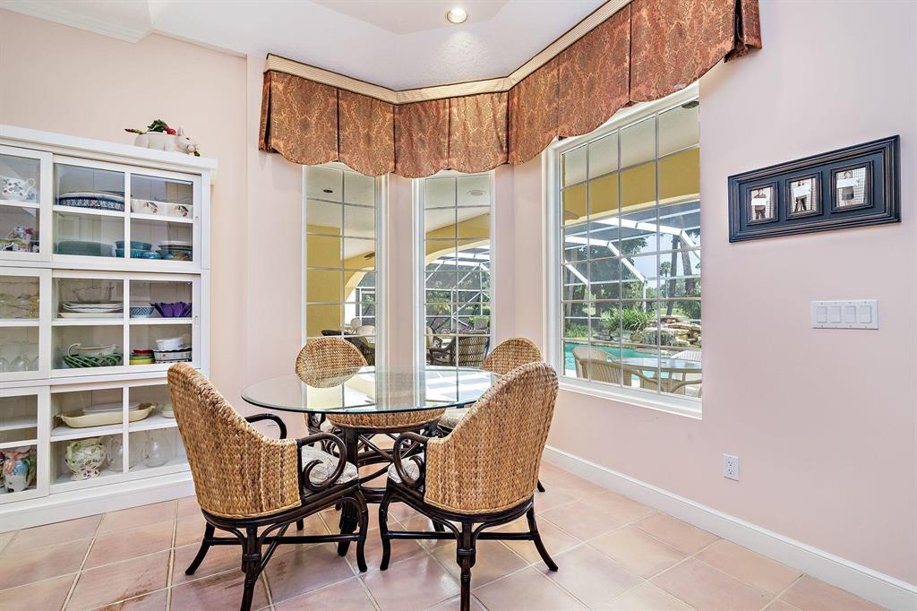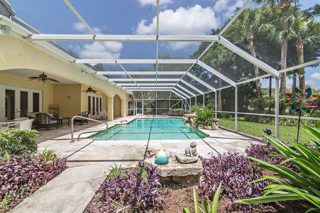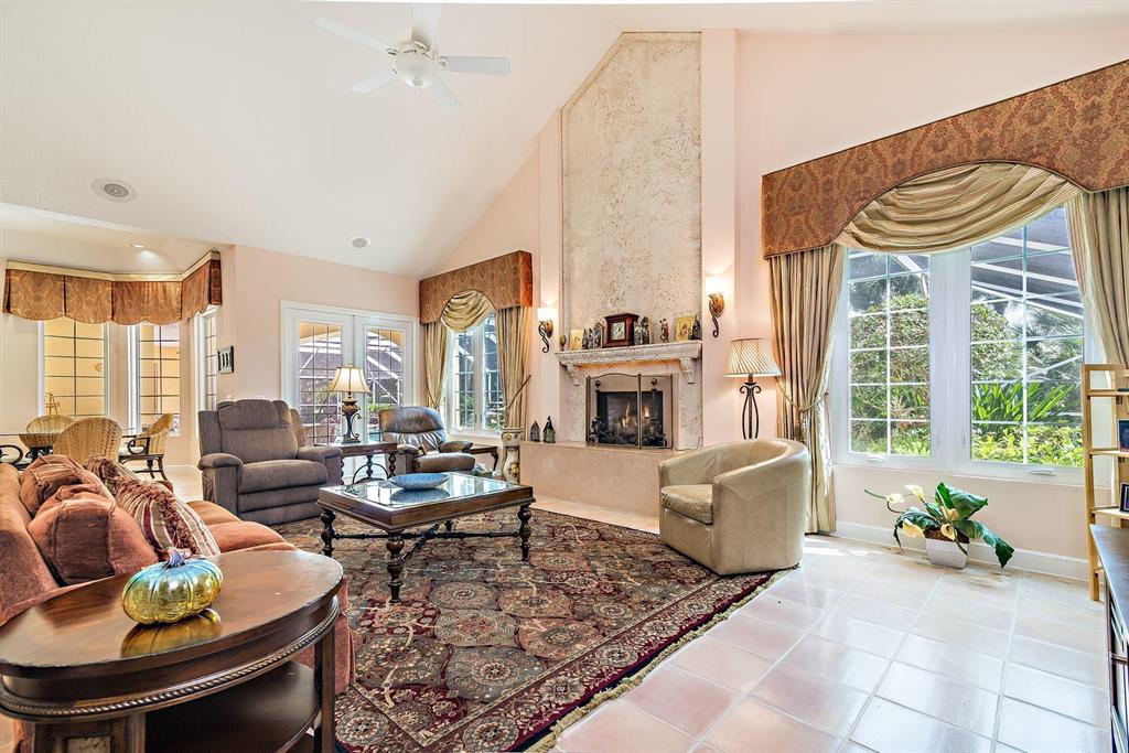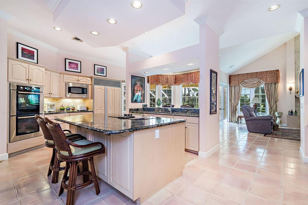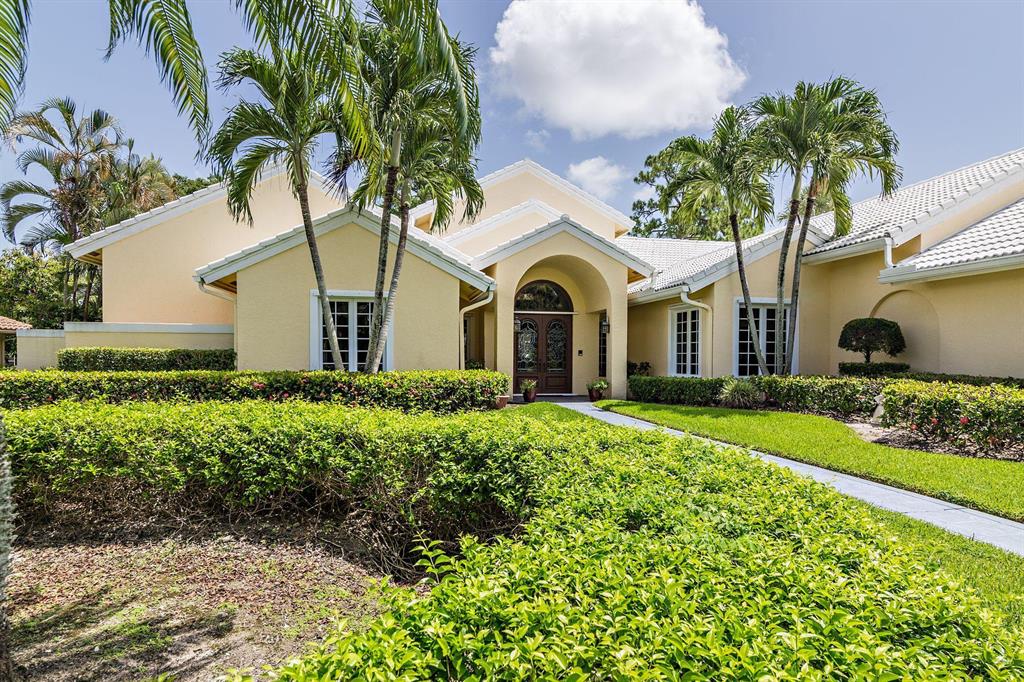 Beautiful Bermuda style architecture in the estates of Breakers West. Expansive green golf course views plus privacy from all major rooms. This 4 bedroom, 3 full and 2 half baths, 2.5 car garage was refurbished in 2009. A flowing floor plan with generous room sizes and custom wood coffered ceilings enhance the dramatic living room with warm maple flooring. Gourmet kitchen with granite counters, stainless appliances and Sub Zero opens onto a bay windowed breakfast room and large great room with wood burning fireplace & french doors. A comfortable 52 x 15 arched covered loggia overlooks extra wide pool w/ spa and waterfall and natural form stone pavers. Ideal 5 star country club living at its finest with Breakers West and Mayacoo Lakes Country Club offering non mandatory memberships.