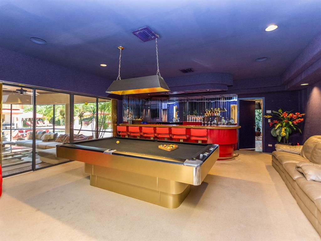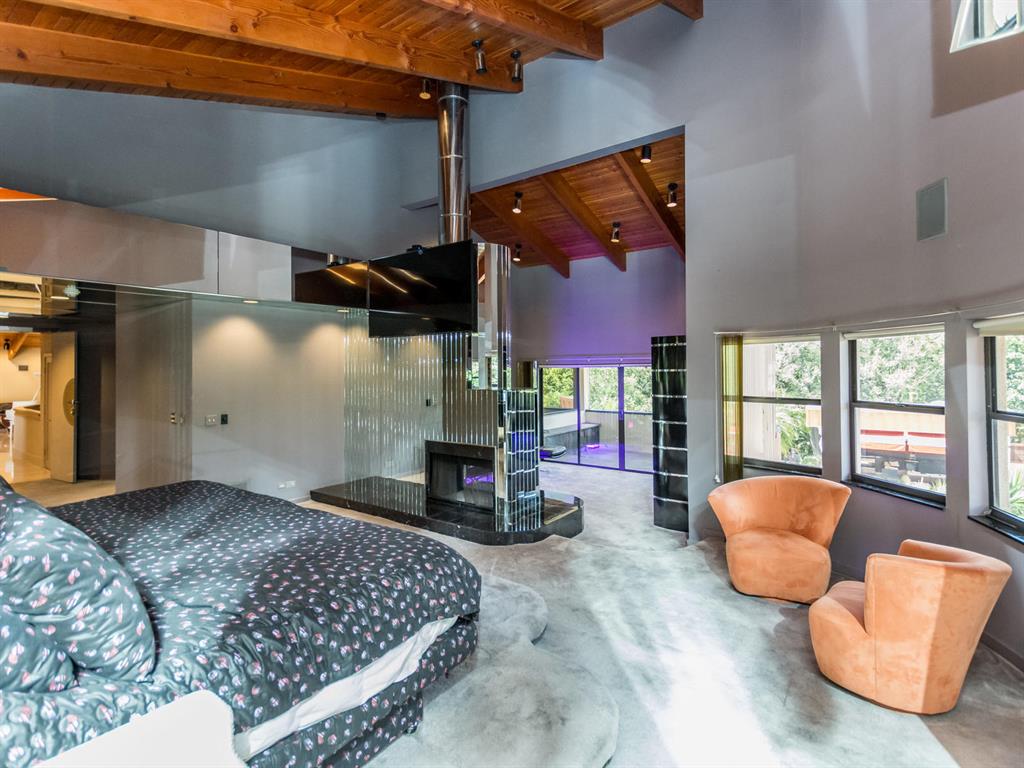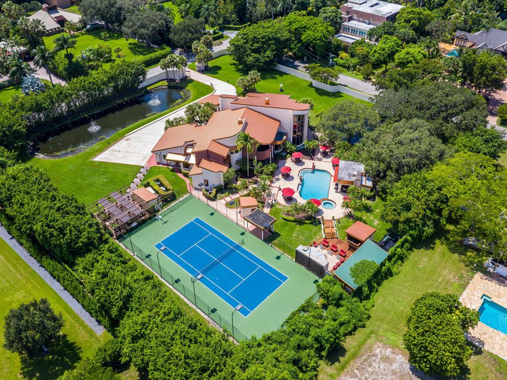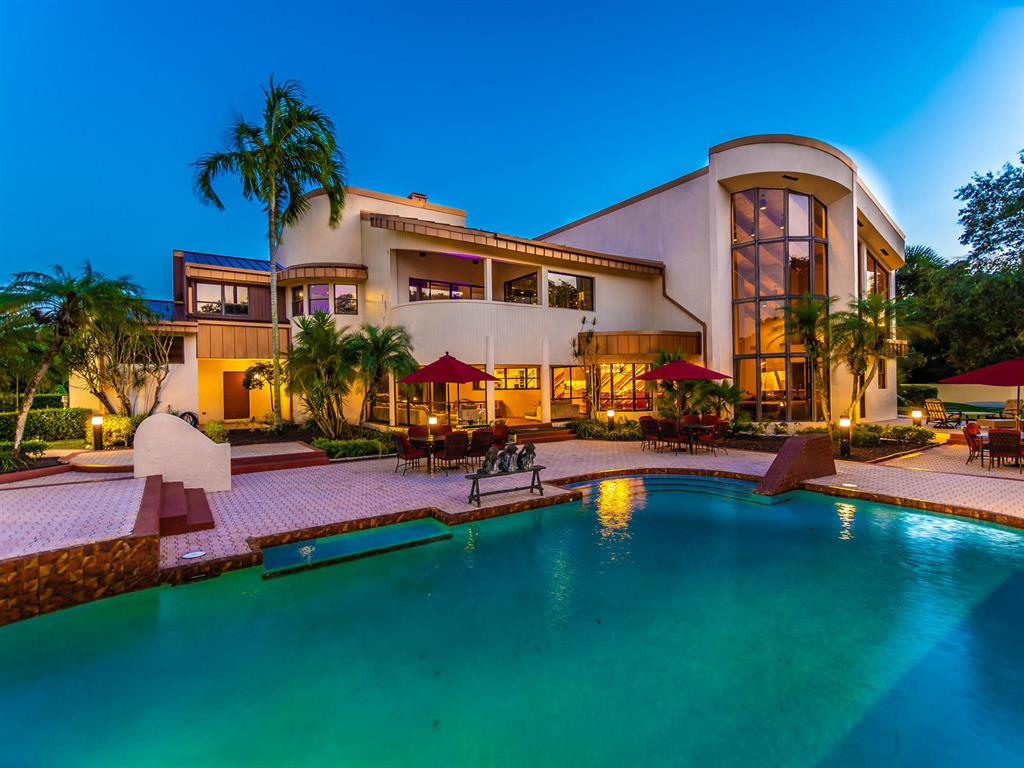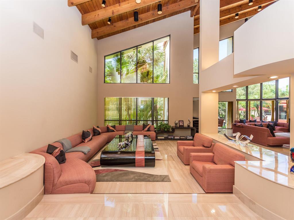 This one of a kind Architectural Masterpiece- 5 bedroom/5.5bathroom contemporary and professionally designed home and sits on a 2.5 acre estate with over 400 feet of wall, plus fence with a secured gated entry on a private street. Extra large master suite with 25 ft ceilings, has a large master bath 26'x20' with whirlpool tub and steam room and 2 offices. The 40 ft ceilings in living room and Italian marble floors, custom fireplace which looks like a piece of art soaring to 40'. Gourmet kitchen. Oversized heated pool, outdoor kitchen/bar , 8 person hot tub gazebo, 2 stocked ponds, lighted tennis and basketball court, outdoor bar, 8'x20' outdoor movie theater, architectural garden, fire pit. You feel like you are at a 5-star resort. No HOA, 80 KW Generator.