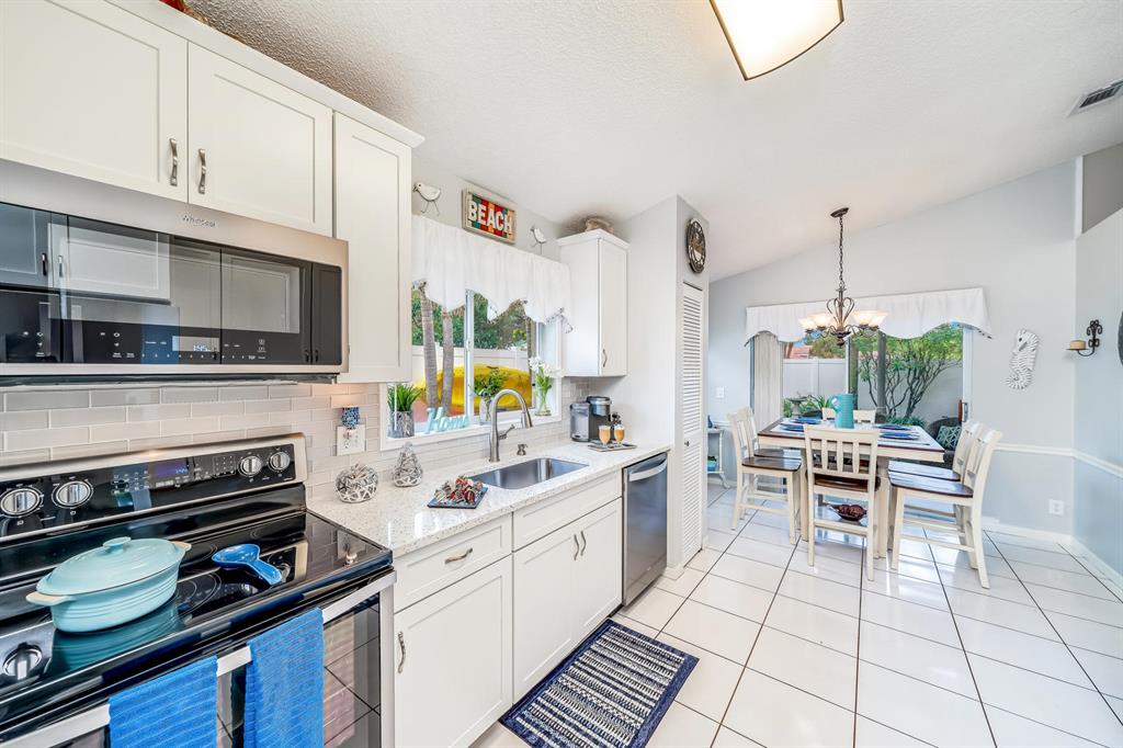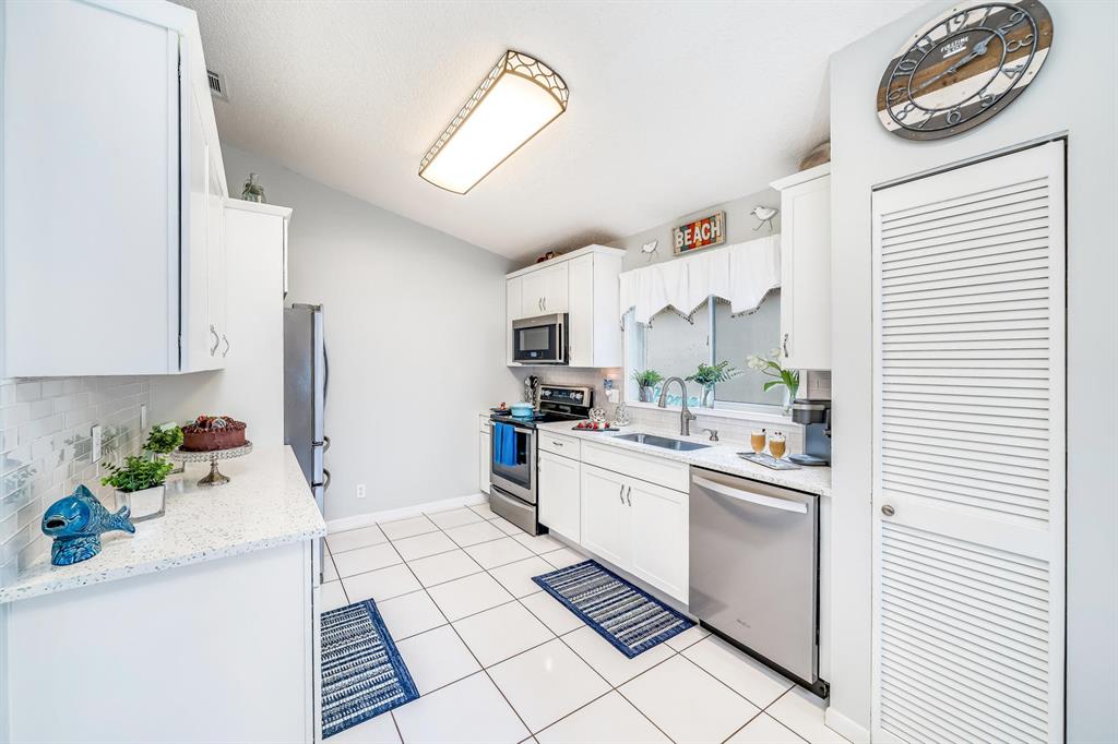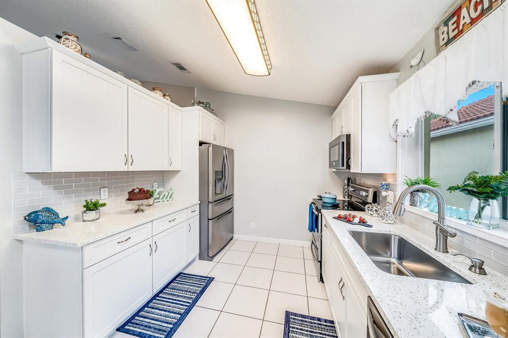 Wow! Meticulous, beautiful & truly amazing Home features 3 bedrooms, 2 baths, 1 car garage w/extended paver driveway that fits 4 cars. Dramatic entrance w/soaring cathedral ceilings, an open layout & split floor plan (master on one side/2 guest bedrooms on other side), upgraded light fixtures throughout inside & outside, tile flooring throughout the living areas, laminate wood flooring in the bedrooms. Gourmet kitchen is exquisitely redone in 2018 & features Quartz countertops, white shaker wood cabinets, glass tile backsplash, NEW SS Whirlpool appliances including French door refrigerator, electric range, microwave, dishwasher, a pantry & eat-in kitchen with slider to patio. Brand New 2019 built screen in patio/sunroom 418 square feet w/vaulted ceilings is enormous (about 40x11).