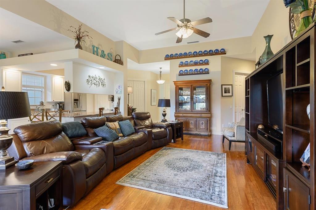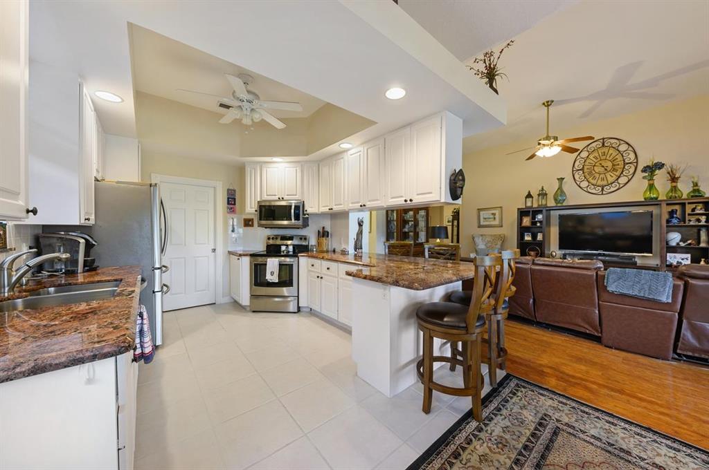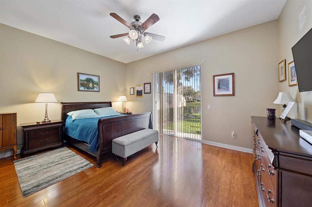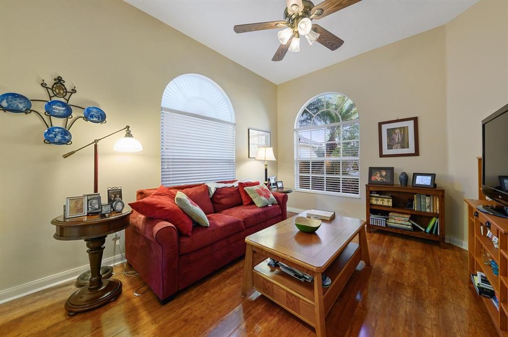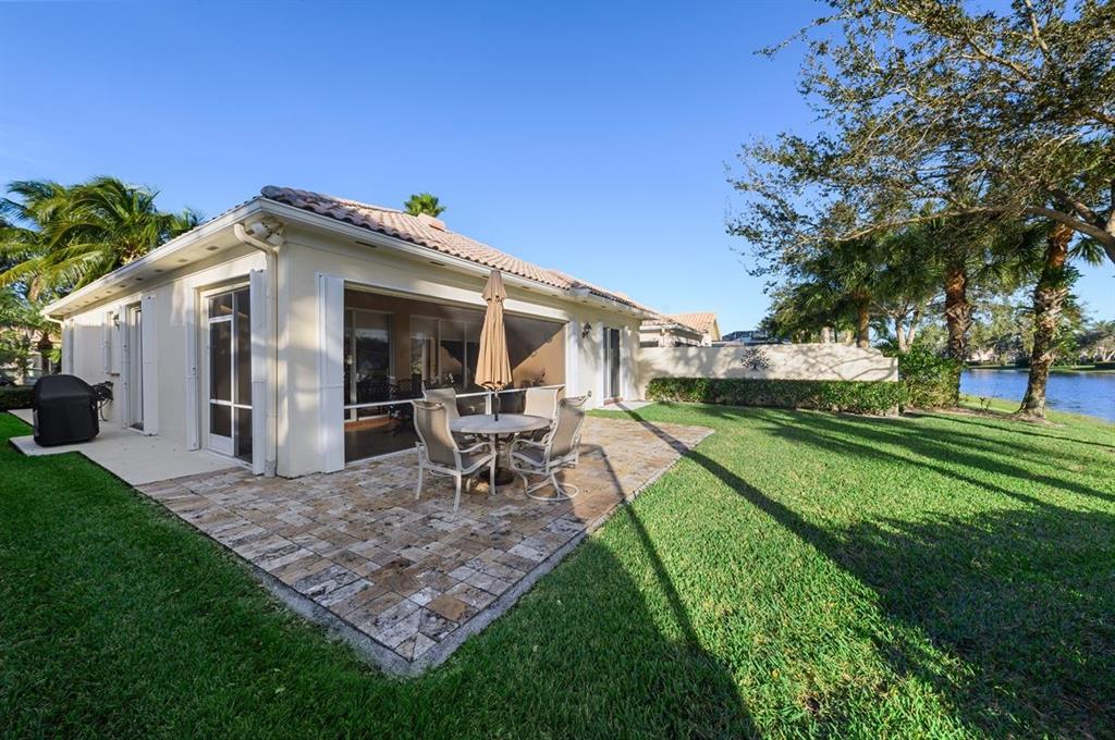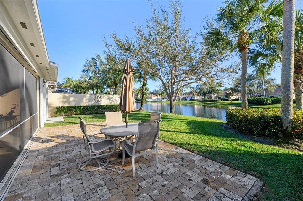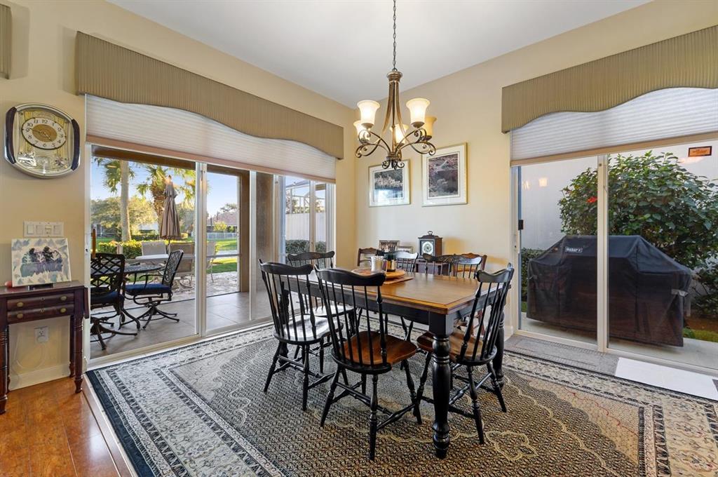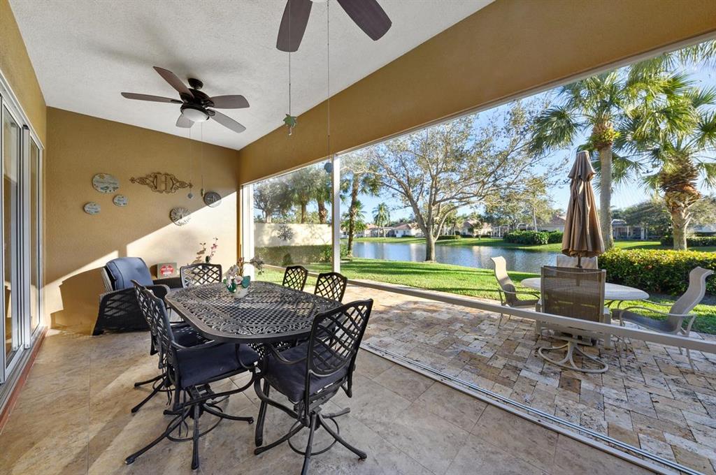 This Lakeside Oakmont With 1.5 Year Old Complete to Code Accordion Hurricane Shutters, has an Ambiance that Separates it From the Norm! It has a Sophisticated Travertine Paver Terrace overlooking the Azure Blue Water of the Lake off of the 22 ft. Wide Lanai with a Porcelain Tlle Floor that is Absolutely Stunning! The Covered Entry Opens to the Tile Foyer that leads to the Great Room with a 12 Foot Ceiling & Gorgeous Faux Plank Wood Floors & also To the Tile Dining room, that combined with the Great Room have 18 Feet of Sliding Glass Doors with Custom Signature Blinds, that Open to that Lanai & that Patio plus views of the Lushly Landscaped Grounds & Garden! It also has another Set of Sliding Glass Doors that open to a Private Landscaped Patio! In addition there is an Inviting Den/Office
