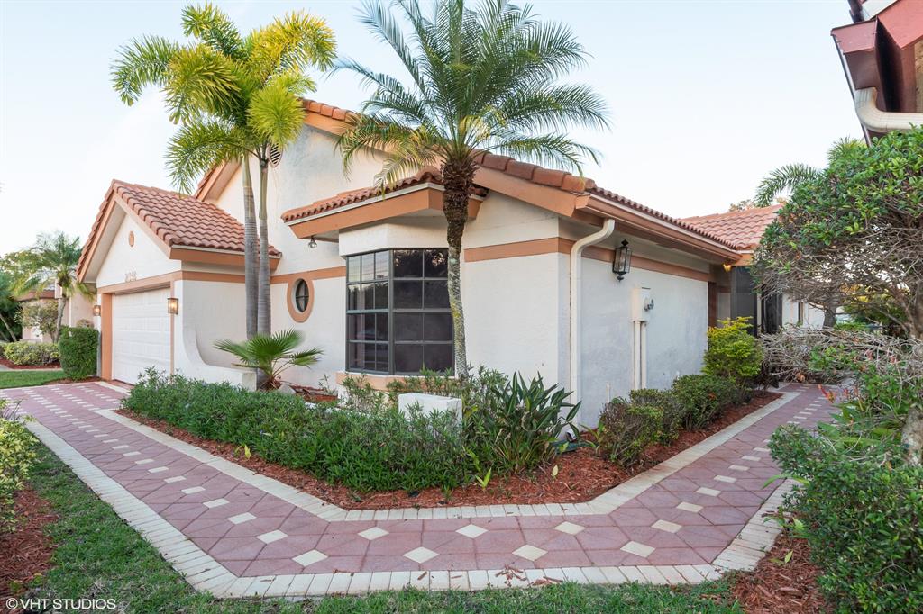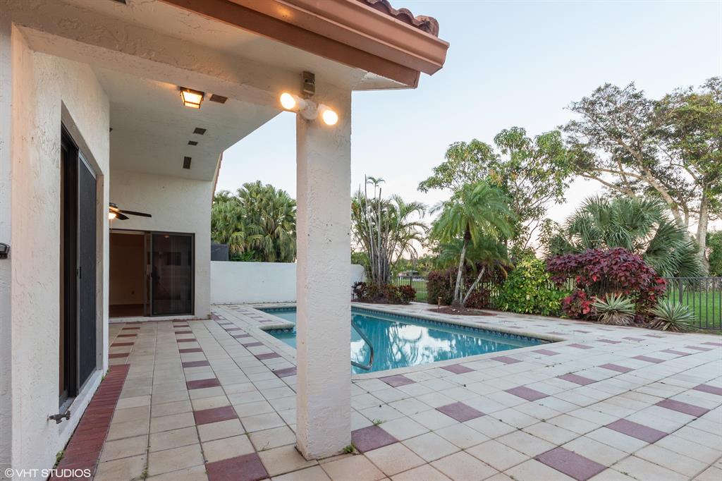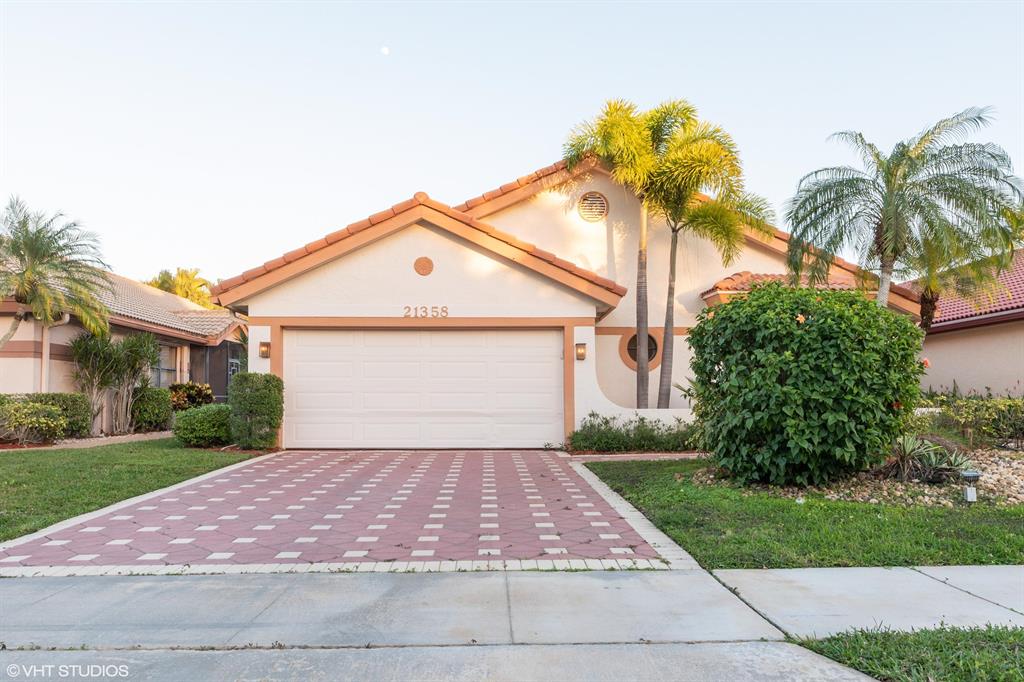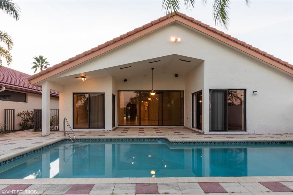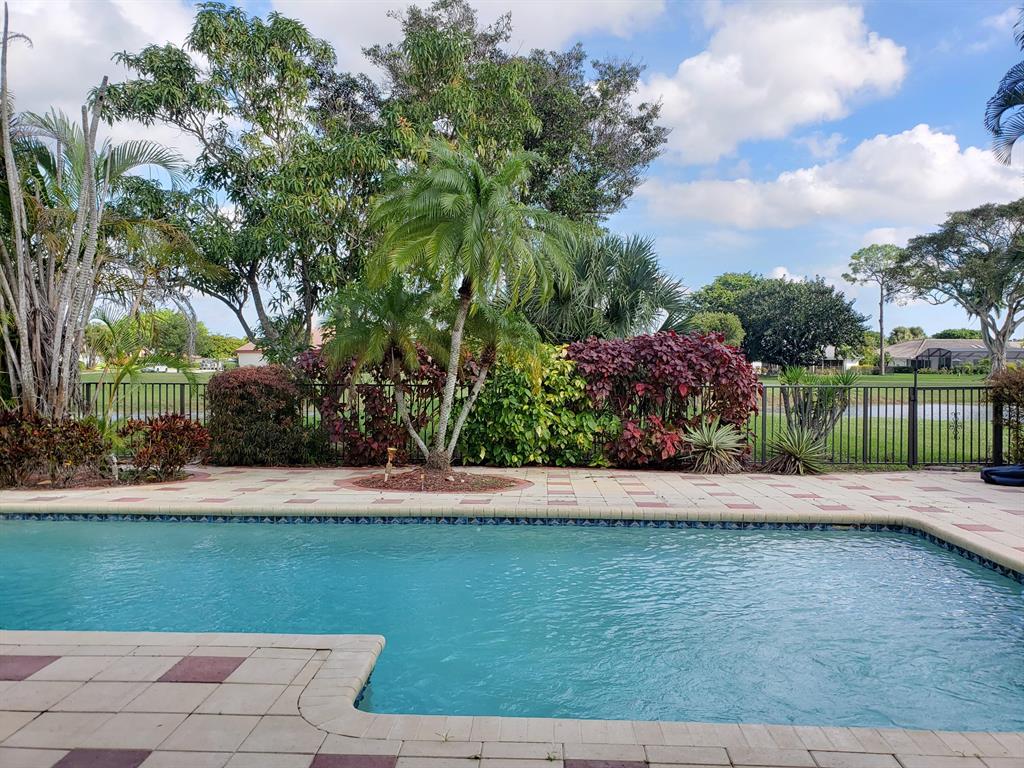 Come see this 2 bedroom plus a den / 2 bathroom single family home with a pool and serene lake and golf views in the prestigious Boca Woods Country Club Community. This home features vaulted ceilings and a split floor plan. There is tile throughout the living areas and wood laminate in the bedrooms. The master suite features dual sinks and a separate tub and shower. This home and this community are perfect for entertaining, the den even has a wet bar! Enjoy South Florida living on your back patio or swimming in your pool. Boca Woods is a mandatory membership community of $65k upfront. $30k is refundable when you sell. This wonderful gated community in west Boca Raton features two championship golf courses, a resort style pool, clubhouse, fitness, tennis, restaurants and a lounge.