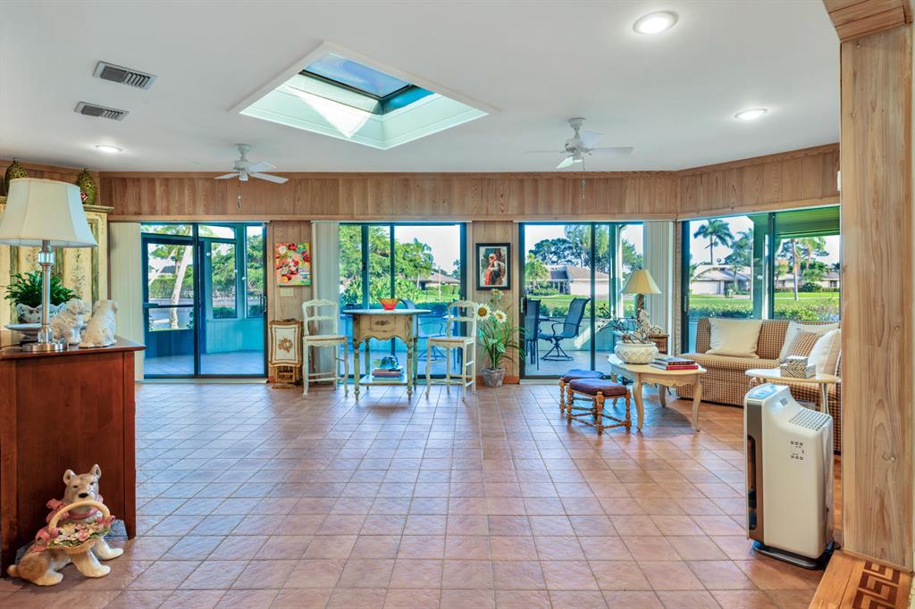 This exceptional contemporary style CBS home in the highly desirable West Village of Eastpointe Country Club has 2 bedrooms and a den that can double as a third bedroom. Plenty of natural light in this popular model with vaulted ceilings in family and dining areas, tile flooring in main living areas and 3 1/2 baths. A large spacious eat in kitchen, full size laundry room and an office make this home complete! Beautiful lake views from most of the living spaces and the fully screened wrap around lanai will allow you to enjoy the serene natural bird sanctuary. With a 2 car garage and an oversized golf cart shed there is no shortage of storage. Serenity surrounds you in this beautiful home located on a spectacular lot with a great community pool right next door.