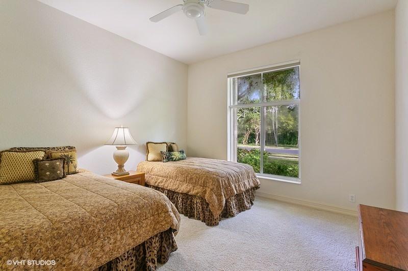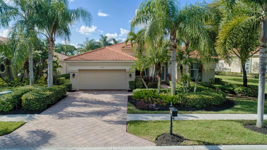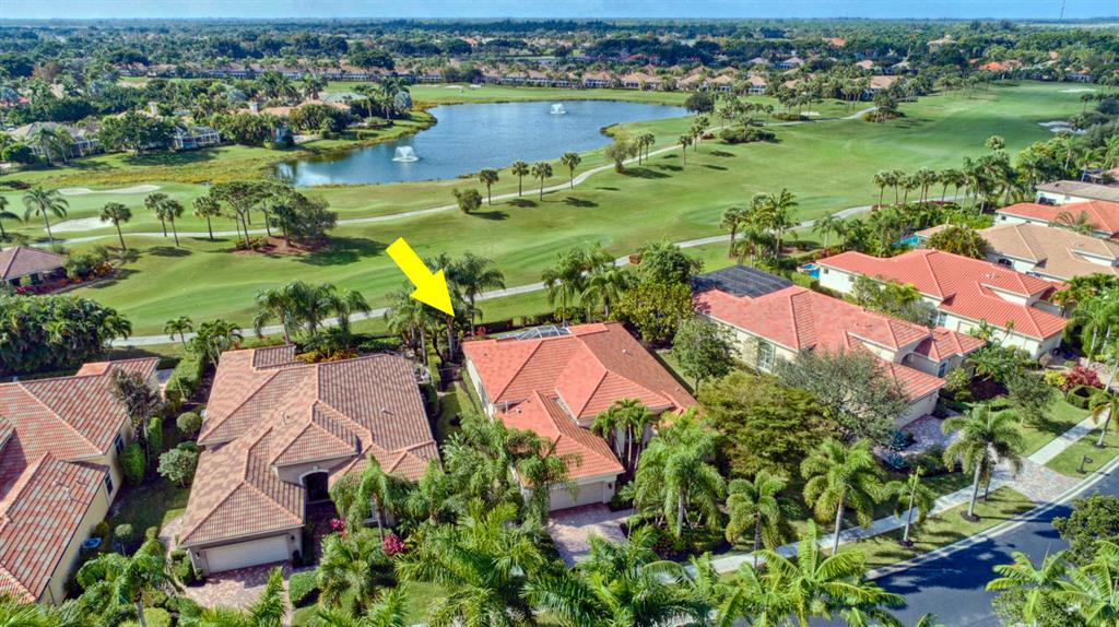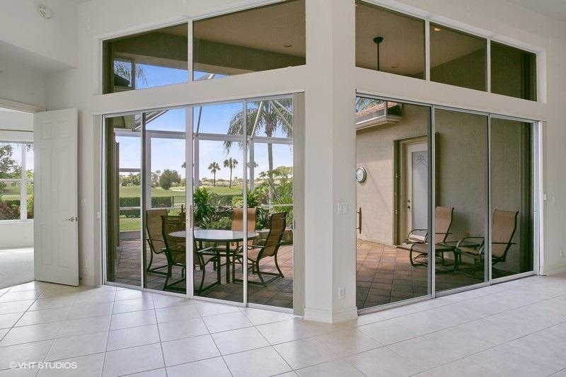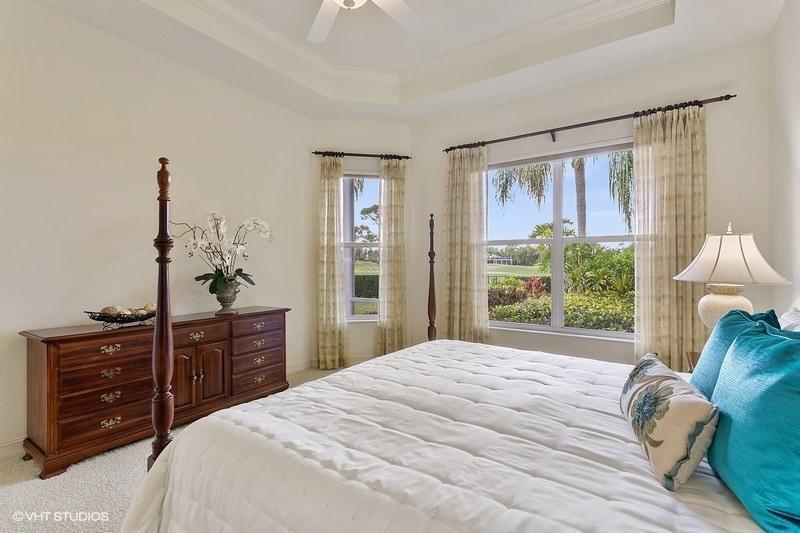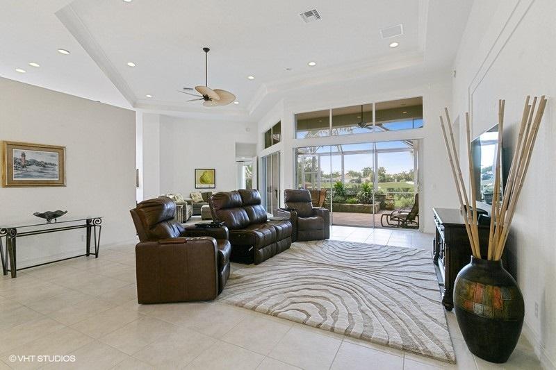 OPEN CONCEPT FLOOR PLAN ON A LOVELY WIDE LOT, THIS HOME OFFERS PRIVATE WATER VIEWS IN THE FRONT AND GORGEOUS SUNSETS WITH PANORAMIC GOLF VIEWS IN THE BACK. TALL GORGEOUS COFFERED CEILINGS AND CROWN MOLDINGS COMPLEMENT THE GREAT ROOM AND TRIPLE SLIDERS BRING IN LOTS OF NATURAL LIGHT! KITCHEN IS OPEN TO THE FAMILY ROOM AND BOASTS WHITE 42'' CABINETRY WITH AN OVER SIZED ISLAND, S/S APPLIANCES INCLUDING NEW KITCHEN AID DOUBLE CONVECTION OVENS AND NEW DISHWASHER. LARGE SCREENED PATIO IS PERFECT FOR COOKOUTS WITH FRIENDS AND FAMILY. AC REPLACED IN 2019 WITH A LENNOX 5-TON A/C UNIT. LOVINGLY-MAINTAINED, MR. AND MRS. NEAT-NICK LIVE HERE! FULL ACCORDION SHUTTERS HURRICANE PROTECTION. LARGE YARD WITH AMPLE ROOM FOR A POOL SEE VIRTUAL TOUR ATTACHED.