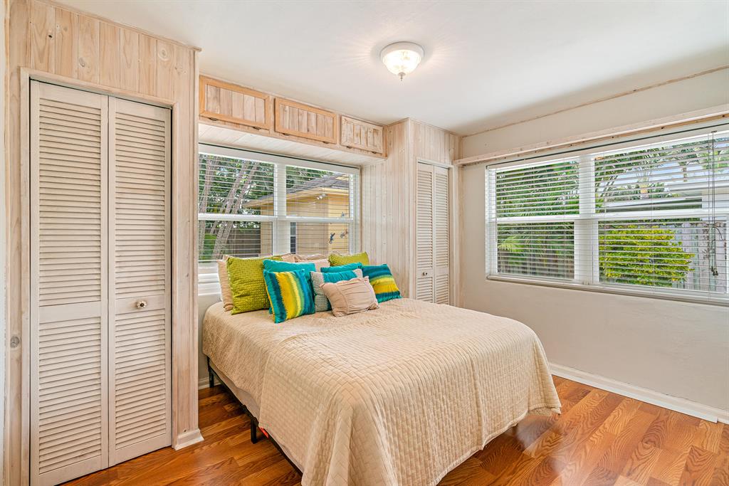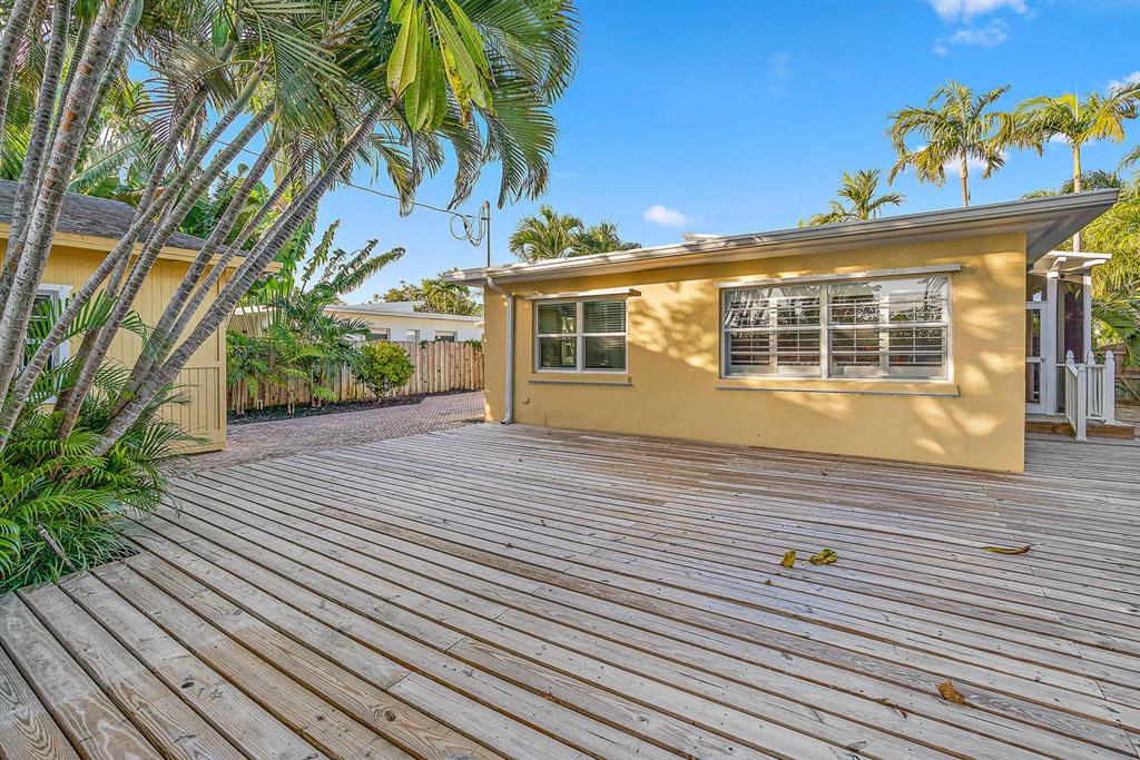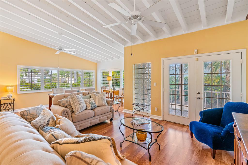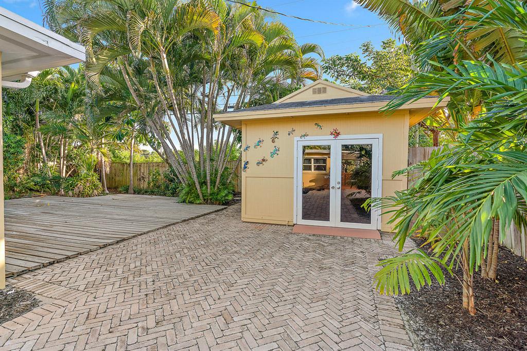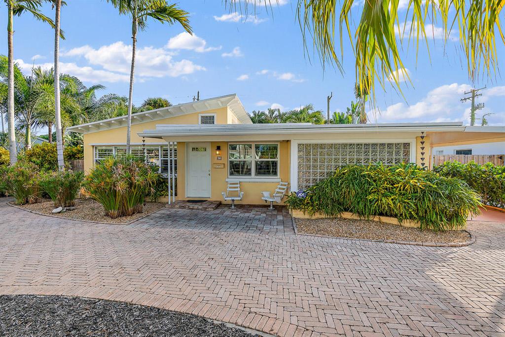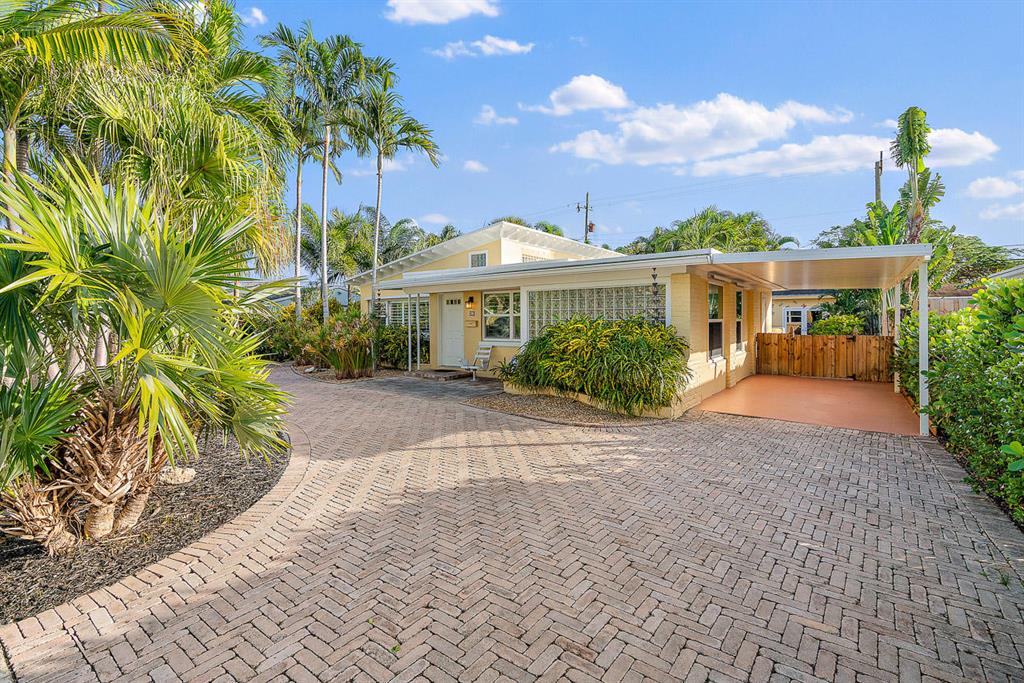 Absolutely charming, exceptionally well kept, mid-century home in the midst of the popular South of Southern neighborhood.Built on large lot with numerous trees and foliage, the home includes three bedrooms (or two bedrooms with den) and two baths--both finished in vintage art deco tile and detailing. The oversized family/living room is highlighted with a soaring vaulted ceiling with bead-board detailing. The home also features a larger catering-style, eat-in kitchen with nearby family room. A screened patio leads to a large deck and detached garage that could be finished and used as an art studio, ''man cave'' or simply for storage. The home includes a fenced in yard and carport. Only three blocks from the Intracoastal waterway.One of the best priced homes in the SoSo neig