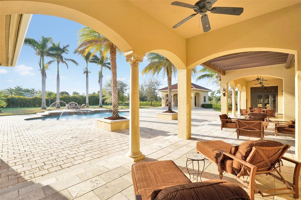 Magnificent Estate on two plus acres, with 5 bedrooms, 6.5 baths, 3 car garage and separate cabana/guest house. Upon entering this stunningly luxurious home you are greeted by a soaring foyer, coffered ceilings, extensive architectural moldings, with marble and wood flooring throughout. The spacious chef style kitchen includes custom built cabinetry, 60" Wolf Range, Sub-Zero Refrigerator, Freezer and one cooler, two Miele dishwashers including a walk-through butler's pantry with commercial beverage cooler. The outdoor entertainment areas are not to be outdone with the summer kitchen, covered and open lanai spaces all overlooking a beautiful pool with sun shelf and spa, ideal for entertaining! This lovely meticulously maintained home will impress you from the moment you step inside.
