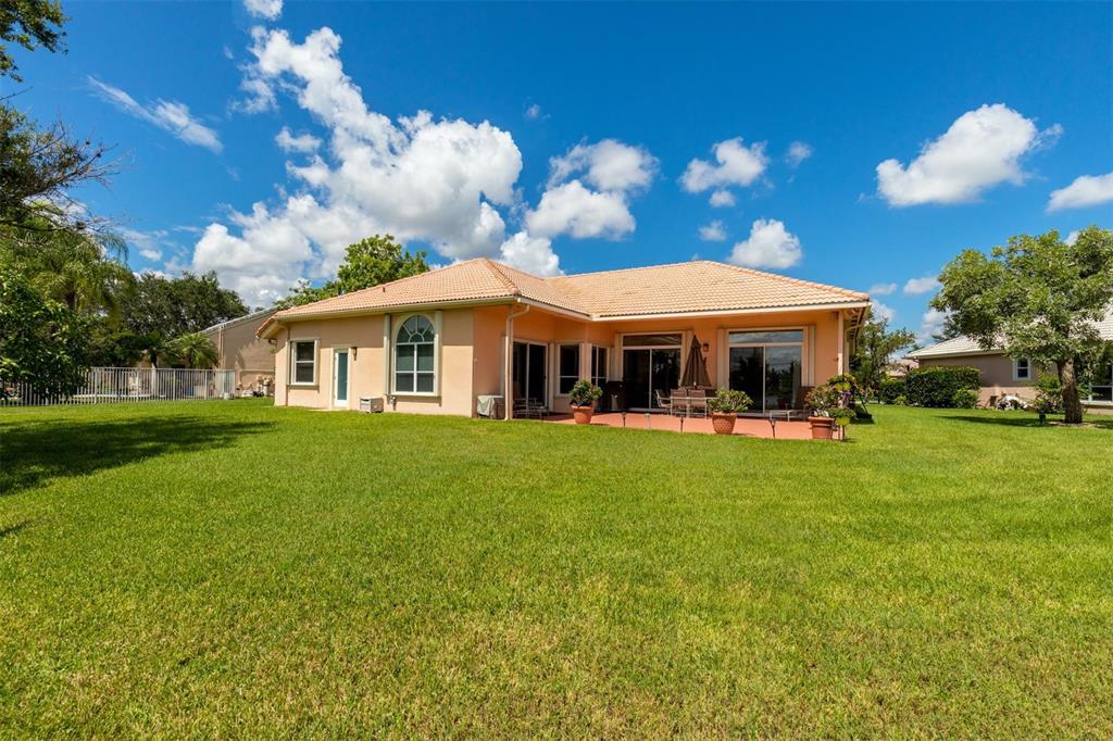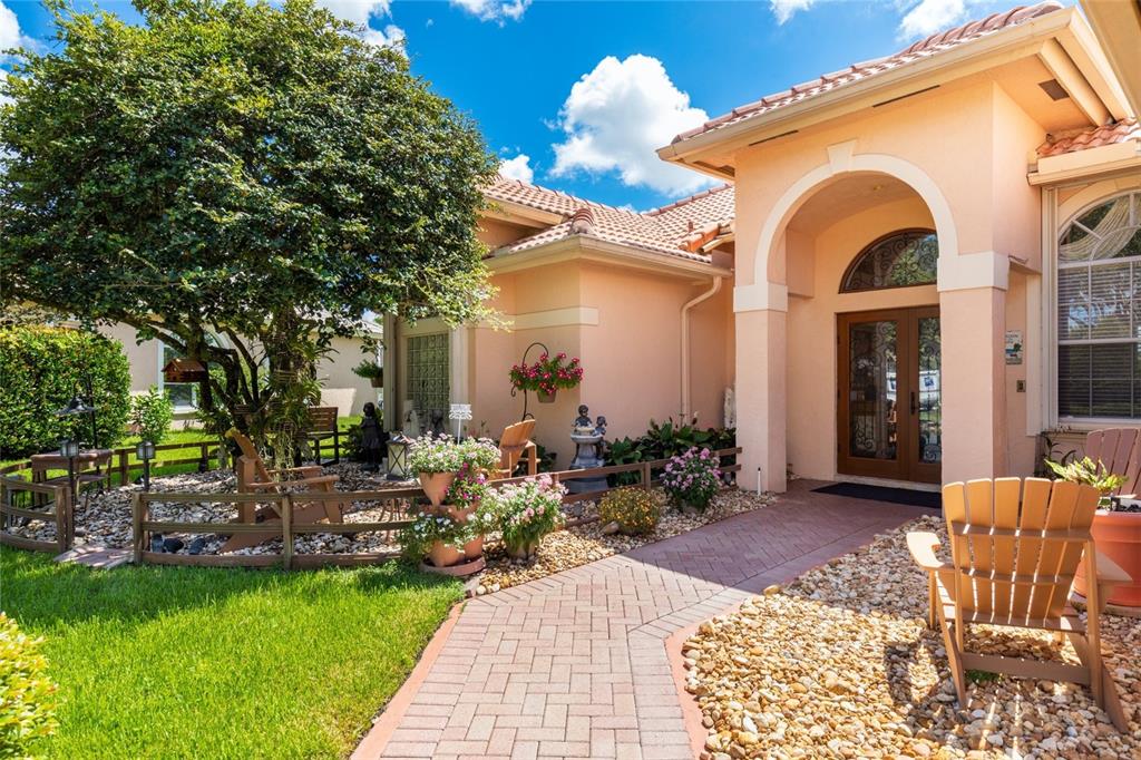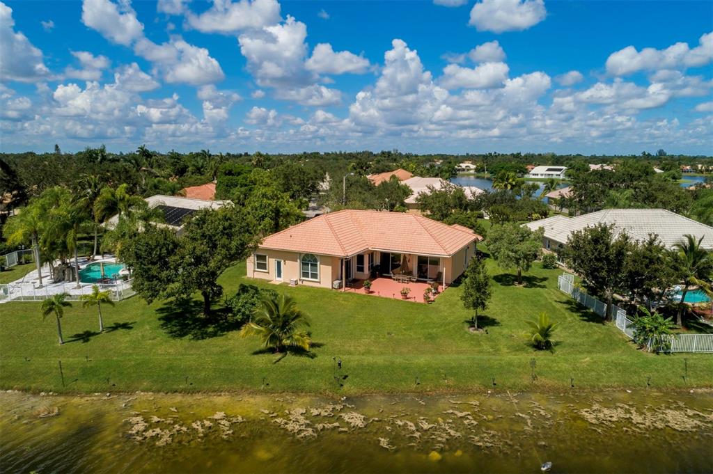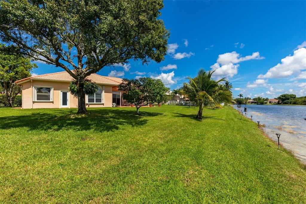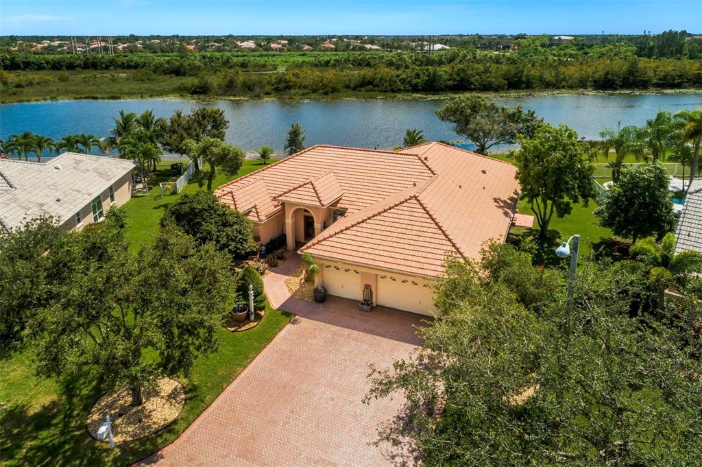 Elegant customized home on oversized 1/3 pie shaped acre lot on waterfront preserve in gated, luxe community of Estates of Stirling Lakes. Open & inviting layout w volume ceilings, wood laminate flooring in the main living areas, formal dining & living opens to huge expanded family room & eat-in kitchen. Kitchen features stainless appliances, granite, extended wood cabinetry & pantry. Huge Master suite & bath w walk-in closets has direct water view. Great triple split bedroom layout. Extras include accordion hurricane shutters, newer AC, impeccably maintained tropically landscaped grounds, fountains, 3 car garage. Small community, all homes on 90ft wide minimum lots, low HOA, close to top rated schools.