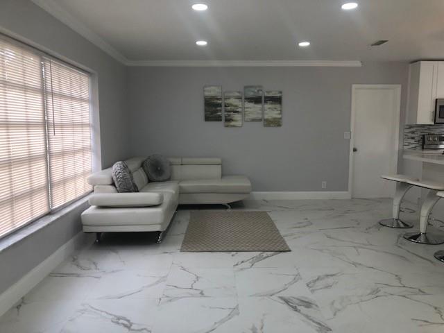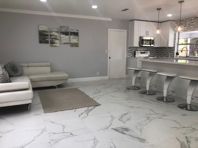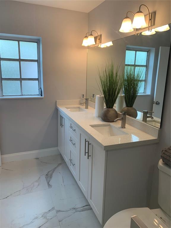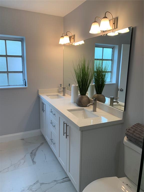Stunning two bedroom two bath completely remodeled home with extra large lot. One car garage. New tiled floors throughout. Updated kitchen with quartz counter and new Samsung stainless steel appliances. Bathrooms with double sinks vanities quartz counters, custom mirrors, new faucets, and glass shower door. Freshly painted inside and outside. Updated landscaping. Huge screen room patio with new fans. New washer and dryer. Tile roof. Recessed light in kitchen and living room. Pride of ownership! price to sell!!