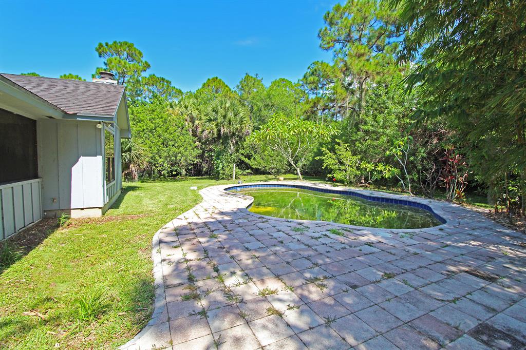 Corner lot Palm Beach Country Estates Pool Home!!! Large screened Patio overlooking pool . There is city water available that has not been connected .The kitchen has plenty of work space for the gourmet cook. Breakfast nook overlooking pool and fire place in the family room. Split floor plan with large master off the patio with large master bathroom and oversized shower and garden tub. and 2 walk in closets. Formal dining room with guest half bath. Large laundry room with shower and mud sink. All measurements are approximate buyer to verify exposure