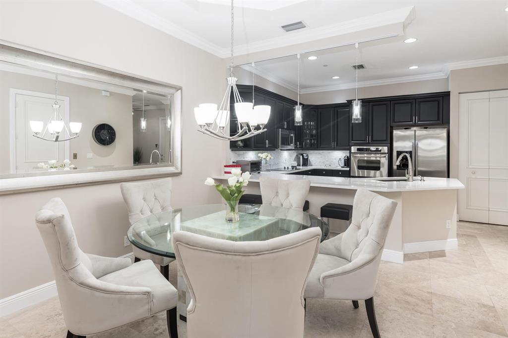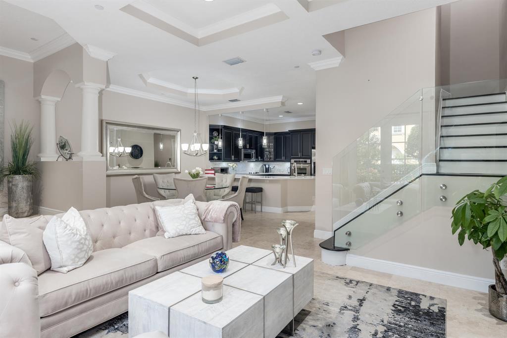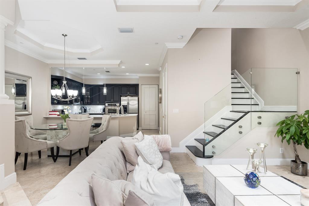 Magnificent 3-story t/h located in a Mediterranean inspired E Boca gated community. This meticulously maintained 3000+ sq ft t/h is situated on N side of Tuscany Village overlooking peaceful tropical forest. It is bright, spacious, has private elevator, modern finishes& hurricane windows throughout. The 1st floor open concept living space offers updated kitchen with: 42in wood cabinets, carrara quartz counter tops, stone back splash, SS appliances, under & over cabinet lighting; living & dining rooms with coffered ceilings, crown molding, marble floors, LED lighting & glass staircase railings. The 2nd floor has spacious family room, 2 beds & 2 balconies & oak flooring. The 3rd floor has spacious master suite with den/office/workout area & 2 balconies with tranquil views of forest & pool.