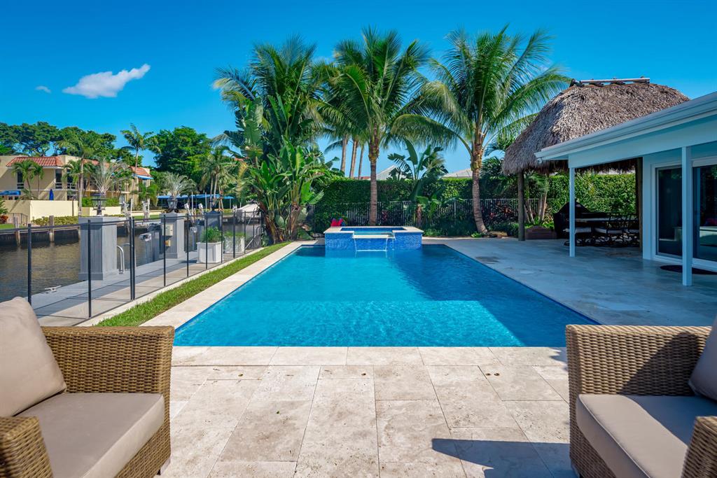 State-of-the-art tropical oasis situated on one of the most serene canals in Boca Raton.This magnificent gem features a custom 2 car garage, Porcelain Tile throughout, Granite Countertops, Stainless Steel Commercial Grade KitchenAid fridge, wine cooler & top of the line appliances. All impact glass. 83 ft of water frontage with a 63 FT Dock, 20,000 LB Boat Lift.No expense was spared! New Concrete Seawall with batter king piles & cap along with a New 63 FT Composite Dock. Pool was built in 2017 with Heater & LED Pool Light Automation. Don't miss this opportunity to own this Resort Style outdoor space & Tiki Hut. Over 2,000 Sq Ft of Ivory Travertine tile from the driveway to the backyard. NEW 4 Ton A/C System with docking HEPA Filtration (2018). No fixed bridges and just minutes to beach!