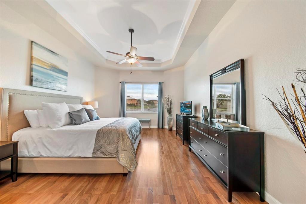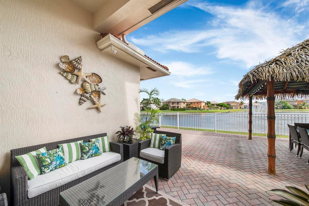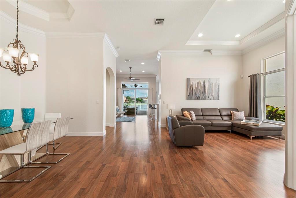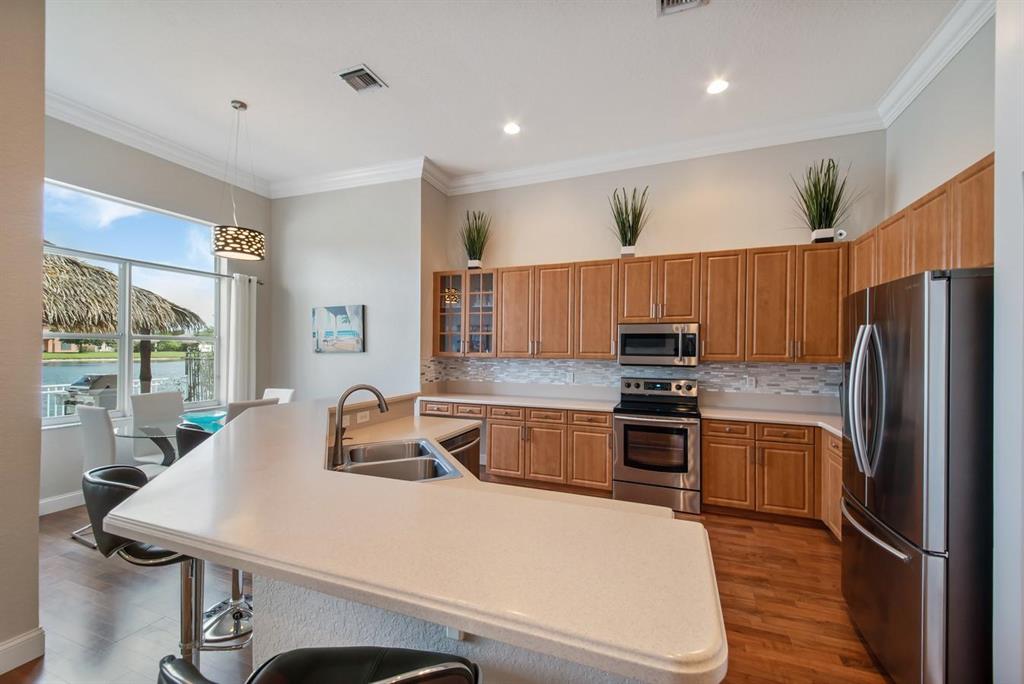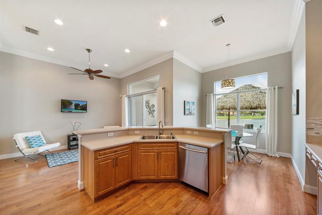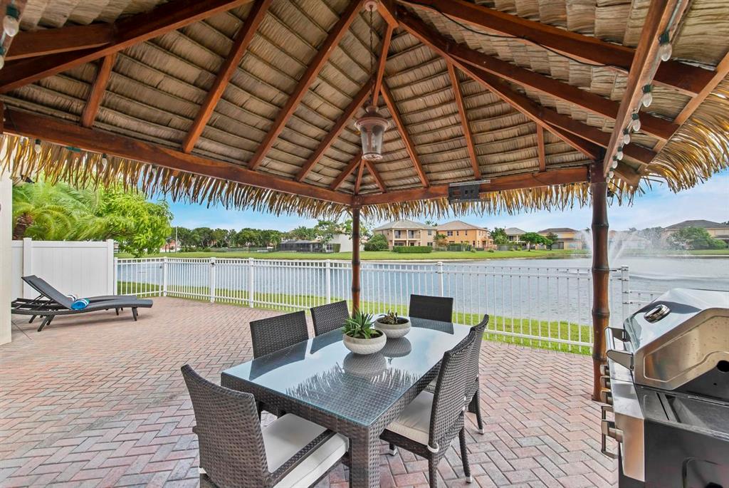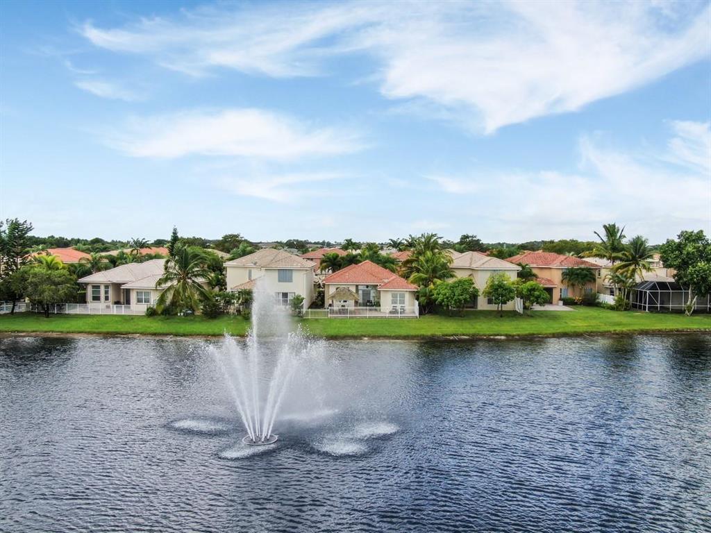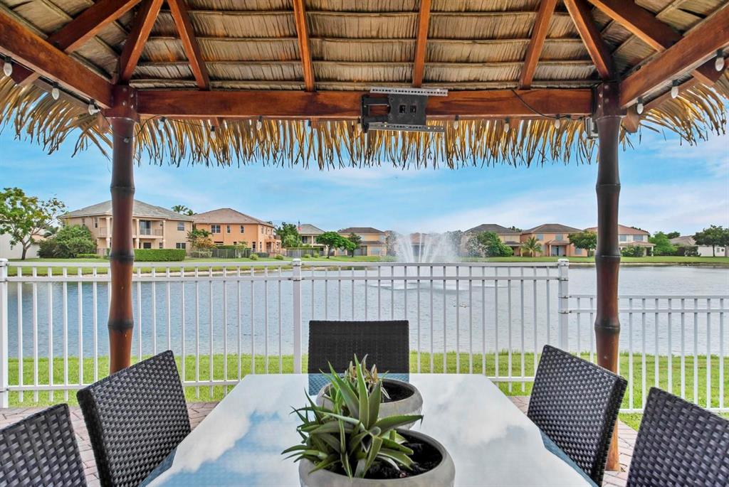 This one story home offers eye catching curb appeal with lush landscaping. Pass through the covered entrance of this bright and airy 3 bedroom, 2.5 bathroom home to discover a formal living room, formal dining room, chef's kitchen and a family room. The chef's kitchen with a stunning lake view features Corian countertops, tiled backsplash, stainless steel appliances and a snack bar. The master suite boasts a coffered ceiling, his and her closets, double sinks, a soaking tub and walk-in shower. Enjoy your own tropical oasis with a covered patio, a Tiki hut and a stunning lake view. Laminate wood flooring, high ceilings, crown molding, high hat lighting, central vac and an abundance of natural light complete this spectacular home.