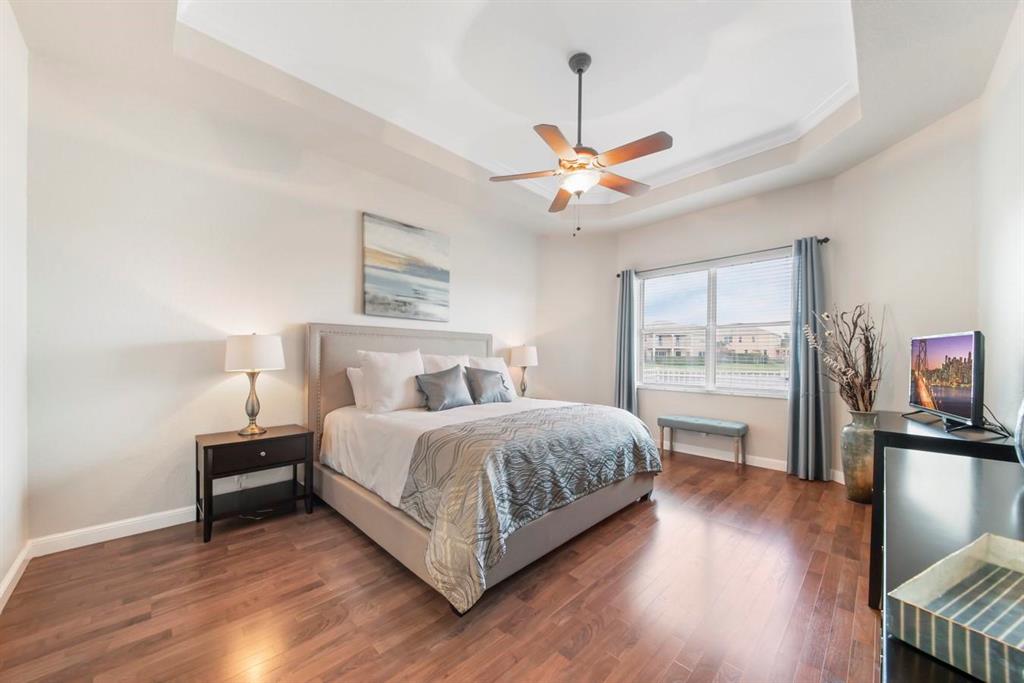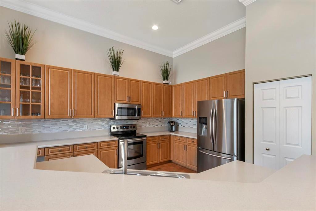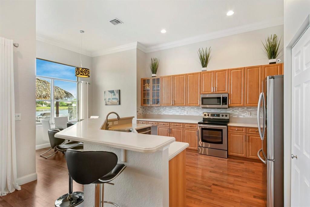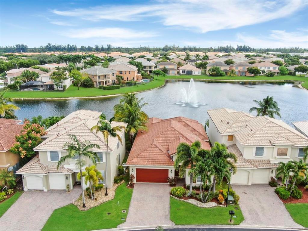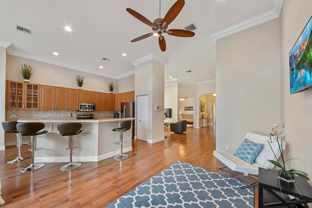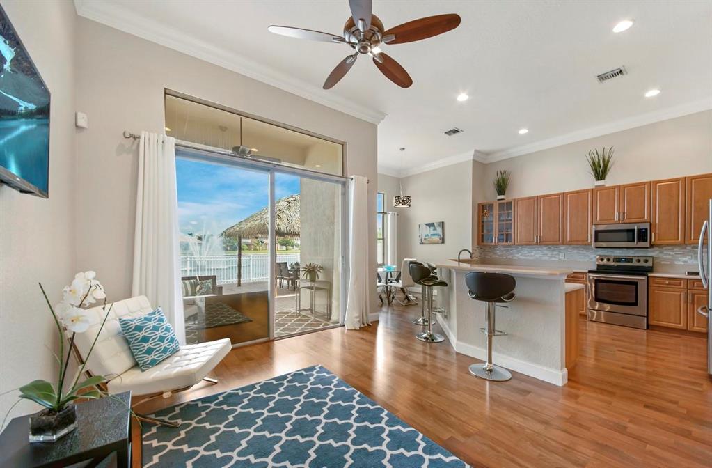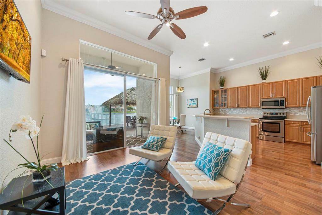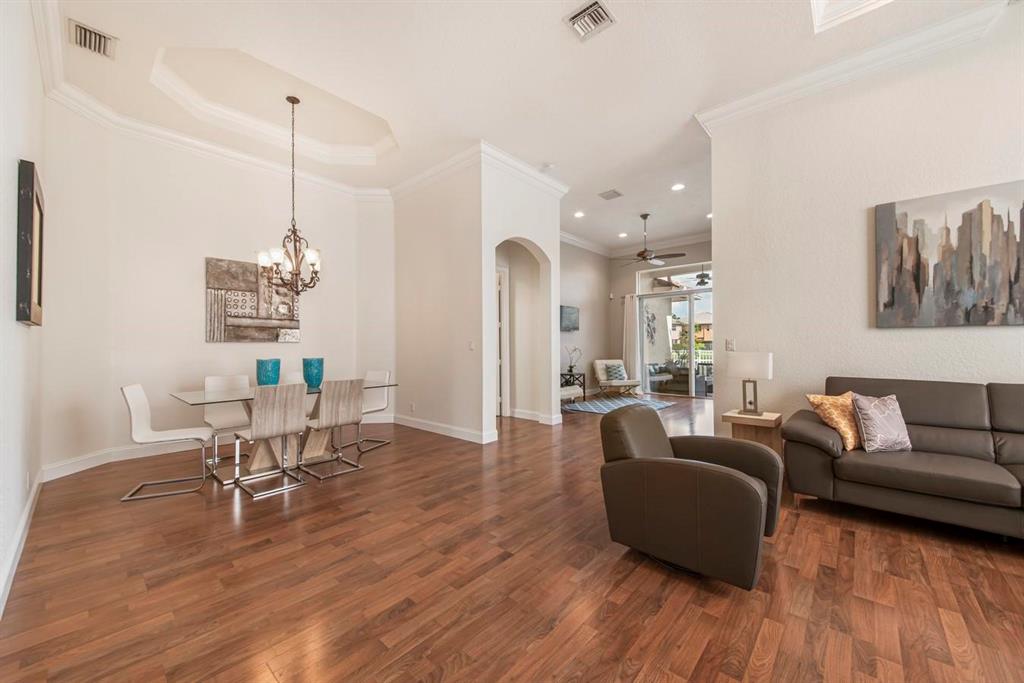 This one story home offers eye catching curb appeal with lush landscaping. Pass through the covered entrance of this bright and airy 3 bedroom, 2.5 bathroom home to discover a formal living room, formal dining room, chef's kitchen and a family room. The chef's kitchen with a stunning lake view features Corian countertops, tiled backsplash, stainless steel appliances and a snack bar. The master suite boasts a coffered ceiling, his and her closets, double sinks, a soaking tub and walk-in shower. Enjoy your own tropical oasis with a covered patio, a Tiki hut and a stunning lake view. Laminate wood flooring, high ceilings, crown molding, high hat lighting, central vac and an abundance of natural light complete this spectacular home.