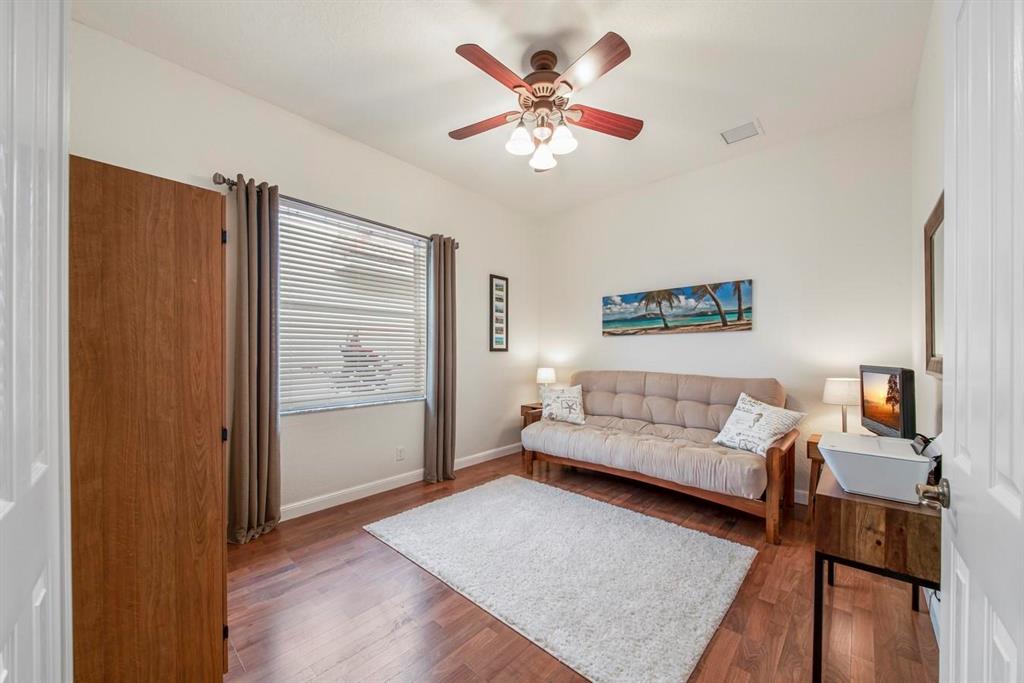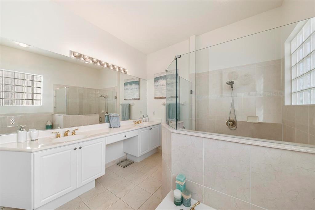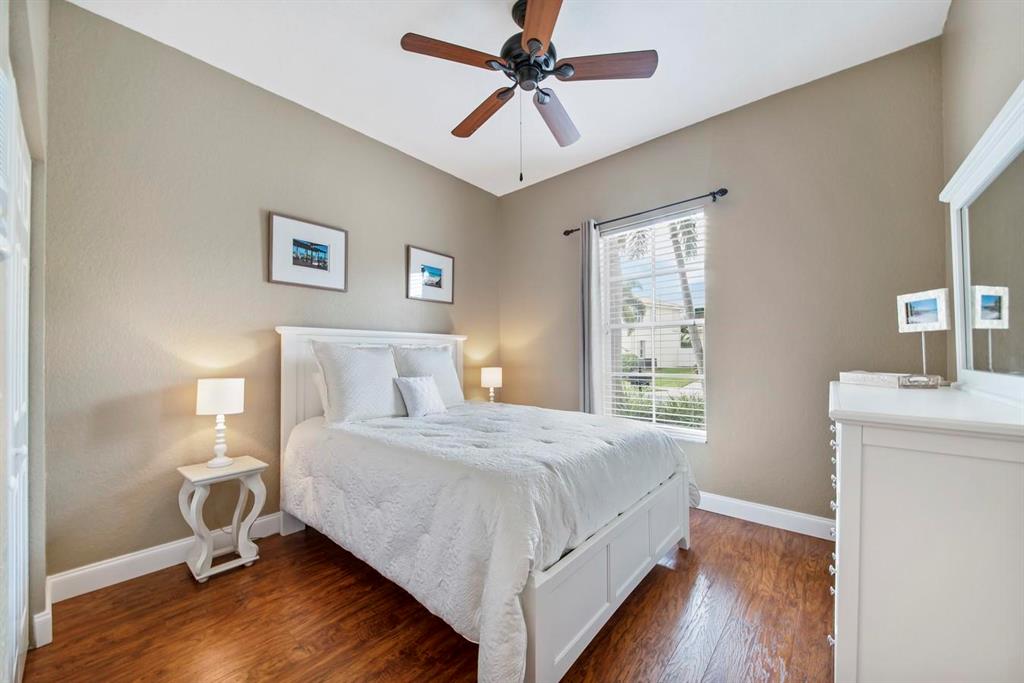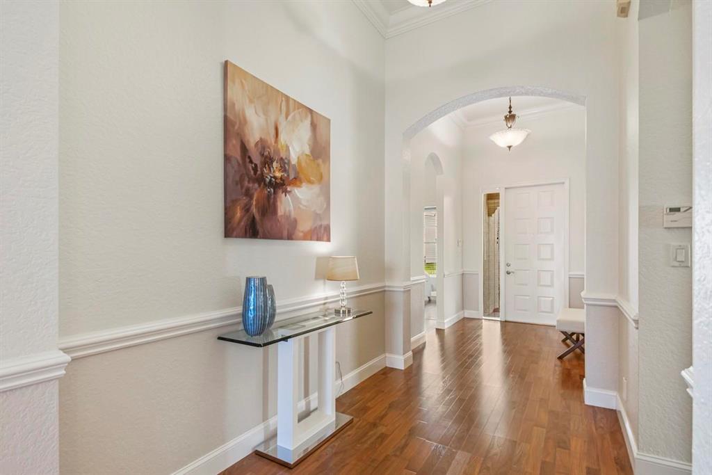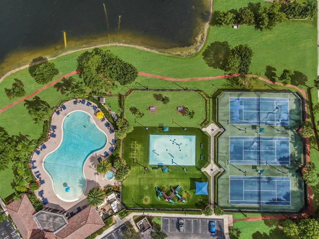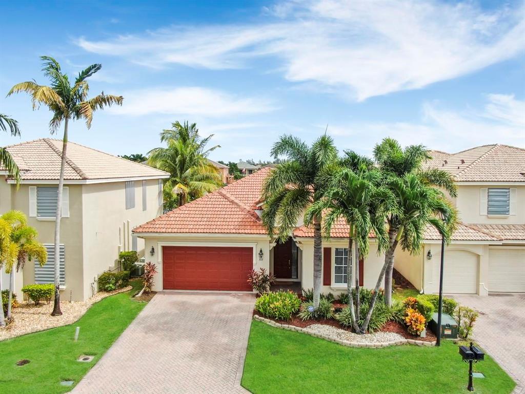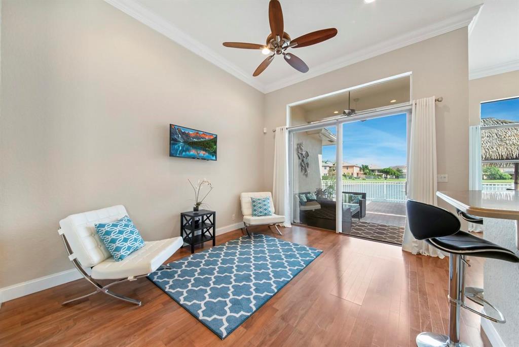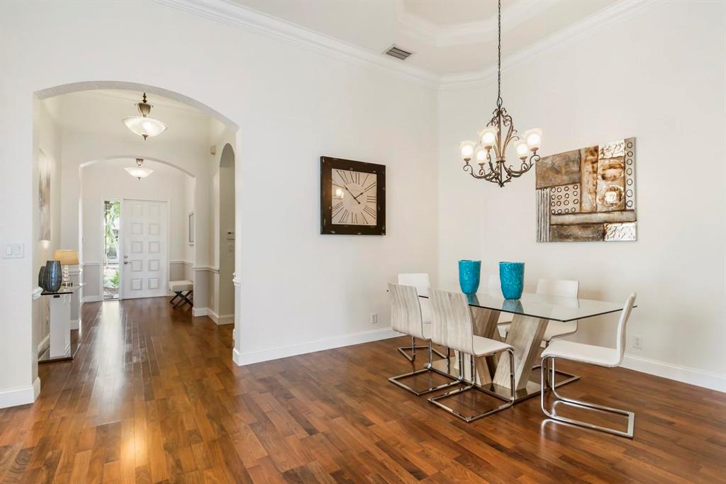 This one story home offers eye catching curb appeal with lush landscaping. Pass through the covered entrance of this bright and airy 3 bedroom, 2.5 bathroom home to discover a formal living room, formal dining room, chef's kitchen and a family room. The chef's kitchen with a stunning lake view features Corian countertops, tiled backsplash, stainless steel appliances and a snack bar. The master suite boasts a coffered ceiling, his and her closets, double sinks, a soaking tub and walk-in shower. Enjoy your own tropical oasis with a covered patio, a Tiki hut and a stunning lake view. Laminate wood flooring, high ceilings, crown molding, high hat lighting, central vac and an abundance of natural light complete this spectacular home.