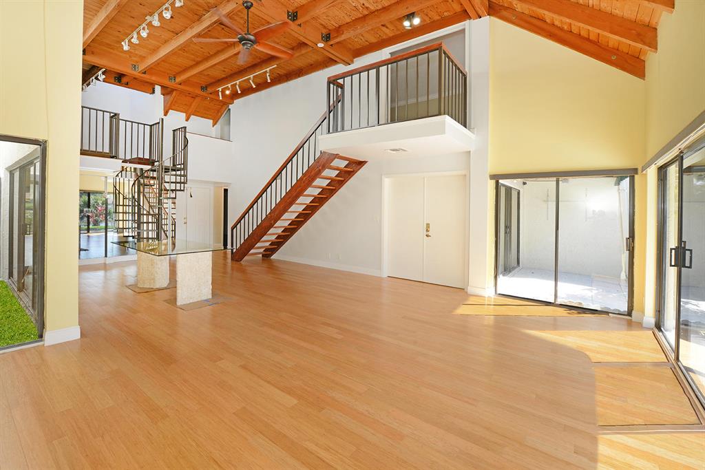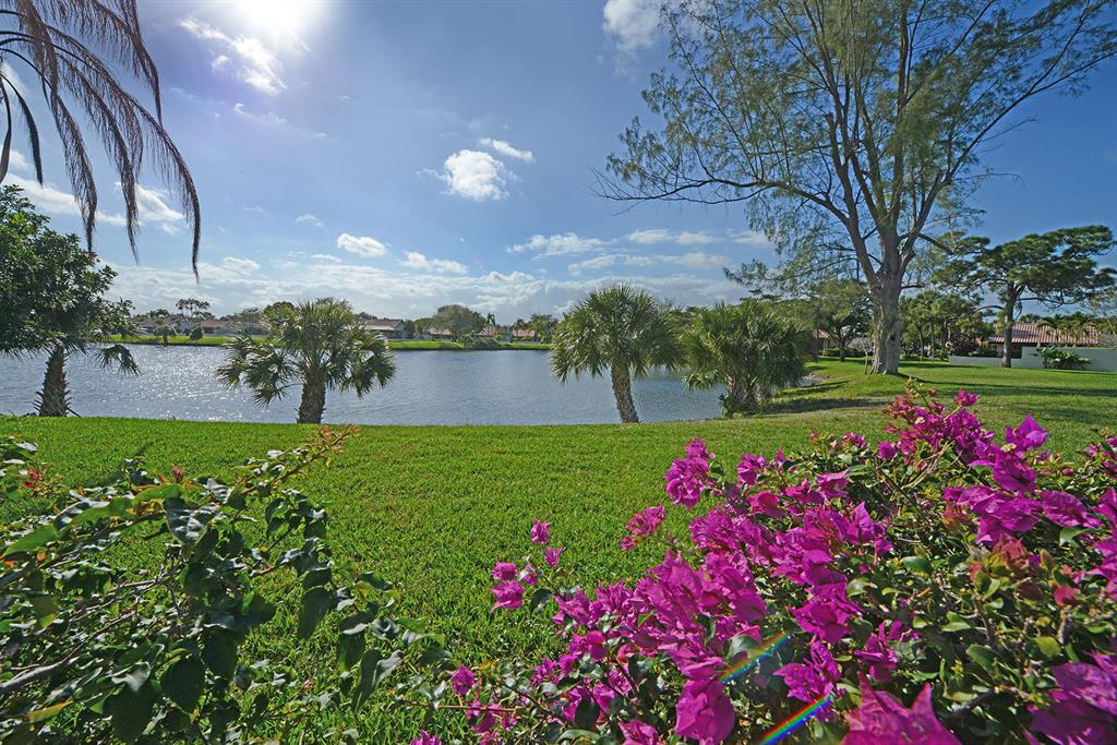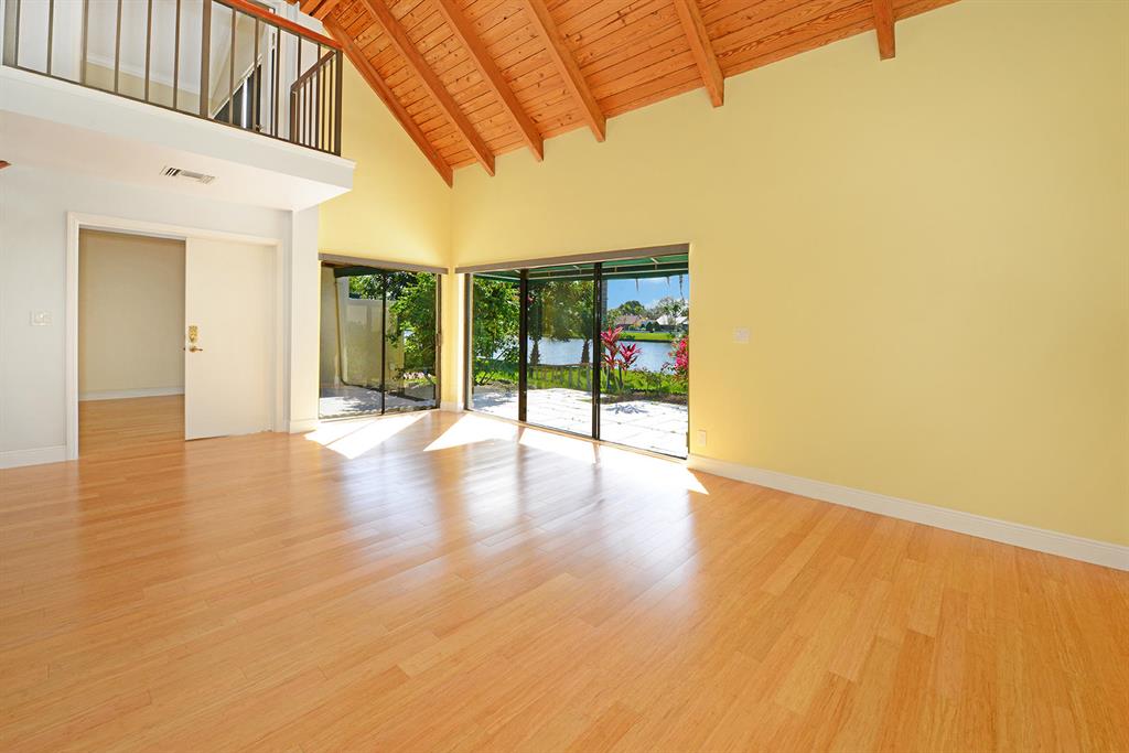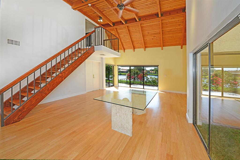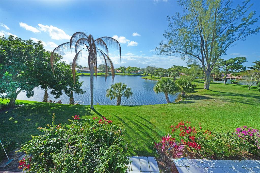 STUNNING WIDE LAKE VIEW from this expanded 3 bedroom 2 bath townhome with volume wood ceilings in living area. Master suite is the entire upper floor with multiple closets and access to a unique den/office. With a private balcony and view of the lake this is a stunning master retreat. There are 2 bedrooms on the main level. One of the rooms could be an office or den with a walk in closet and access to a screened patio overlooking the lake. As you walk into the house the first thing you see is the water and the surrounding green area. Location and view..A perfect combination. Close to Town Center Mall, more shopping, restaurants and in between I95 and the Turnpike.