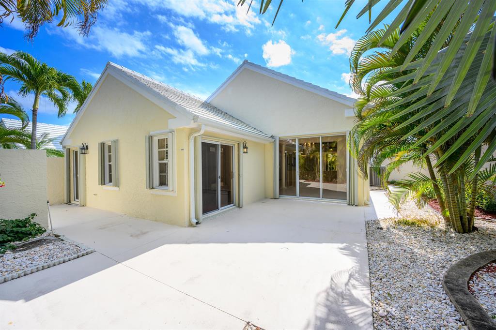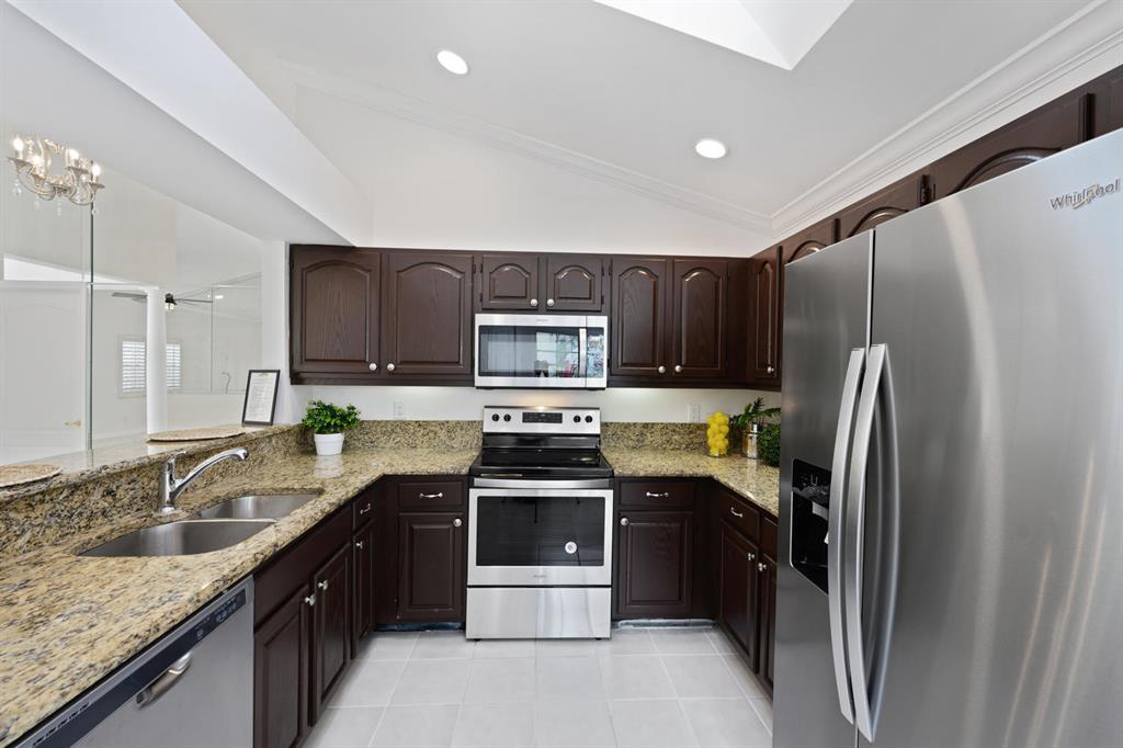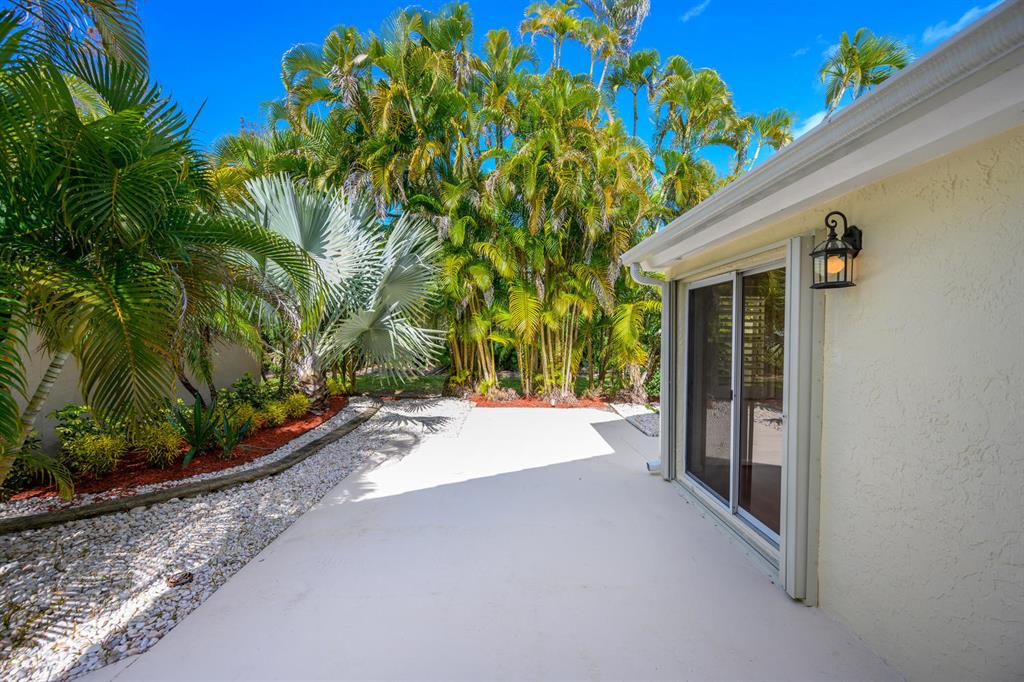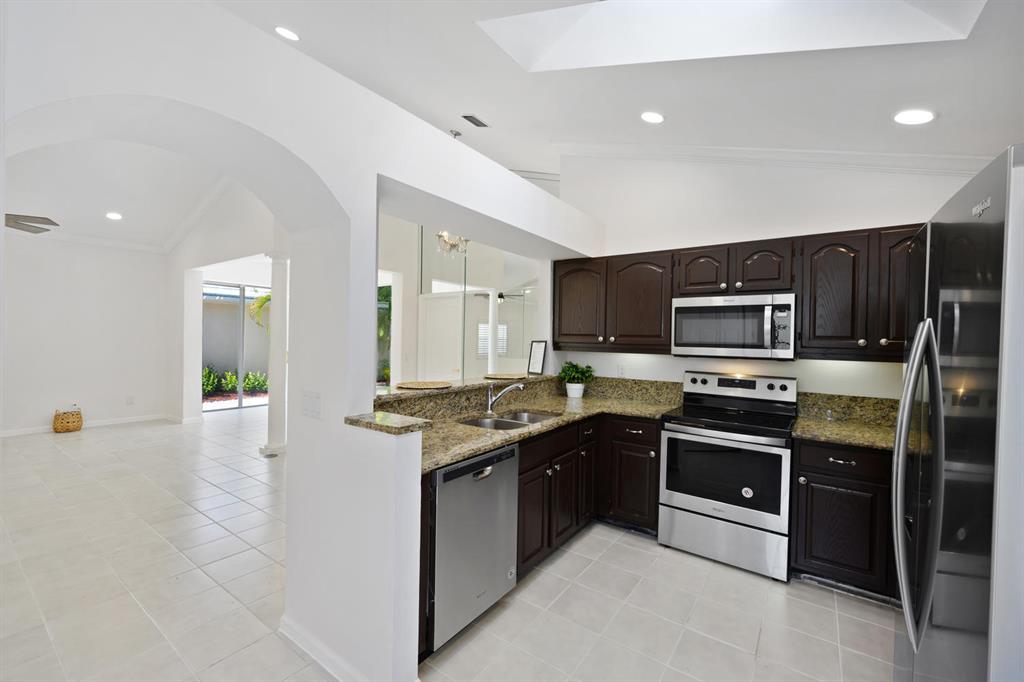 Charming 3 BR, 2 BA home in beautiful BREAKERS WEST! This property is not occupied and can be safely shown virtually or alone in person. Located along golf course, the patio with tropical landscaping is perfect spot for enjoying peace and quiet. Spacious Great Room/Dining Room has vaulted ceilings & lots of natural light. Open Kitchen has granite counters and NEW stainless steel appliances. Freshly painted interior with smooth ceilings & crown molding thru out. Master Suite has vaulted ceilings, wood floors, large walk-in closet & dual sinks. Guest Bedrooms have NEW flooring and one has ensuite bath. Accordion shutters for hurricane protection.