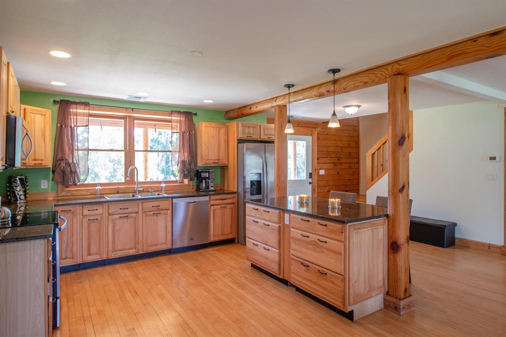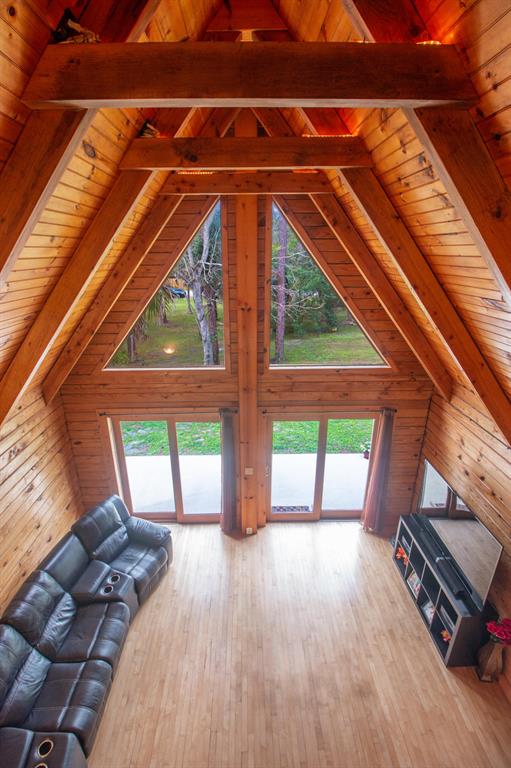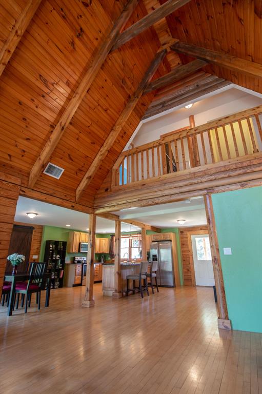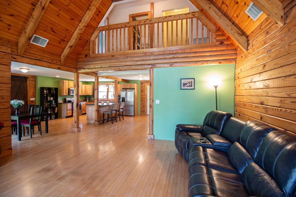 Invitingly relaxed, rustically elegant modern pristine cedar log home. Crested roof ridge opens the home's main living areas to the rafters with many windows and doors that bring in natural light throughout the day and peaceful colorful sunsets at day's end. Upgraded modern kitchen is open to the great room and dining room so that when you have friends and family over, you can visit with everyone. Its unique log construction provides amazing energy-efficient thermal characteristics. The home's sit-a-spell porch also beckons you to enjoy the vast wooded wonderland views and peaceful pond as you listen to the birds singing and the wind rustling the tall foliage around the tranquil pond. These impressive features give this special home a definite wow factor!