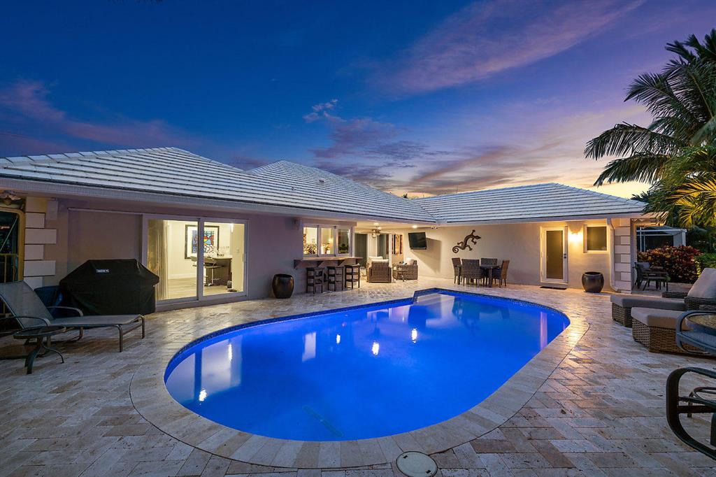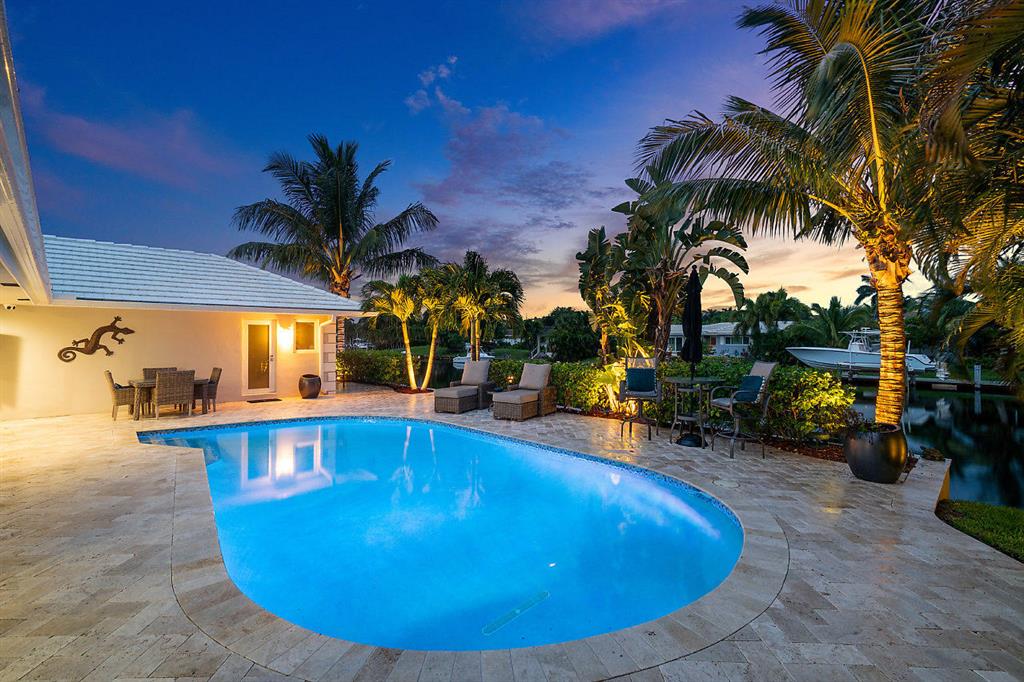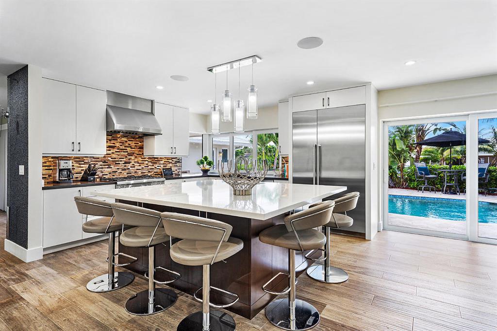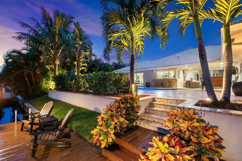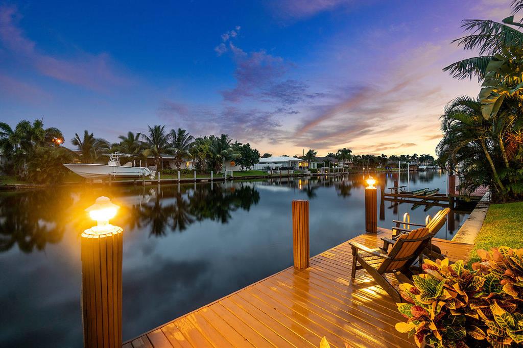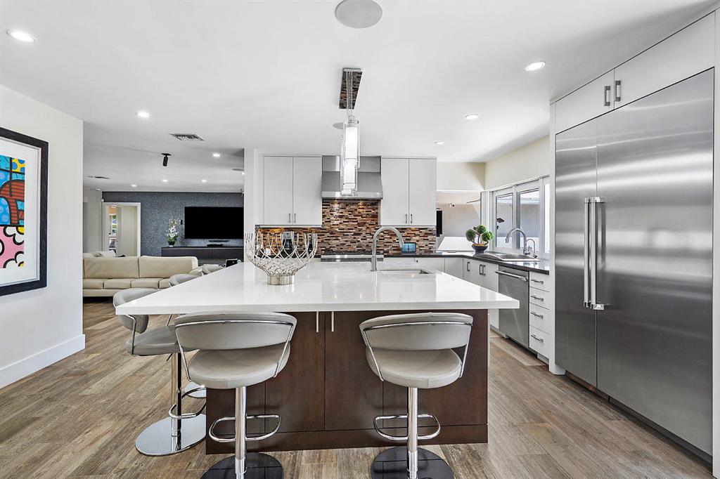 Situated on the most desired canal with ocean access in Camino Gardens, this spectacular home has been modernized throughout with rich finishes and amenities. This waterfront beauty is perfectly sized and features Thermador kitchen appliances with 6 burner gas stove, oversized center island with extra prep sink and white quartz countertops. The owner's suite is FIERCE with a large custom walk-in closet with island, spa bath has floating vanities, accent lighting, big shower with huge rainhead and Jerusalem tile flooring. The rest of the home has wide planked wood-look porcelain tile flooring for a modern coastal vibe. Immerse yourself in sound from the recessed Bose speaker system indoors and out. Enjoy the heated salt pool, LED landscape lights and private dock with electric & water...