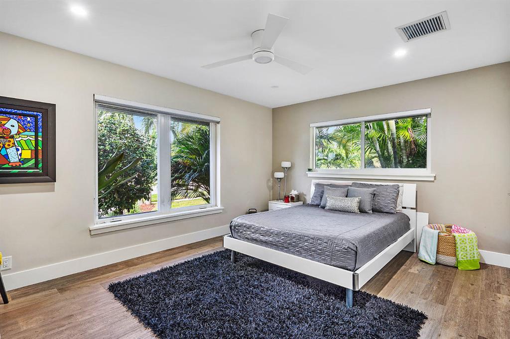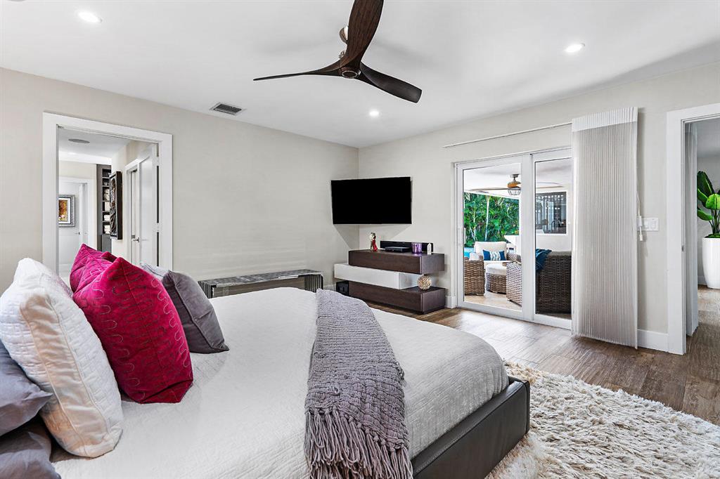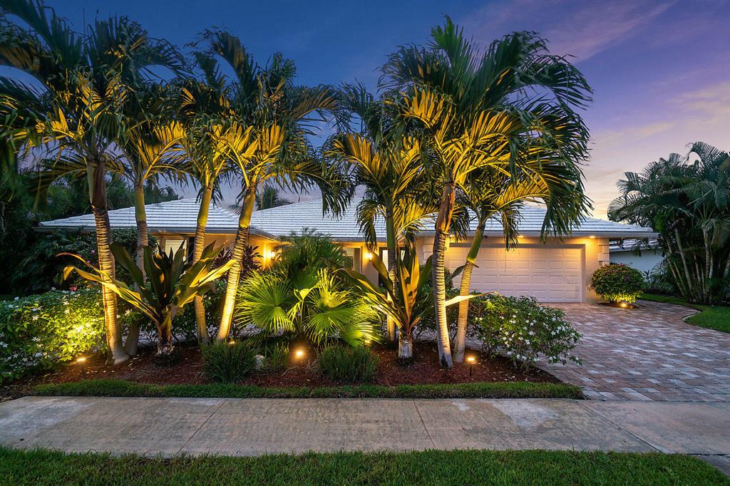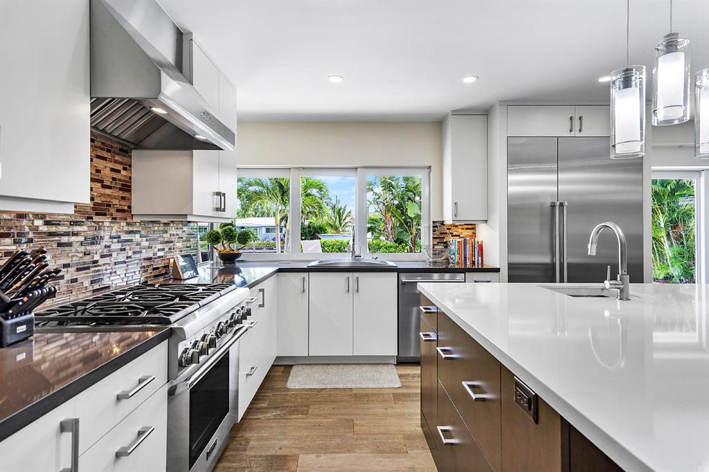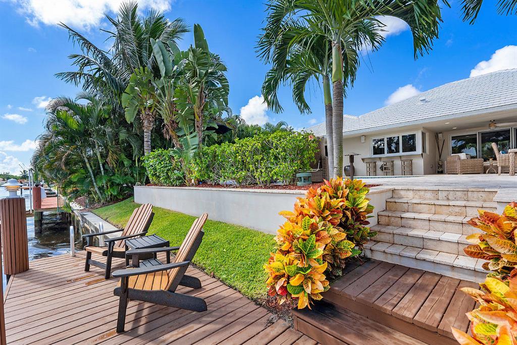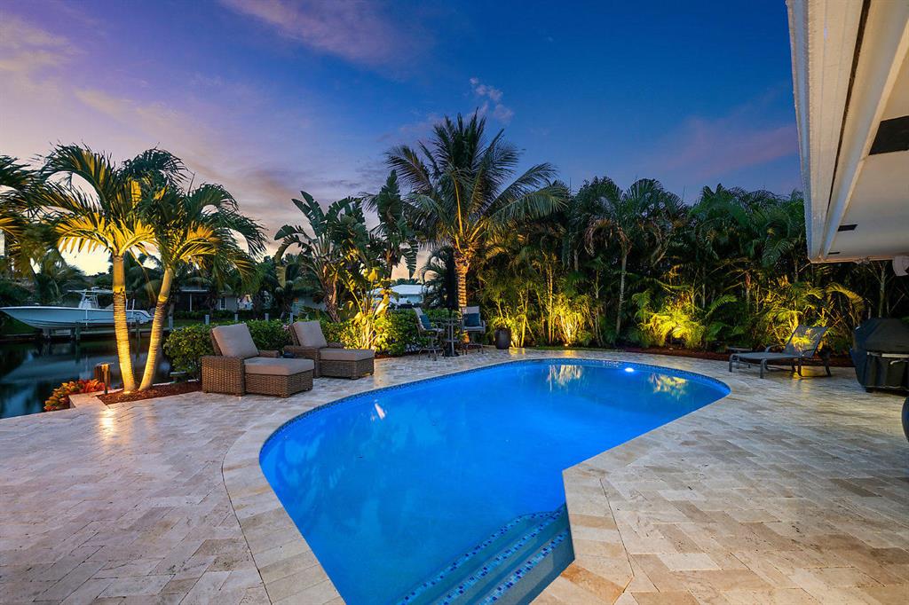 Situated on the most desired canal with ocean access in Camino Gardens, this spectacular home has been modernized throughout with rich finishes and amenities. This waterfront beauty is perfectly sized and features Thermador kitchen appliances with 6 burner gas stove, oversized center island with extra prep sink and white quartz countertops. The owner's suite is FIERCE with a large custom walk-in closet with island, spa bath has floating vanities, accent lighting, big shower with huge rainhead and Jerusalem tile flooring. The rest of the home has wide planked wood-look porcelain tile flooring for a modern coastal vibe. Immerse yourself in sound from the recessed Bose speaker system indoors and out. Enjoy the heated salt pool, LED landscape lights and private dock with electric & water...