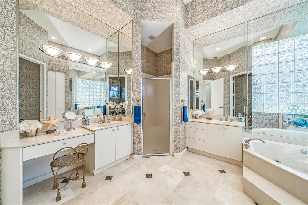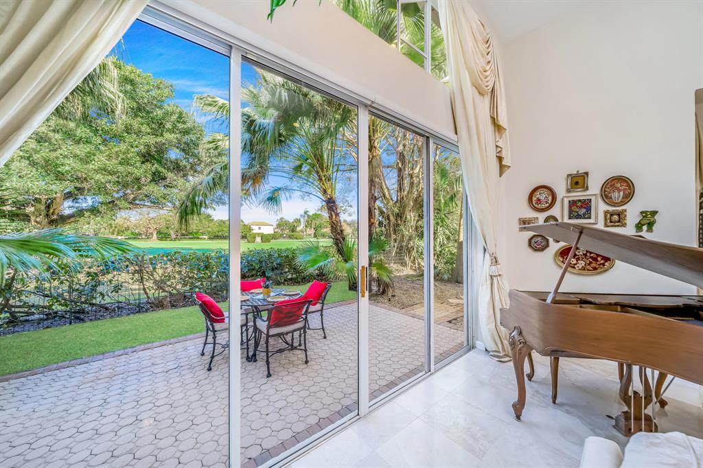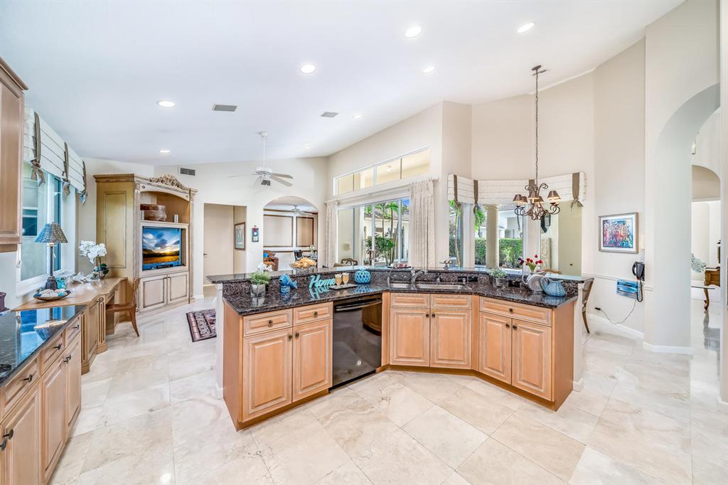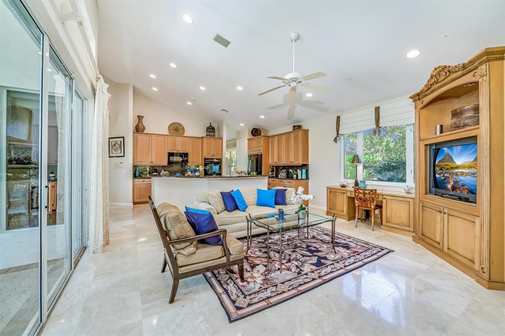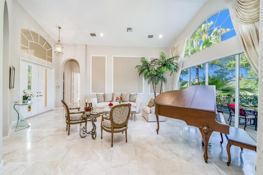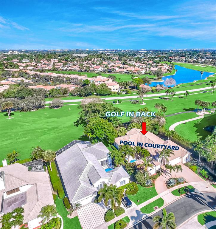 Spectacular Mediterranean One Story Expanded Custom Courtyard Estate Home featuring 3 Bedrooms(1 is in guest house)+Den+Bonus room, 3 1/2 Bath, 2 Car Garage Pool Home on the Golf Course & on a Corner Lot, newest La Corniche home built. Circular driveway, elegant wrought iron double gate which opens up to a wonderful tropical courtyard with secluded sparking pool + covered patio areas with volume high ceilings + separate 1 bed 1 bath guest quarters. This is the highly desired courtyard model but it's been customized & much bigger than the original floor plan. Dramatic entrance w/soaring cathedral ceilings & picturesque walls of windows that flood the inside with natural light. Enjoy the sense of openness, volume, & space. Travertine tile flooring throughout the living areas & wood flooring