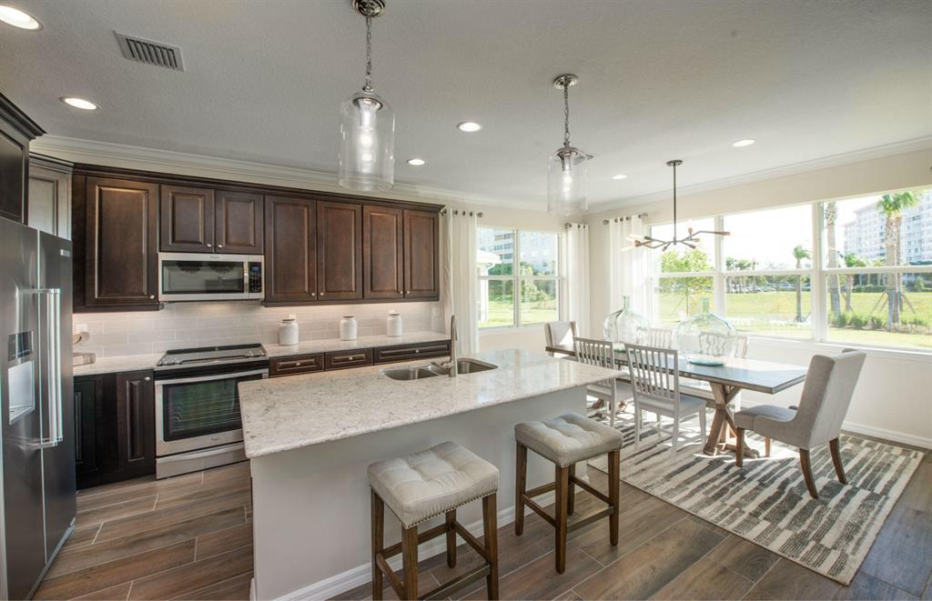 The Sienna at Parkview at Hillcrest maximizes its 2-story design with an open kitchen, naturally lit cafe area, spacious gathering room, and sizable loft. This single family home features impact glass throughout, Desert Silver kitchen countertops, Winstead Maple/Flagstone and Winstead Maple/White Paint kitchen cabinets, Lagoon bathroom countertops, screened-in covered lanai, den option, and more!