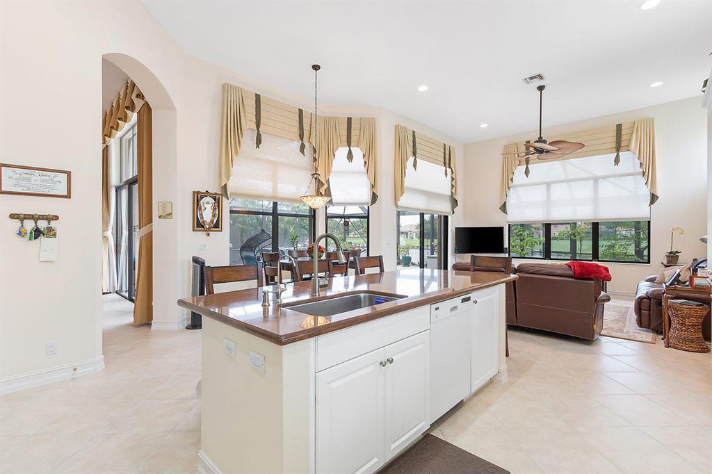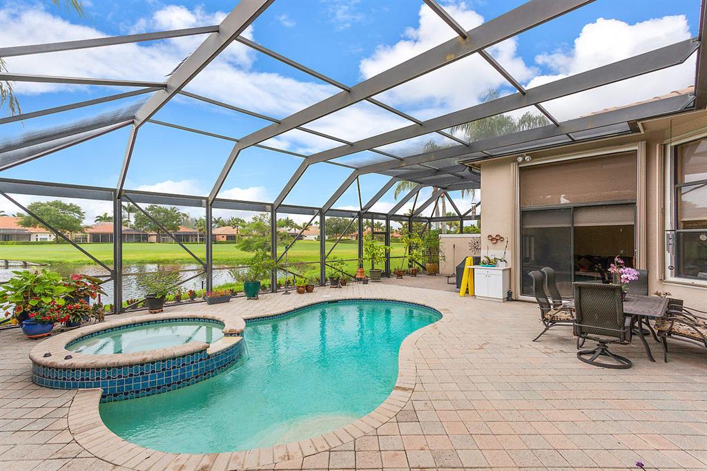 HUGE PRICE DROP!!! Popular ''Alaina'' model with premium Water and Golf vistas. Stunning upgrades and designer touches throughout this 3 Bdrm/3Ba/Den home with 2.5 car garage. Maximum screened area with heated spa, pool & plenty of space for entertaining, grilling, etc. 2 motorized (remote controlled) awnings added 2015. Resurfaced pool & spa with new tiles 2011. Accordion hurricane shutters. Custom landscaping. Neutral floor tile set on diagonal throughout. Upgraded & remodeled kitchen with granite counters, gas range with exhaust & pull-outs. New refrigerator 2017. New water heater 2017. Crown molding, extra hi-hats, office built-in. Very light and bright with neutral colors and window treatments. Private Tradition #3 fairway AND water Views! Fantastic opportunity.