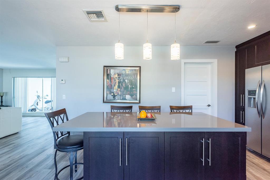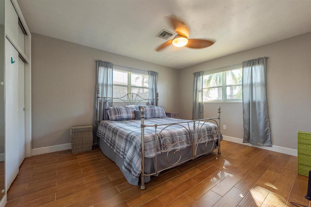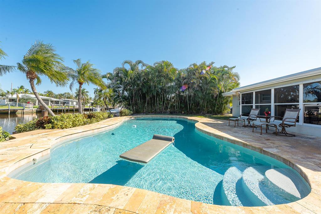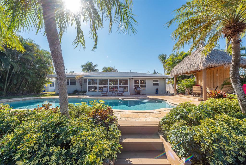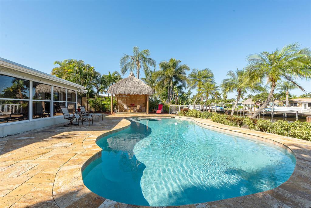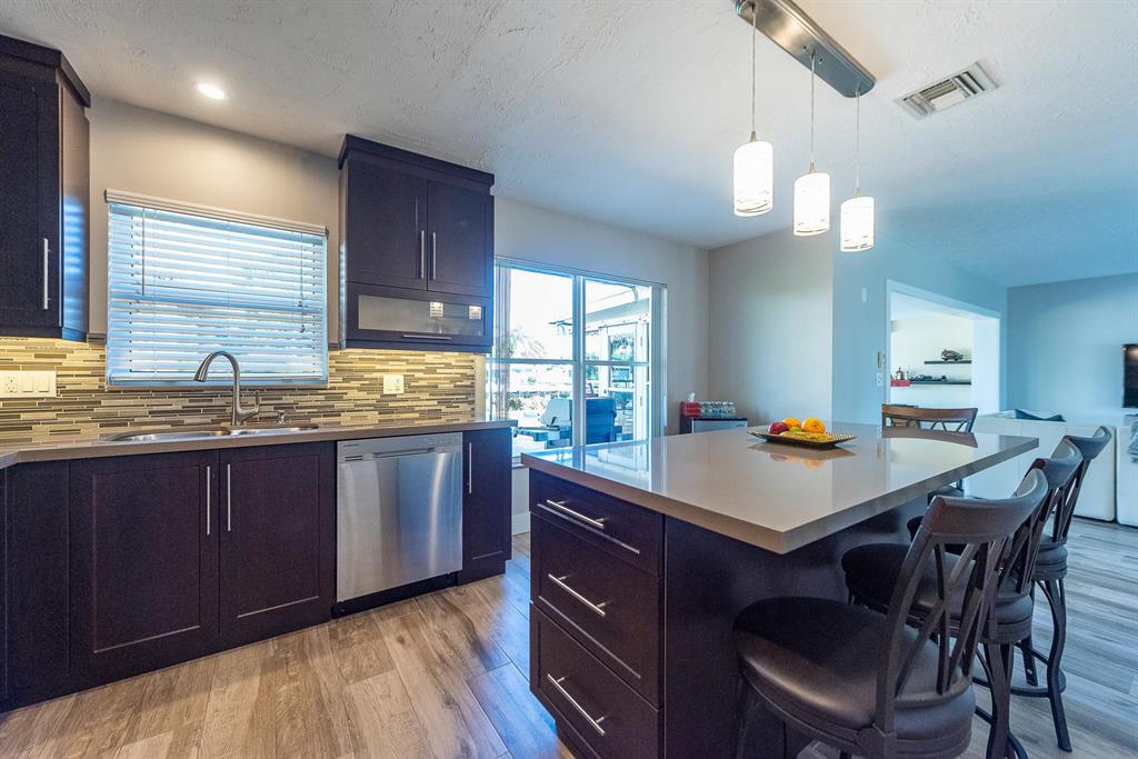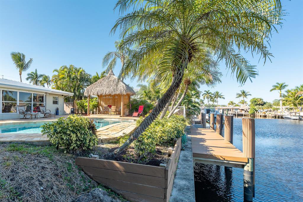 Gorgeous two-bedroom two bath, open floor plan and a two car garage home(3rd bedroom option) in Garden Isles. This home has a circular driveway and is facing South. You are greeted with a slate pathway entering your new home and you can see straight through the large picture window, out to the wide waterway and oversized heated pool. The large Tiki Hut, very spacious backyard and pavered pool area make a great feature for backyard barbeques and entertaining guests. This home has a very warm and inviting vibe to it! The kitchen has been beautifully updated featuring a two-tone quartz breakfast bar.
