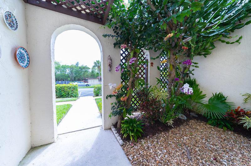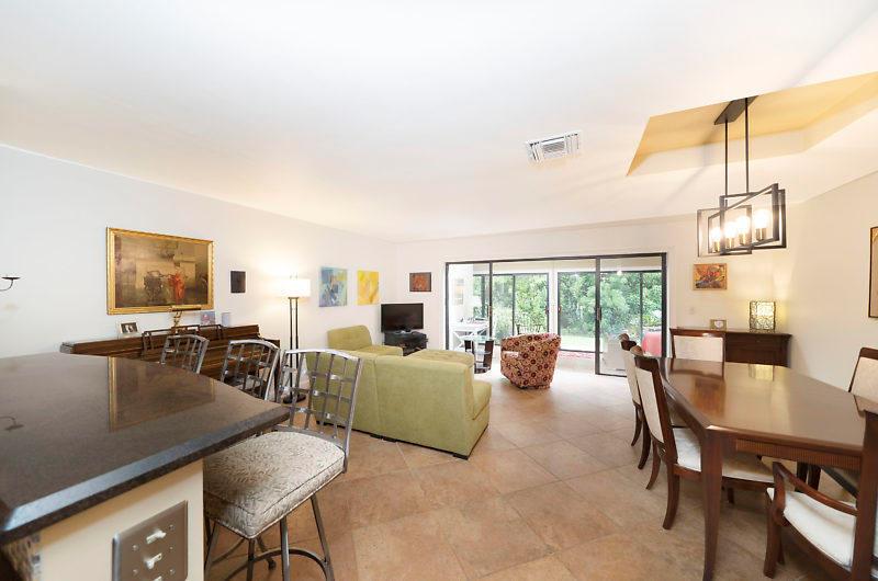 Entering this open-plan townhome through the spectacular ''blooming cactus and orchid'' garden is a treat. Inside your eye is immediately drawn to the unique kitchen island with its ''Indian rainforest'' pattern stone top. The surrounding kitchen is a chef's delight with granite counters, stainless appliances and quality cabinetry plus an inviting peninsula bar to entertain your guests. The open theme continues beyond the kitchen with a tray ceiling living and dining area, then on to the airy sky lit enclosed porch/office with a delightful view of a dedicated green space. Two excellent storage areas and a half bath complete the main floor.Upstairs are two beautifully updated ensuite bedrooms. The guest room receives excellent privacy from the blooming cactus outside the window and it