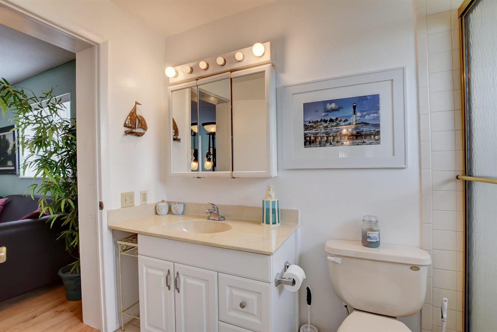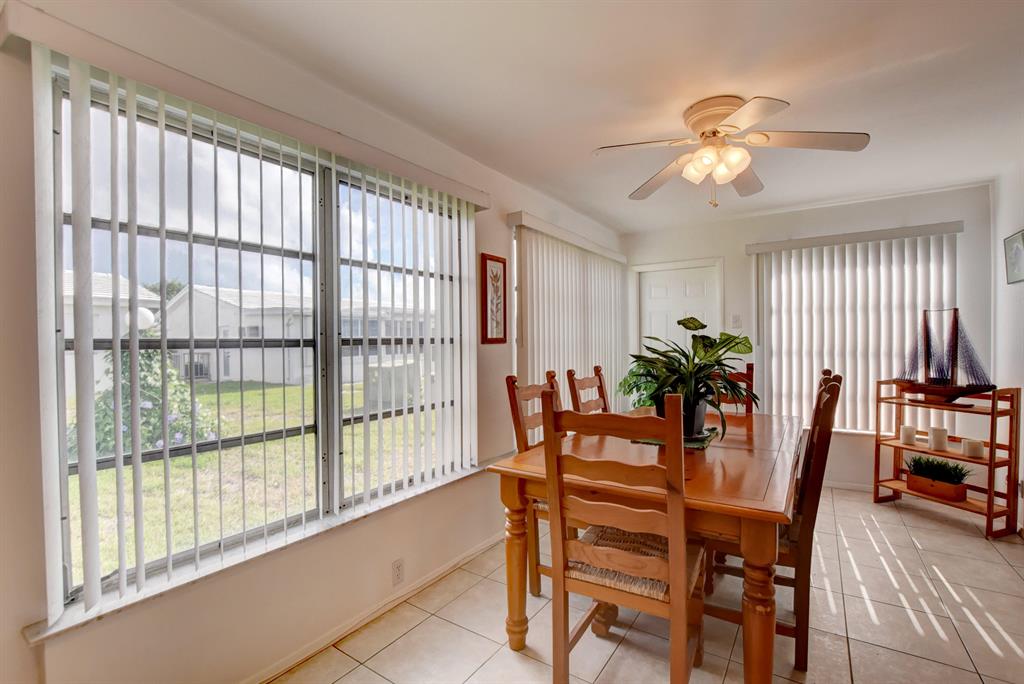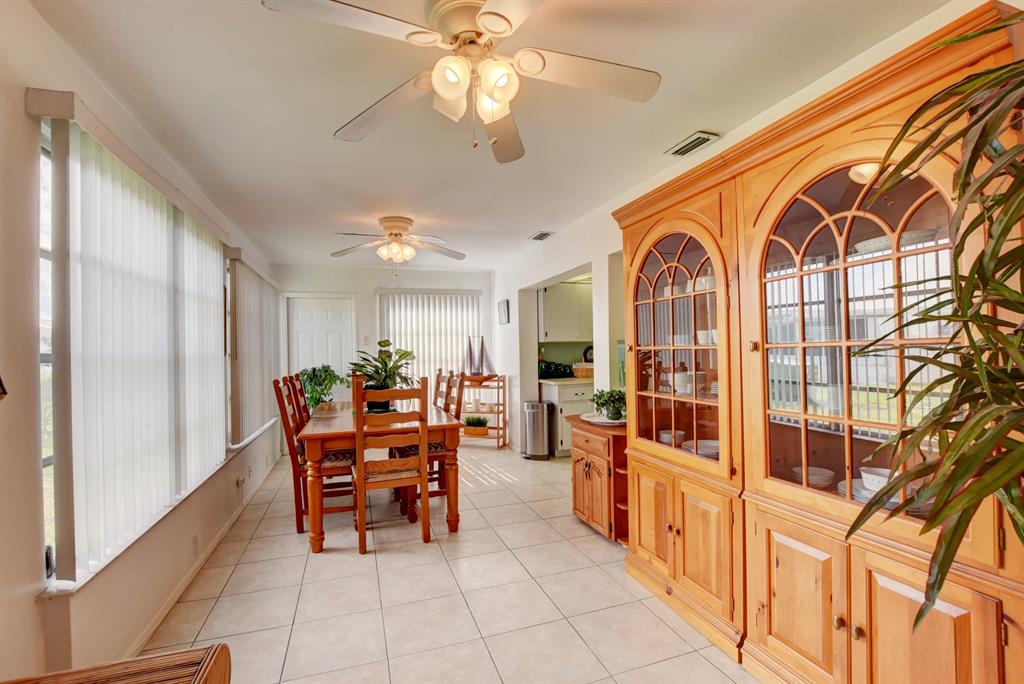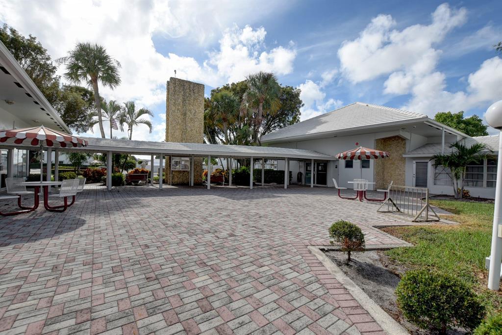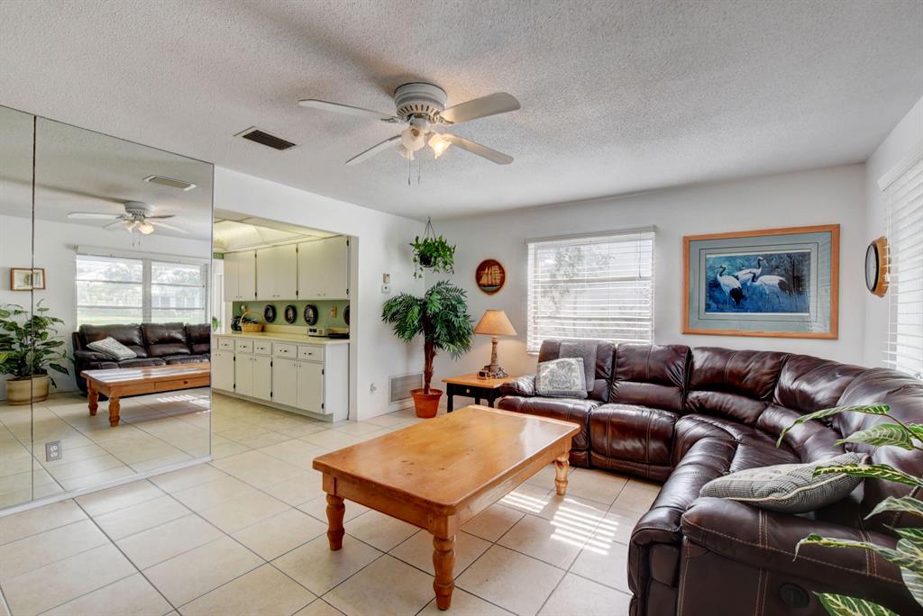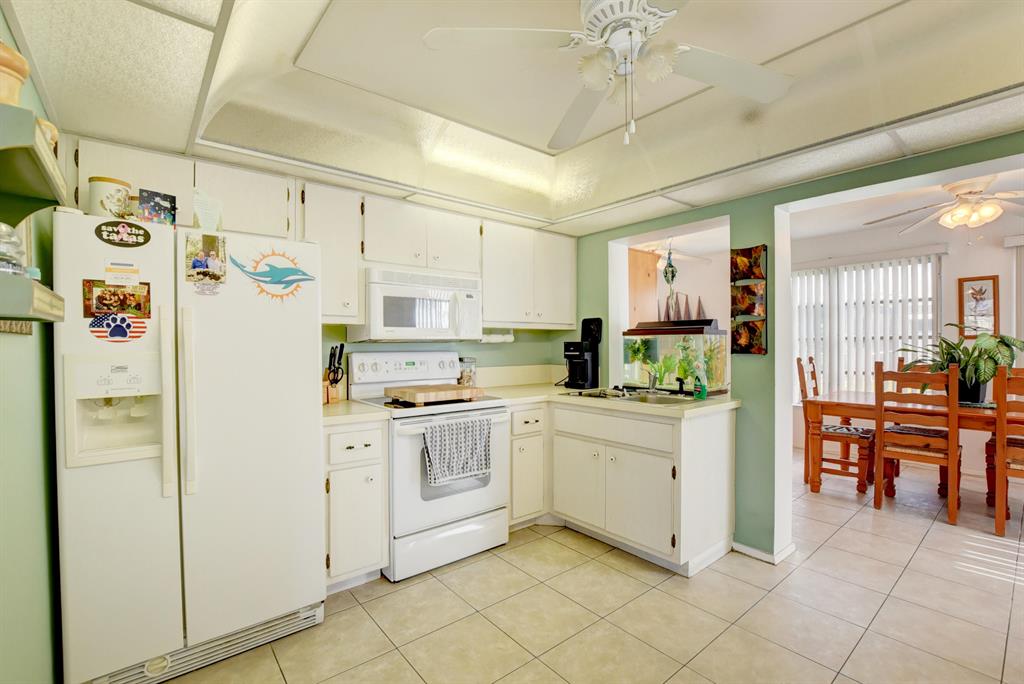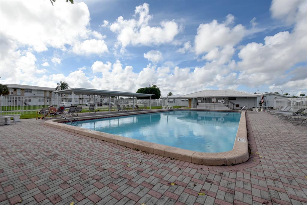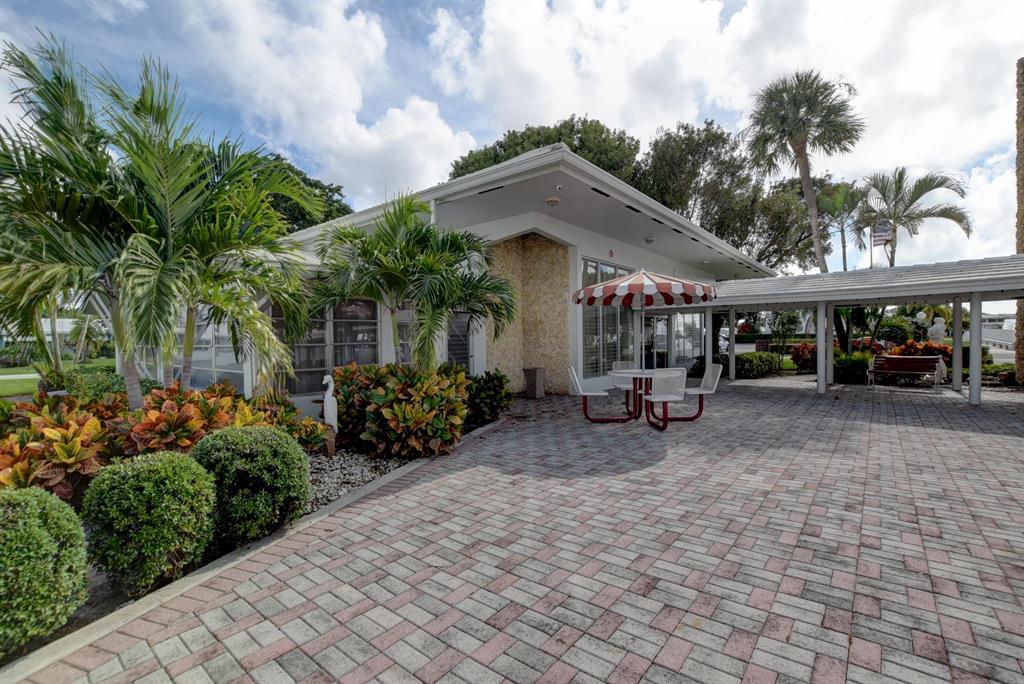 Beautiful 2/2 home with a simple, open floor plan located directly across the street from both the heated, community pool and free golf course in 55+ community. Extra large kitchen, renovated bathrooms, new ceramic tile floors in living areas, wood floor in bedroom. Indoor laundry room. Enclosed Florida Room under air. Accordion hurricane shutters all around. Low monthly fee maintains yard, pool, roof and exterior painting, all water needs, shuttle bus if needed and free golf. No land lease. Close to the beach, restaurants and shops.