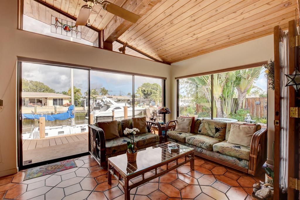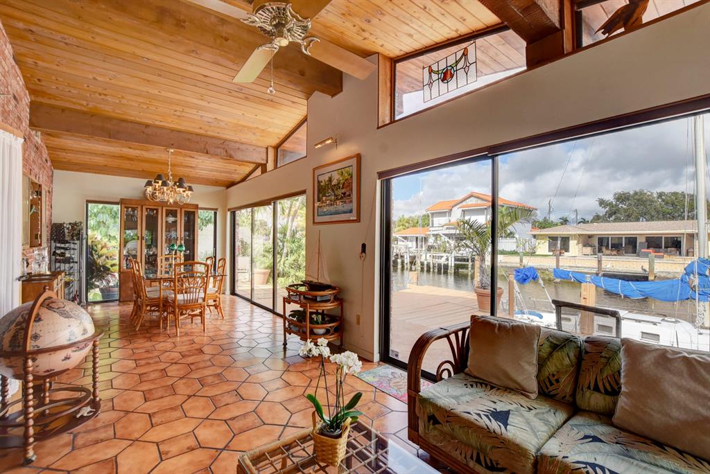 Highly desirable Pompano Isles deepwater front home that has been well maintained and updated over the years. This three bedroom, three bath, two car garage house features include impact windows and storm panels; replaced s-tile roof; open, light and bright Florida room with vaulted, pecky cedar ceilings and sliders overlooking the waterway and spa. The eat-in kitchen offers oak cabinetry and a large walk-in pantry. The large open living room provides views of the water and has a cozy fireplace. Retreat upstairs to the large master bedroom suite. Enjoy the outdoor balcony in the evenings. The master bath provides a large roman tub, dual sinks and seperate shower. This property is minutes to the Hillsboro Inlet, excellent boating, fishing and diving with no fixed bridges.