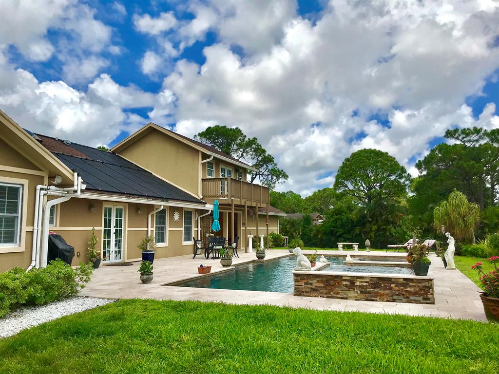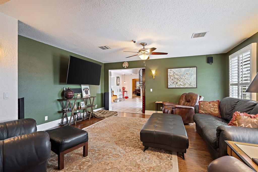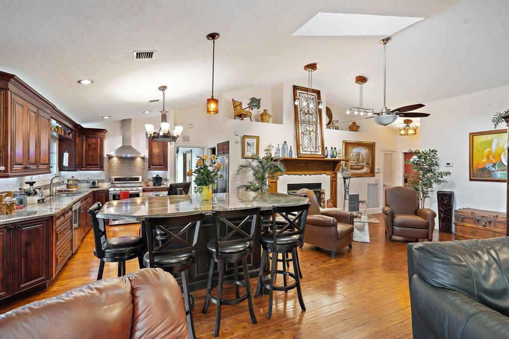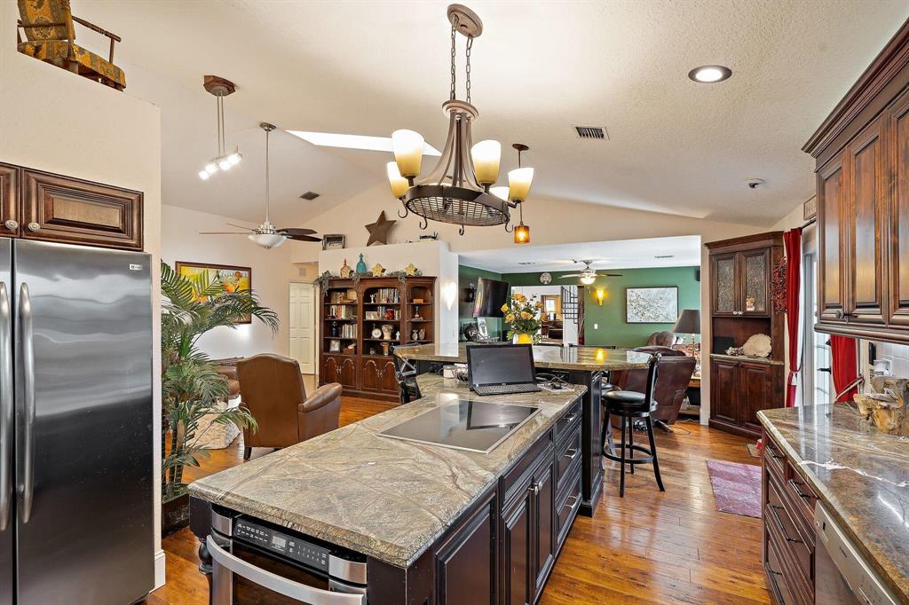 60k reduction! Sellers MUST sell and this is priced right for reasonable offer. Appraisal done 2017 was 599k. The spectacular pool, spa & beach/ water features added by sellers for 60k. Step into the living room w/ fireplace & soaring ceilings. OPEN floor plan looks to the upgraded kitchen,dining area & family room w/ engineered wood floors. Kitchen has both gas & induction cooktops. Two large master suites with tile floors on each side of the home. Next to the family room is a large tiled bonus room w/ sliding doors to a covered porch off the pool. Bonus room( possible dining room) has wide spiral stairs that go to an open loft with a balcony overlooking the pool. Impact glass throughout except1 set of sliders & small decorative window-these have shutters.Most windows have plantati