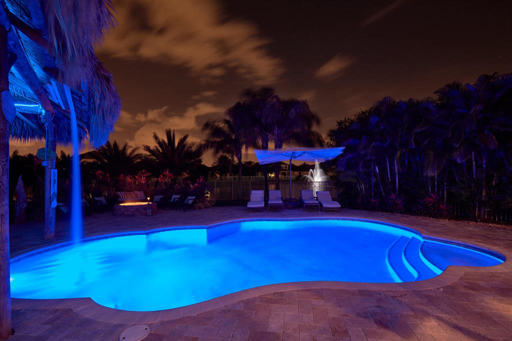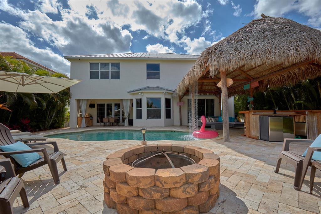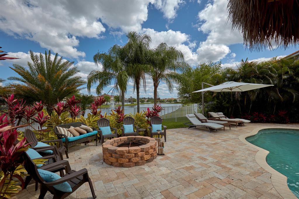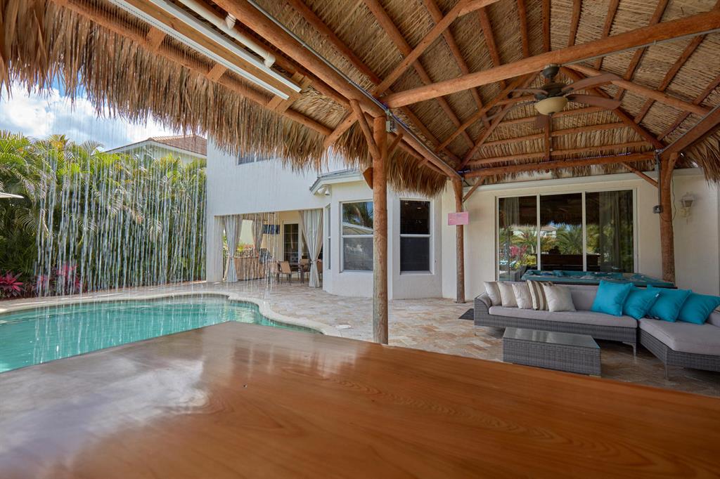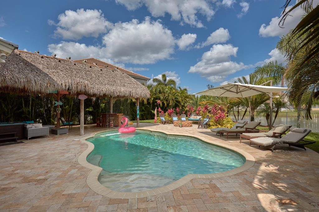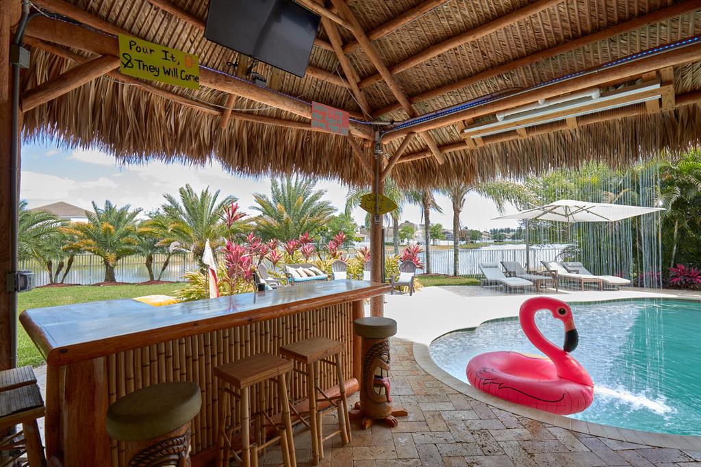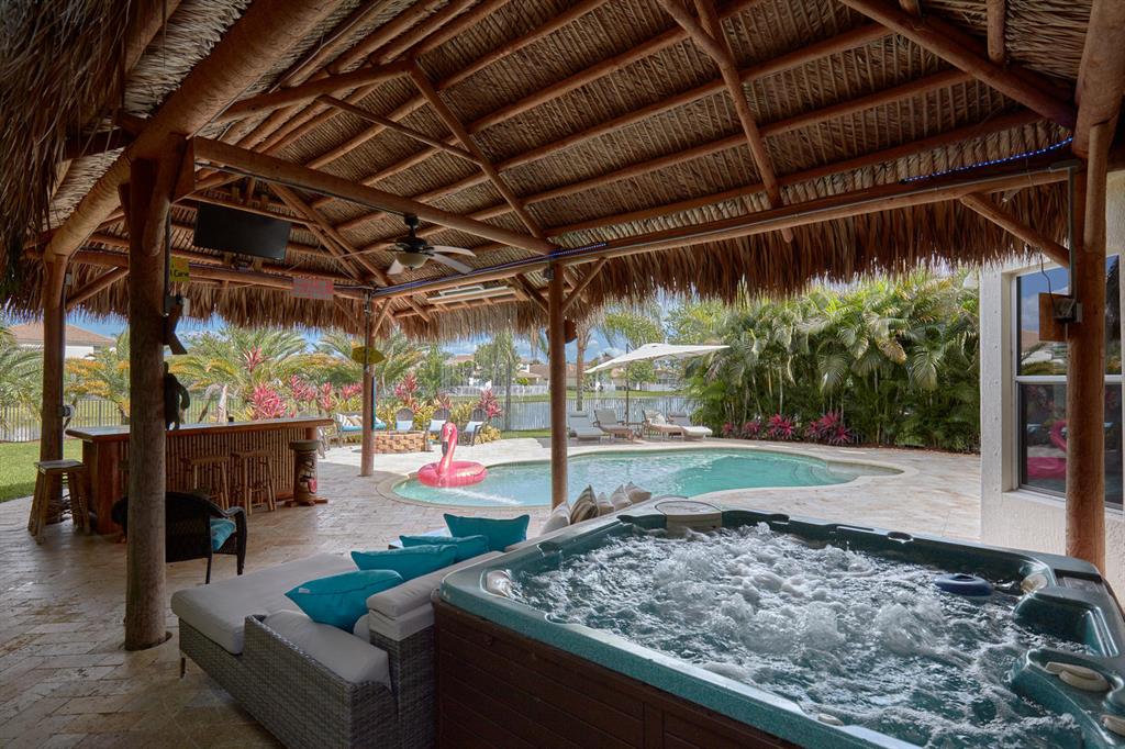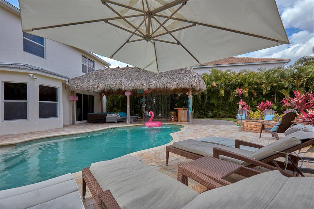 LARGEST LOT IN COMMUNITY .25 ACRES. THE BACK YARD IS A PRIVATE OASIS WITH LUSH LANDSCAPING, A HUGE TIKI HUT WITH CUSTOM TIKI BAR, HOT TUB, LED LIGHTS AND AMAZING WATERFALL FROM THE TOP OF THE TIKI HUT INTO THE POOL. THE HOME ALSO OFFERS A NEWER KITCHEN AND COMPLETELY REMODELED MASTER BATH. THIS HOME IS MOVE IN READY JUST BRING YOUR TOOTH BRUSH. GREAT LOCATION, ''A'' RATED SCHOOLS AND CLOSE PROXIMITY TO WELLINGTON. METAL ROOF, NEW HIGH EFF A/C, SALT WATER POOL, WOOD FLOORS IN MASTER, 3 CAR GARAGE AND OFFERS LARGE OPEN FLOOR PLAN. THERE IS 5 BEDROOMS AND A OFFICE OR NURSERY CONNECTED TO MASTER BEDROOM.