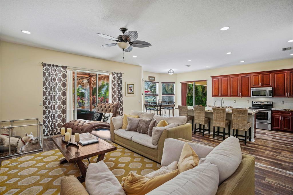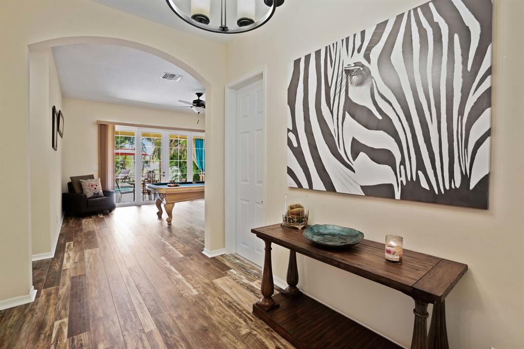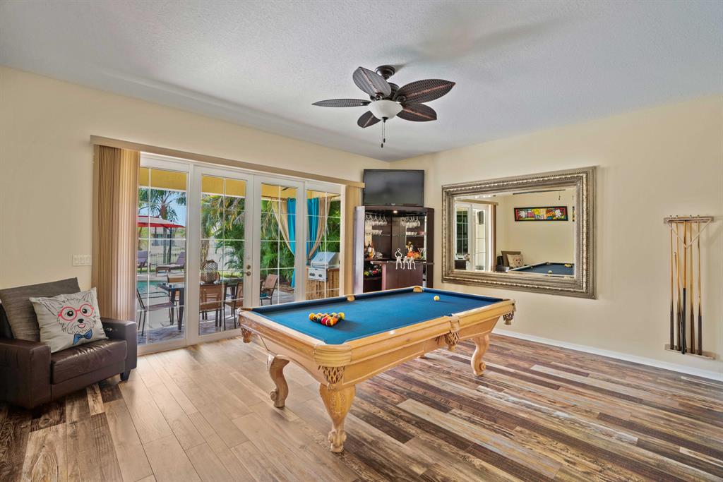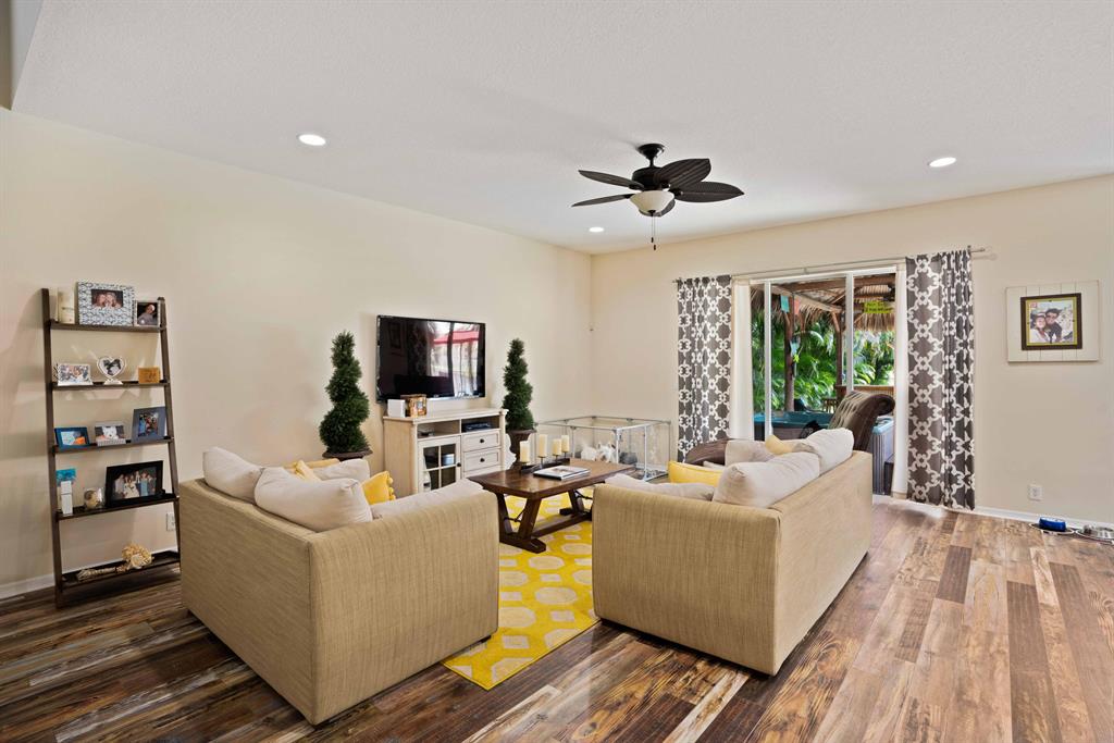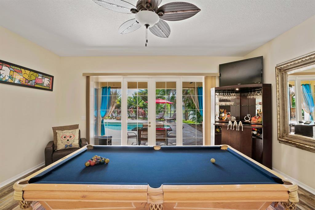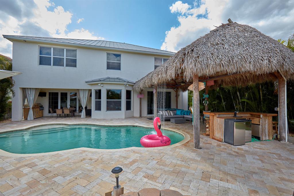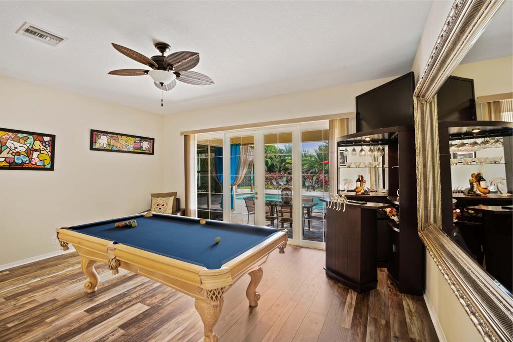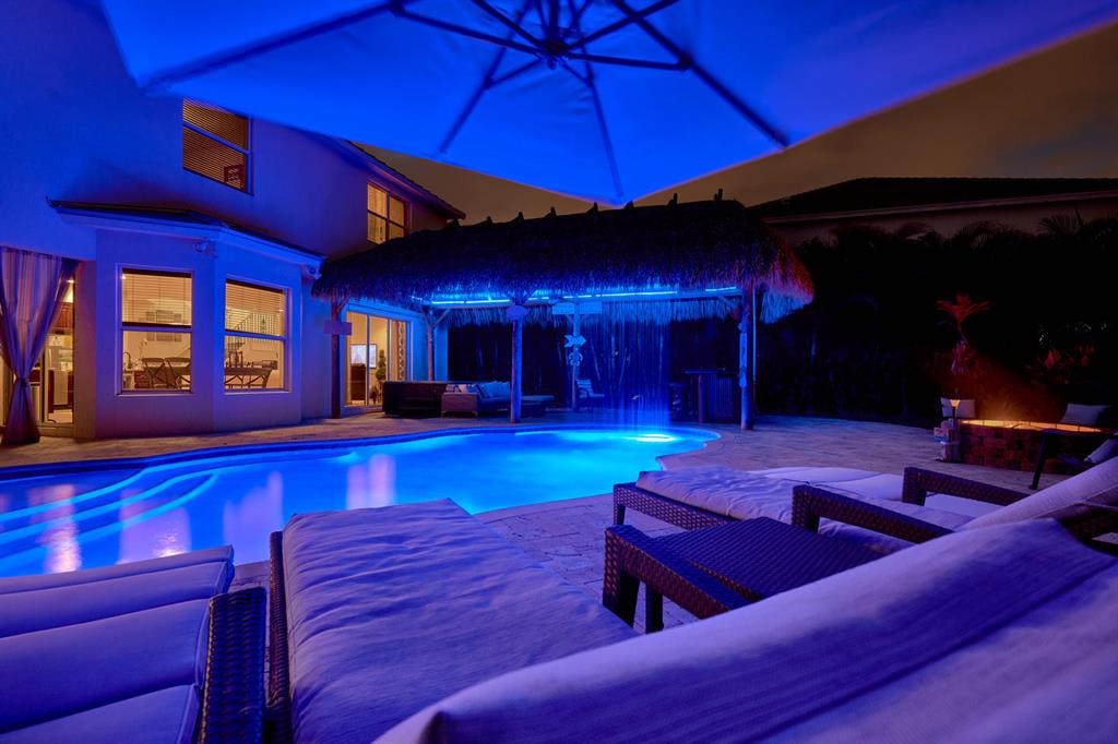 LARGEST LOT IN COMMUNITY .25 ACRES. THE BACK YARD IS A PRIVATE OASIS WITH LUSH LANDSCAPING, A HUGE TIKI HUT WITH CUSTOM TIKI BAR, HOT TUB, LED LIGHTS AND AMAZING WATERFALL FROM THE TOP OF THE TIKI HUT INTO THE POOL. THE HOME ALSO OFFERS A NEWER KITCHEN AND COMPLETELY REMODELED MASTER BATH. THIS HOME IS MOVE IN READY JUST BRING YOUR TOOTH BRUSH. GREAT LOCATION, ''A'' RATED SCHOOLS AND CLOSE PROXIMITY TO WELLINGTON. METAL ROOF, NEW HIGH EFF A/C, SALT WATER POOL, WOOD FLOORS IN MASTER, 3 CAR GARAGE AND OFFERS LARGE OPEN FLOOR PLAN. THERE IS 5 BEDROOMS AND A OFFICE OR NURSERY CONNECTED TO MASTER BEDROOM.