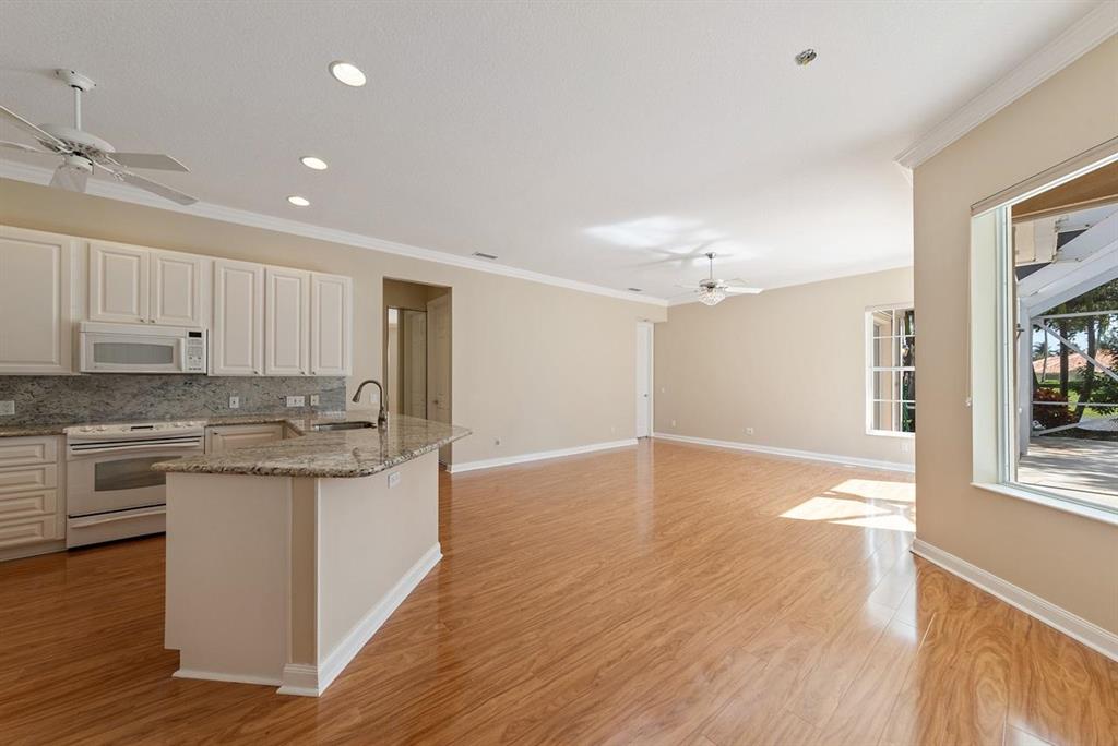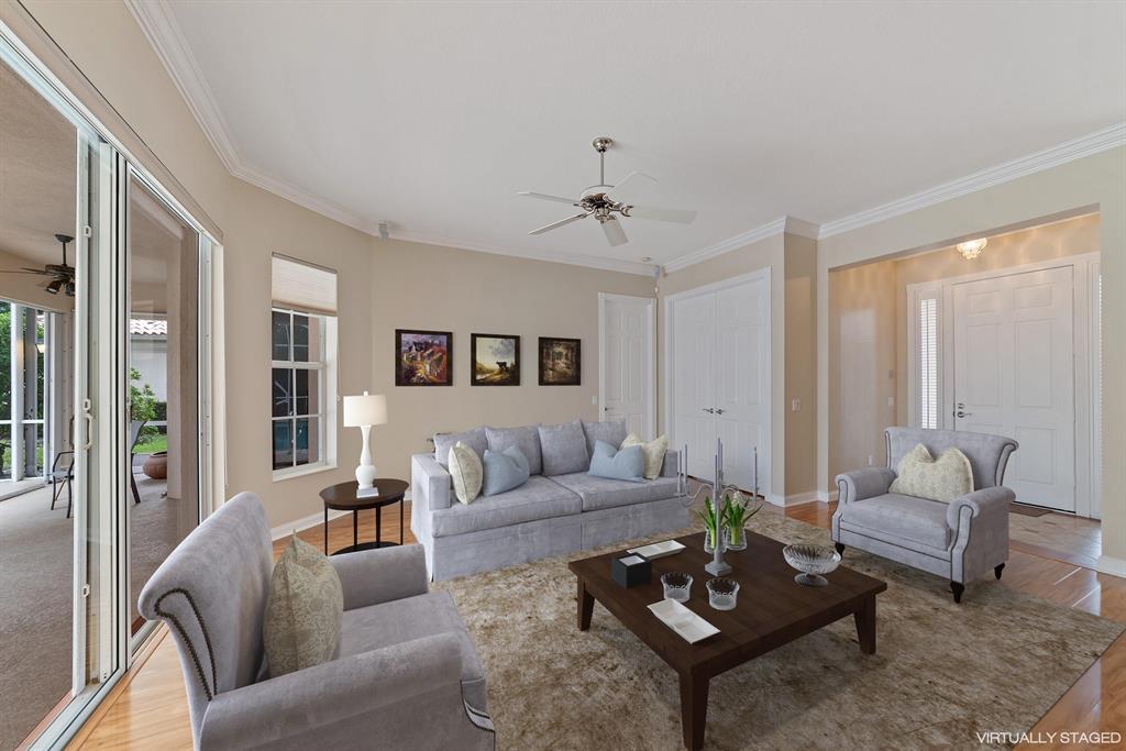 Truly Unique 4 Bedroom, 3 Bath Windsor Model in RiverWalk,, A 24 hour 5 Star Resort Style Manned Gated Community! This Jewel is Set on a Lush Tropically Landscaped Lot with Incomparable Views of 2 Lakes! This is Just the Beginning! There is also a Screened Swimming Pool with the same Views! All 15 Minutes to Everything that is Great About Palm Beach County! From the Screened Entry that Leads to the Designer Tile Foyer, to The Living Room with Stunning Faux Hardwood Floors, Sliders to the Lanai & Pool, the Separate Formal Dining Room & the Stunning Unique Library, This is an Exceptional Residence! The Faux Hardwood Floors continue through to the Updated Kitchen, which is the Hub for Casual Entertaining & Everyday Living that has Newer Granite Counter Tops, a Newer Decorative Tile Back