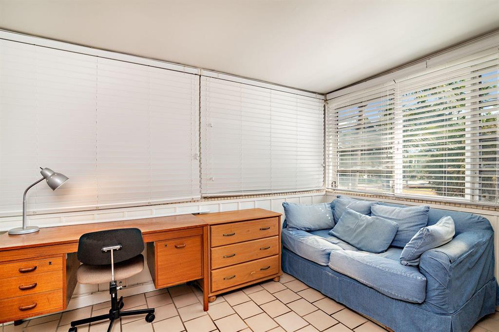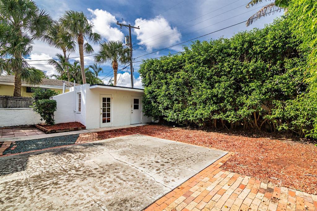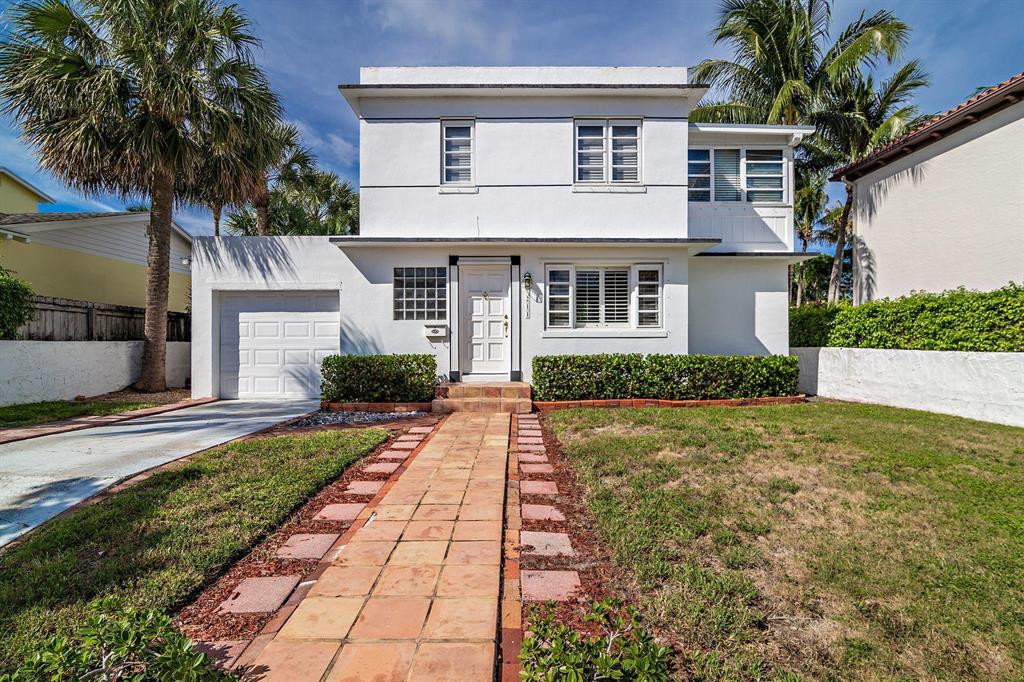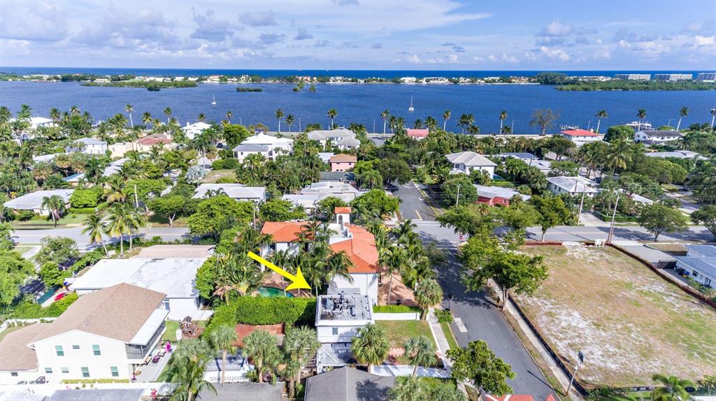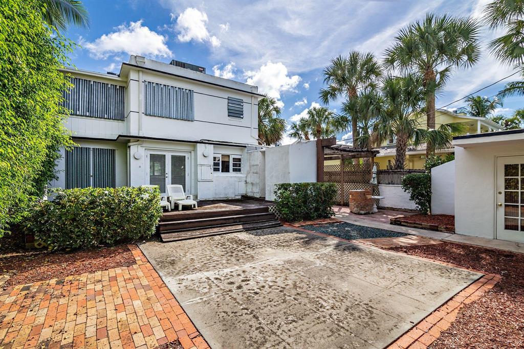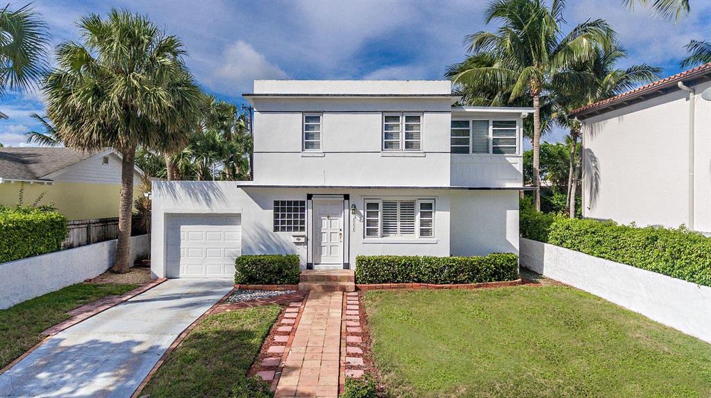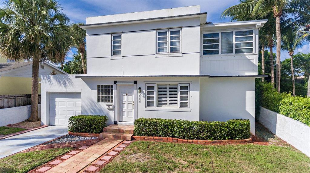 South of Southern, 2 or 3 bedroom, 2 bath residence shines with Art Deco details & Mid-Century Modern charm. Built on an elevated lot & East of Olive! Vintage style with linear & modernistic details. Glass block window & original hardwood floors flow through the open living & dining rooms into a downstairs den/office/bedroom. French doors lead to a large deck, second bathroom & spacious yard with room for a pool. The kitchen has custom wood cabinets, granite counter-tops, double bowl white enamel sink & matching appliances plus a pantry! Upstairs are two bedrooms, bath & generous sun room off the master. Detached building with laundry & storage. This home is ready to be shined back to perfection. Open the front door & enjoy the Intracoastal view down the street from this great location