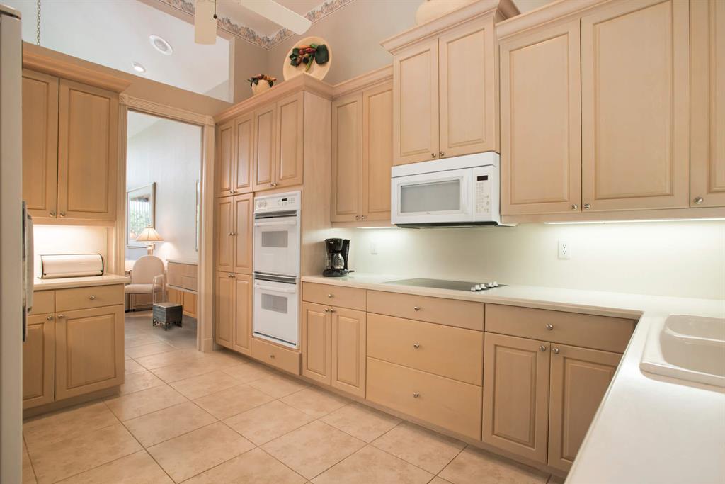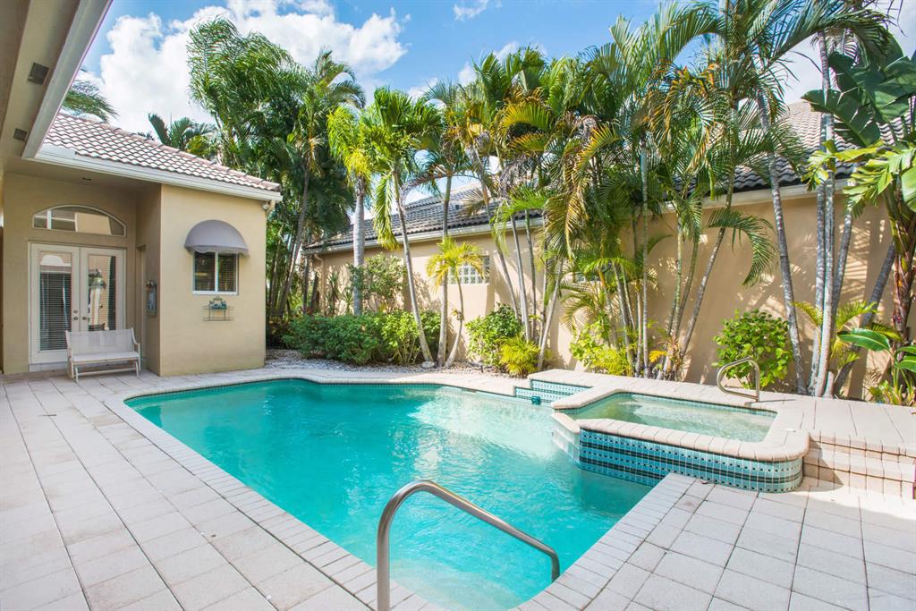 Builder enhanced beautiful courtyard home with heated pool and spa great for enjoying the tropical, sunny weather. Master plus three bedrooms in the main house. Private guest house features new carpet, wet bar and private bathroom. Downstairs master bedroom showcases hard to find his and her separate bathrooms and large built out closet. Door screens make for enjoyable indoor//outdoor living. Home is light and airy and in immaculate condition. Builder added 2 car plus separate golf cart garage... rare for this model.