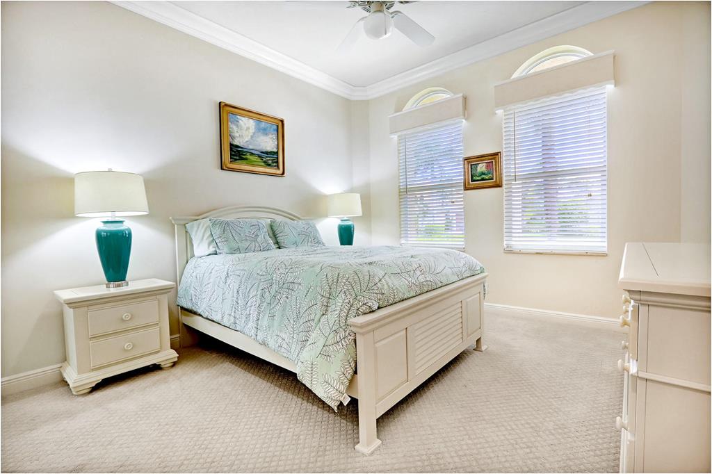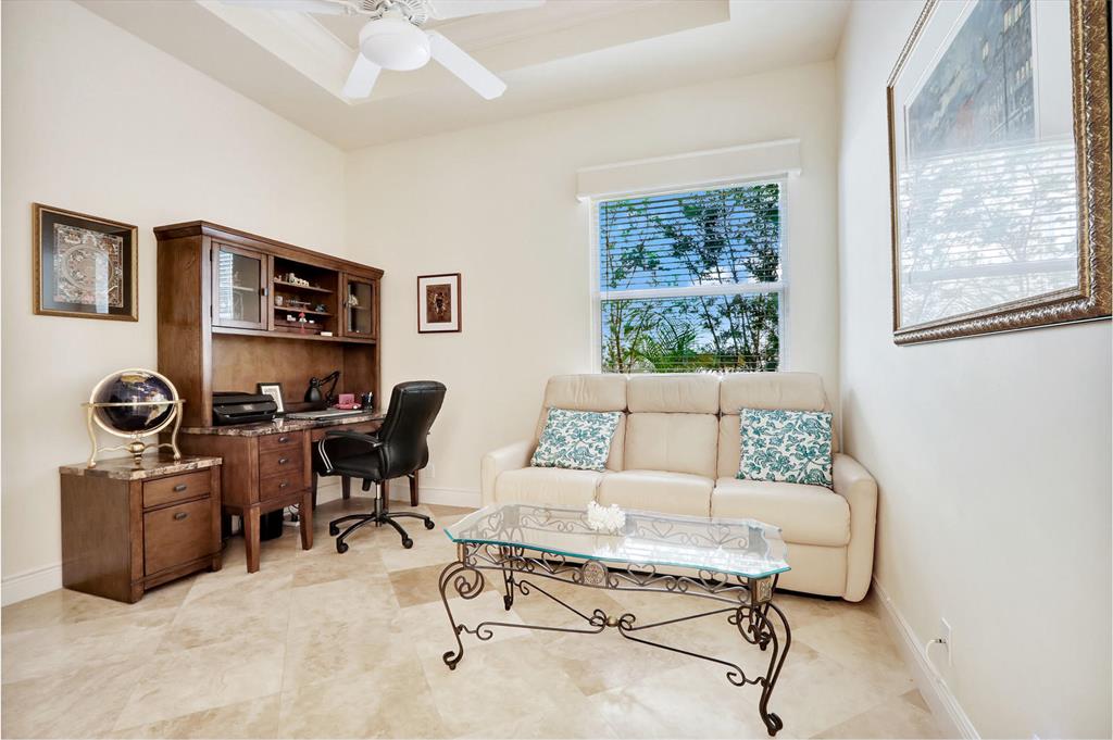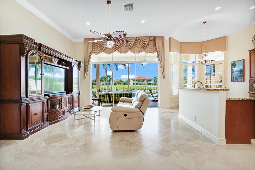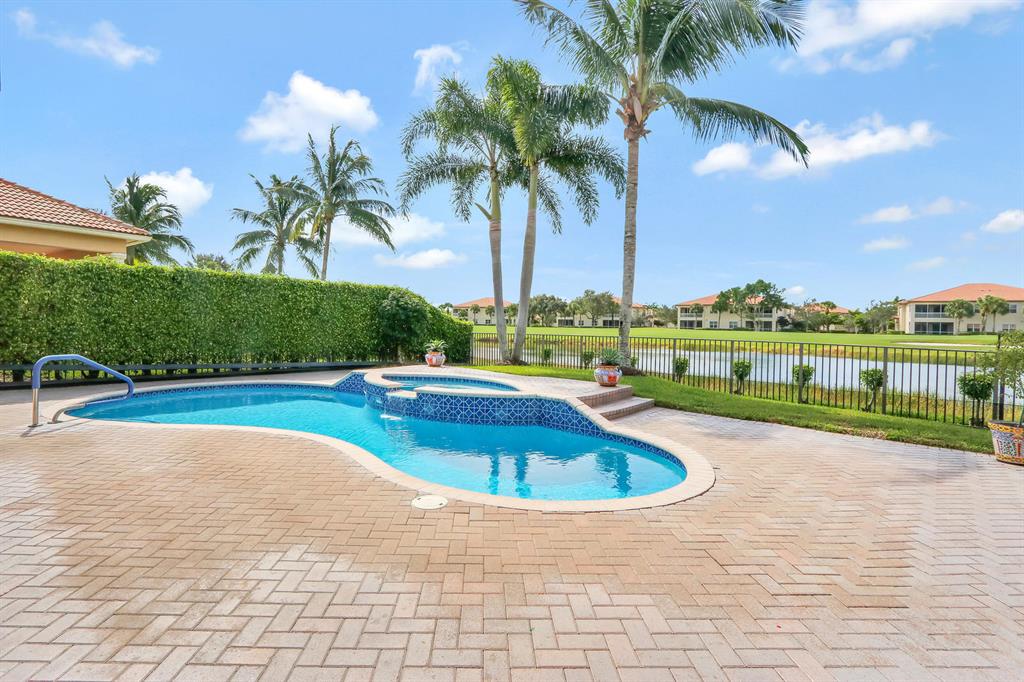 Located on a premium water and golf cul-de-sac lot, this impeccable and upgraded home boasts an ideal Southern exposure overlooking the 8th hole of the Tradition Course. IMPACT GLASS & Accordian shutters! The pristine marble floors are set on the diagonal with a gorgeous high gloss finish. With more than $60,000 in recent renovations, this home is fully upgraded and move-in perfect. The open kitchen features new stainless appliances ($9500), granite counters and handsome cabinetry. Pool was completely renovated in 2018 and has variable speed pump, salt cell, LED lights, automatic valves, jetted spa with waterfall; all run on iPhone App. 12-foot ceiling throughout 16 foot in foyer,