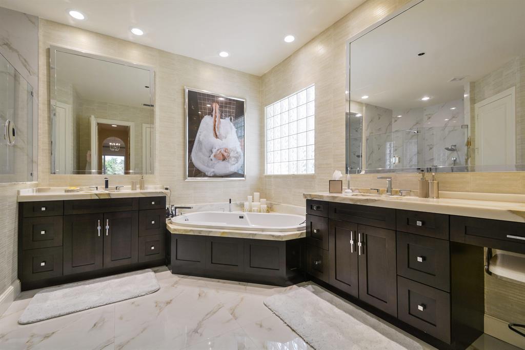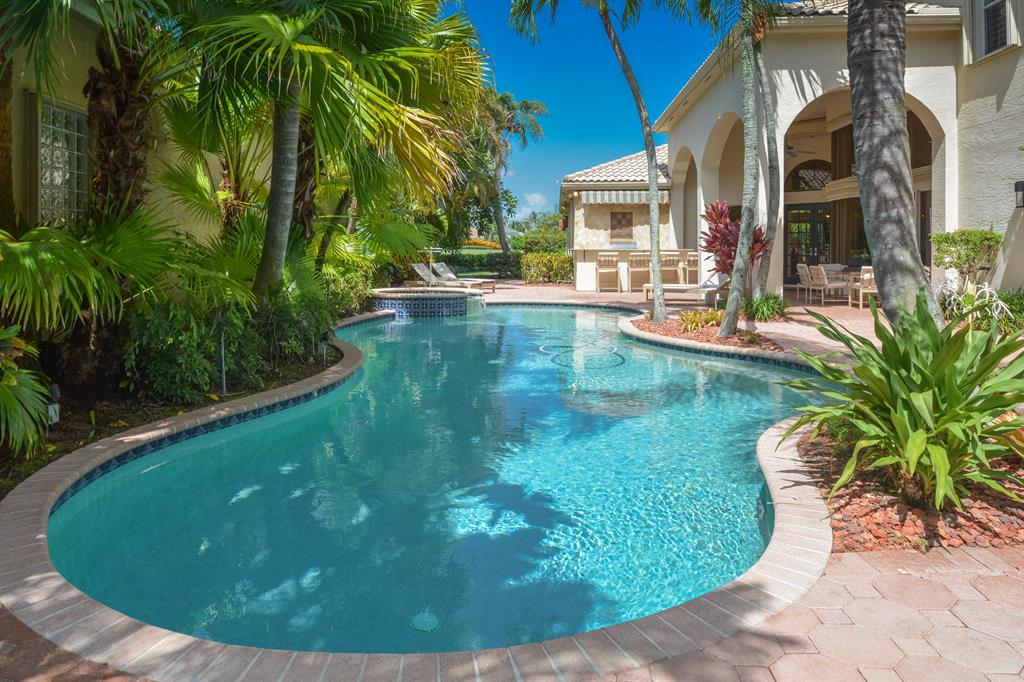 Stunning golf and lake views from this two-story courtyard estate. Situated on a private corner lot offering 5 bedrooms,4.5 baths + office & loft in the main house and a separate 1 BR, 1 bath guesthouse. This light & bright home features a newer modern kitchen with white cabinets and quartz counters, stainless steel appliances, and cook island. Master bathroom and powder room are beautifully redone. Amazing summer kitchen with retractable awning, private pool & spa, and lush landscaping in the courtyard. Large screened-in patio off the living room overlooking the golf course and lake. Over-sized 2 car garage with long driveway that can fit up to 10 cars. Additional upgrades include 4 zone A/C with all units replaced in 2018 & 2016, newer water heater, and full house hurricane protection.