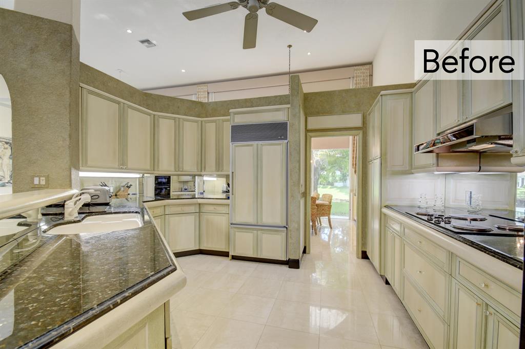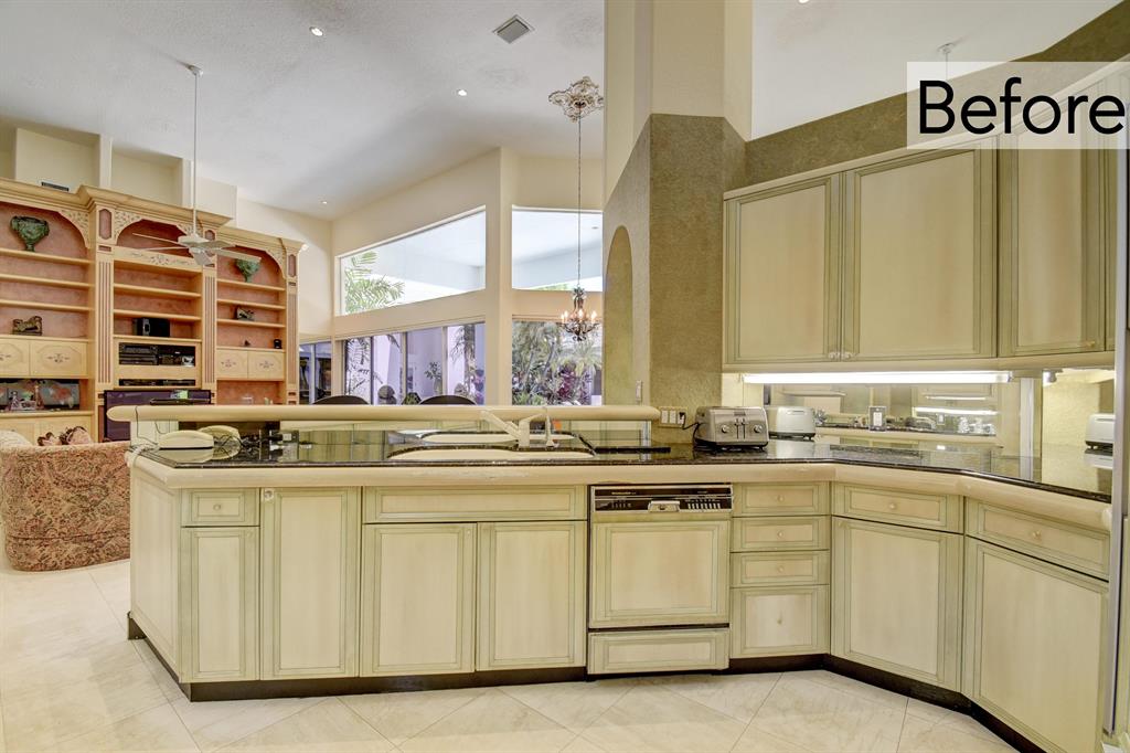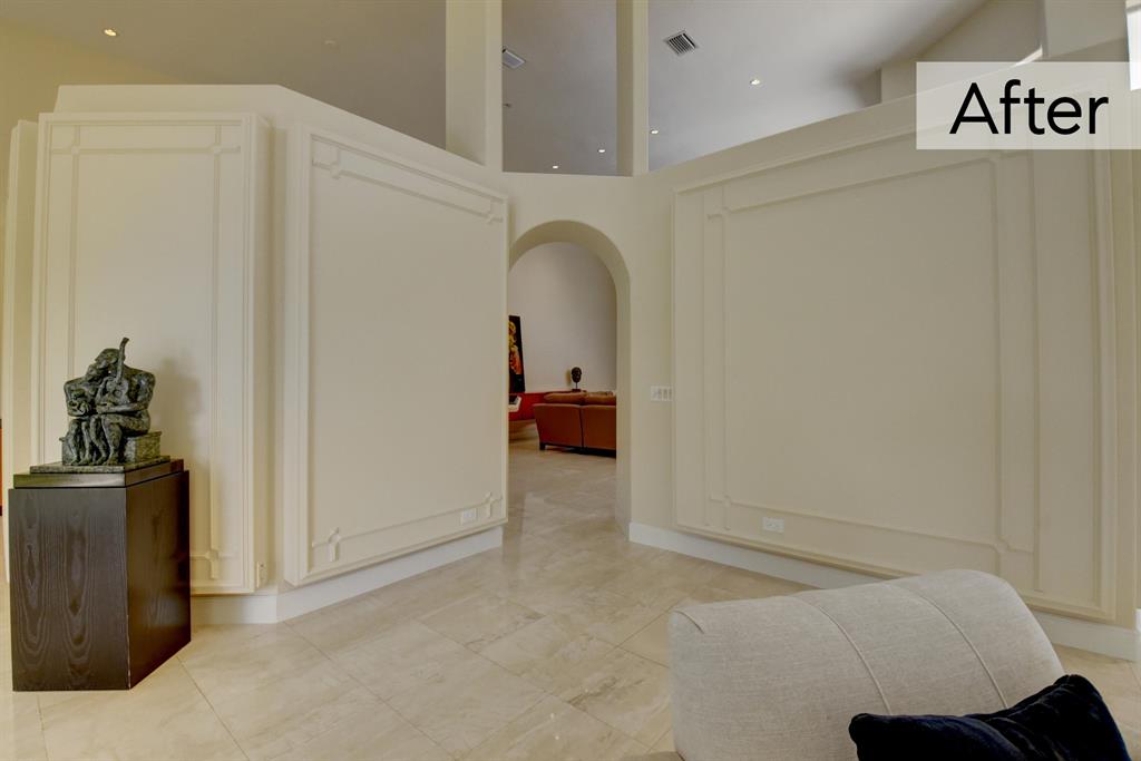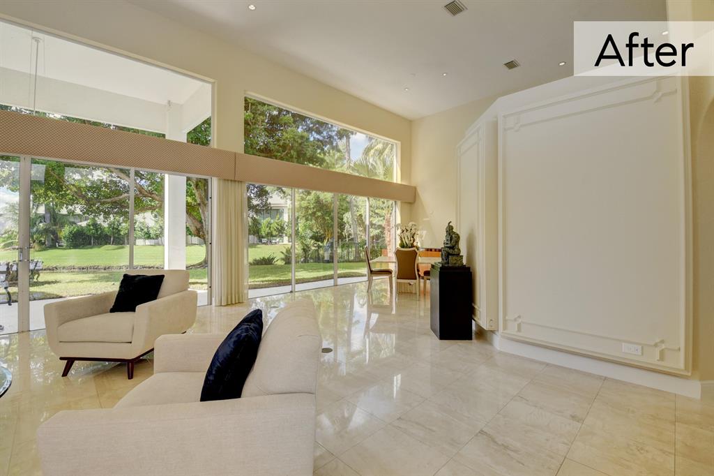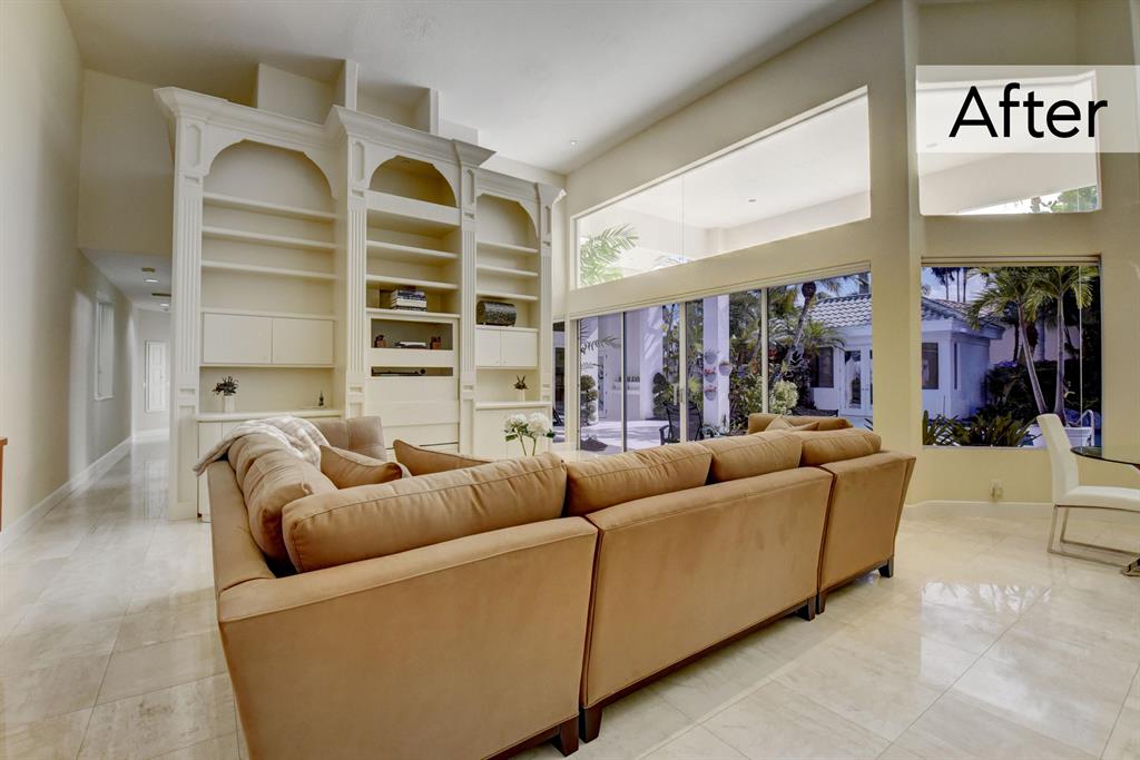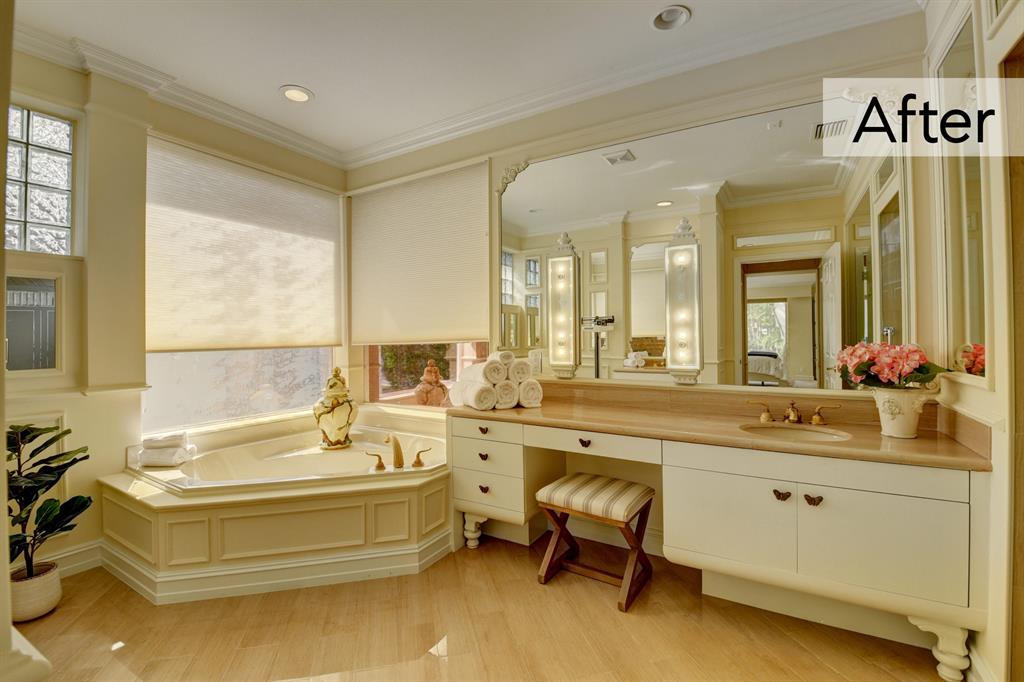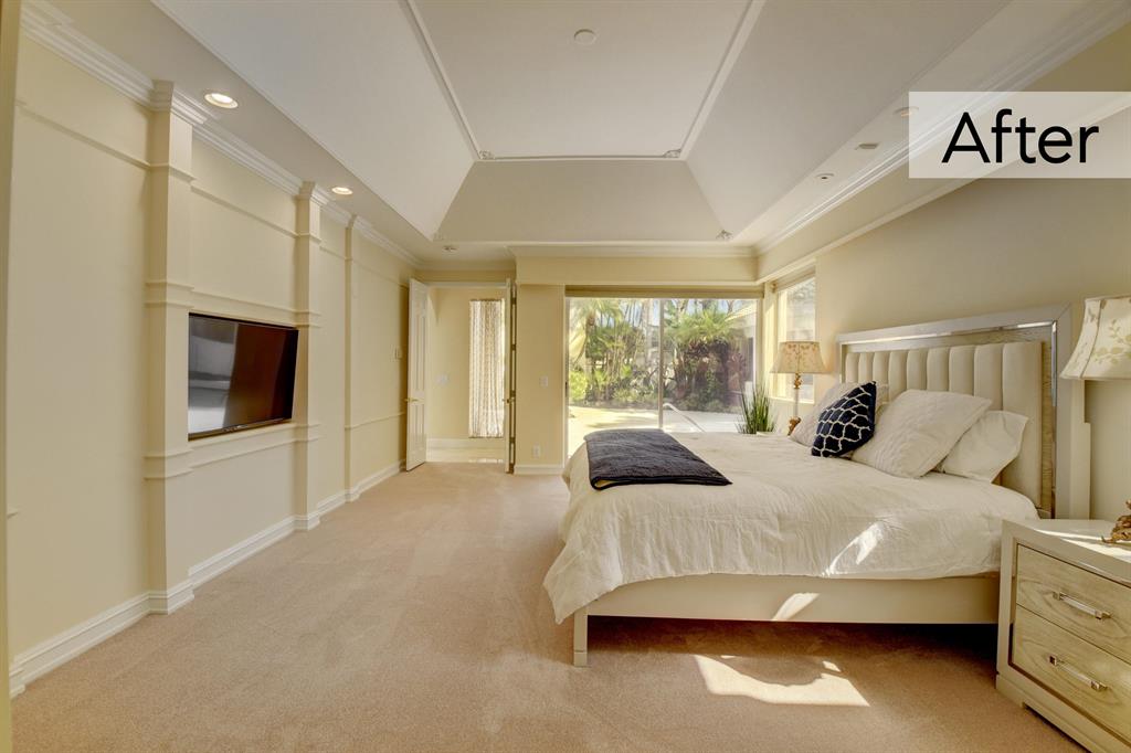 The following renovations have been done to the home Exterior trim & fascia painted; Driveway & courtyard power washed; Landscaping throughout; Living room divider wall painted; Curtains removed; Master bedroom painted and new carpet; Master bath cabinets painted; Kitchen virtually staged only; Family room built in wall unit painted; Guest room new carpet; Furniture staging has also been done throughout the home.